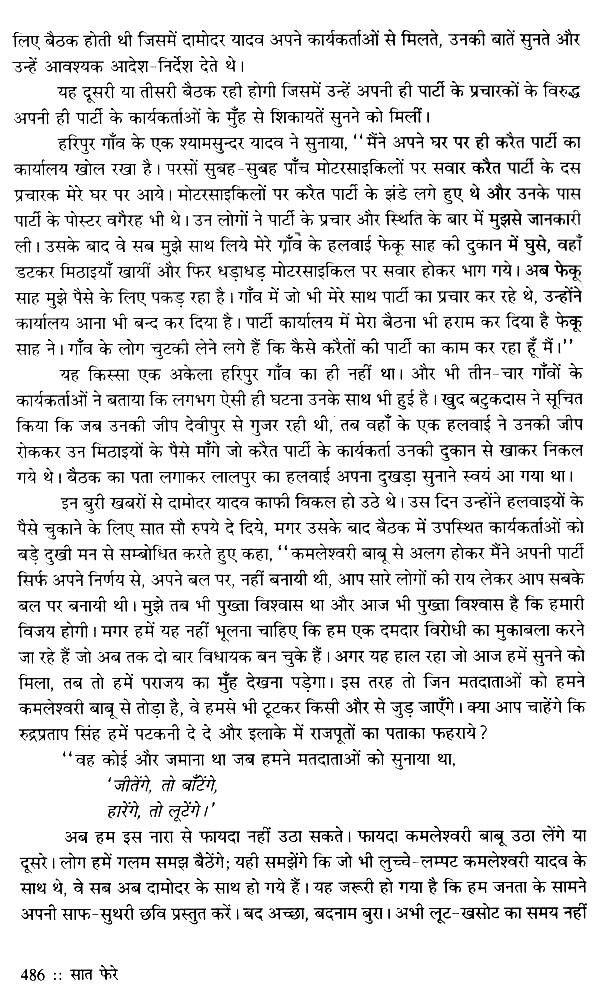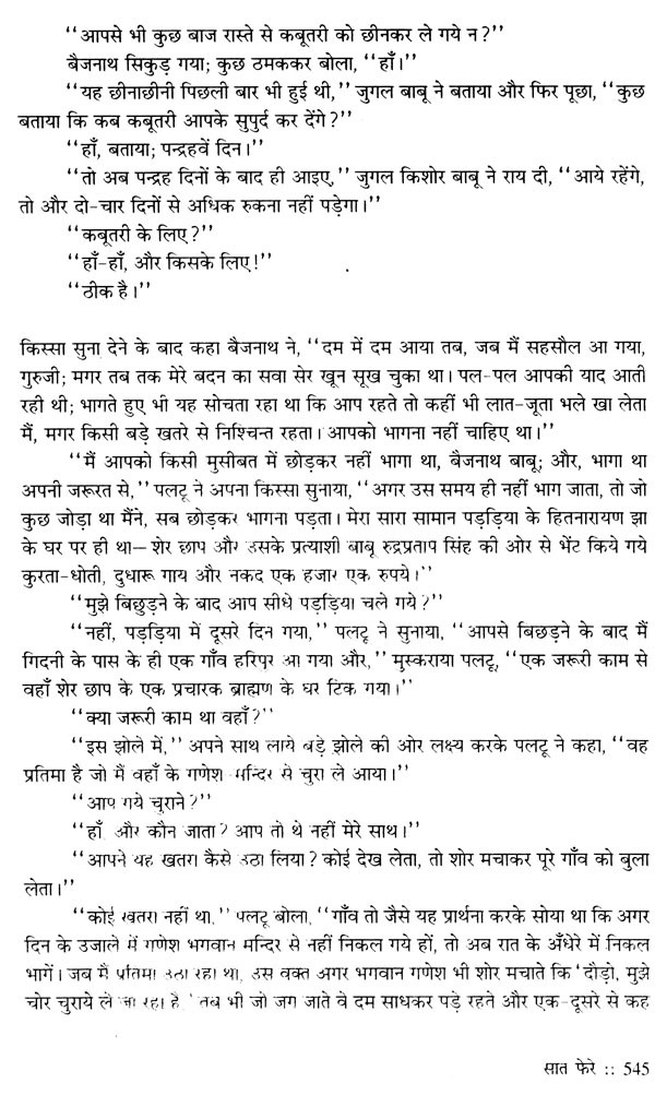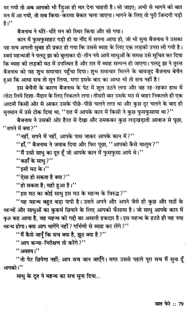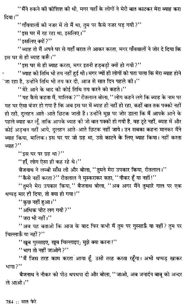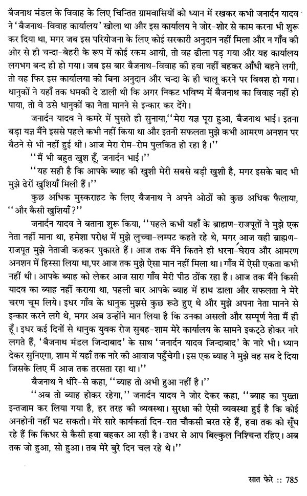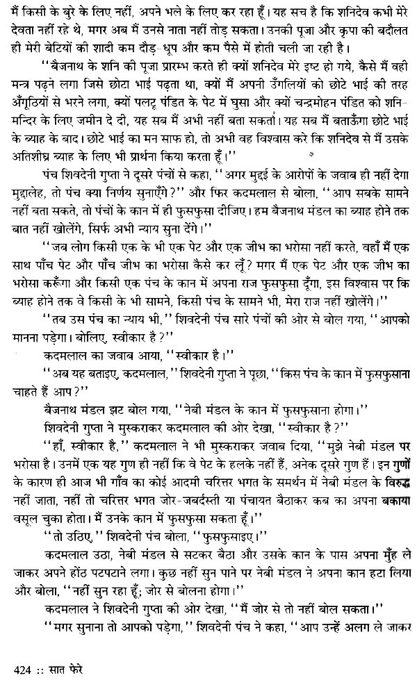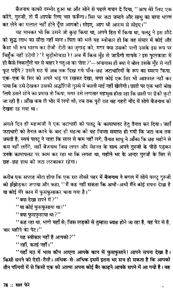 'सात फेरे' वरिष्ठ कथाकार चन्द्रकिशोर जायसवाल का अत्यन्त रोचक उपन्यास है। रोचक इस अर्थ में कि लेखक ने कथासाहित्य के अनिवार्य तत्त्व 'किस्सागोई' का समकालीन प्रवृत्तियों के अनुसार अद्भुत प्रयोग किया है। कथारस को स्थितियों और पात्रों से जोड़कर चन्द्रकिशोर जायसवाल ने 'सात फेरे' की रचना की है। यह उपन्यास एक तिहाजू व्यक्ति की कथा है जो फिर एक विवाह करना चाहता है। इस कार्य में उसका सहायक बनता है एक 'विस्थापित पुरोहित'। दोनों कन्याखोजी अभियान में बार-बार निकलते हैं और अन्तिम फेरे से पहले भाँति-भाँति की दुर्दशा करवाकर घर वापस आते हैं। विवाहाभिलाषी अधेड़ व्यक्ति की मनोदशा के साथ बिहार के एक विशेष अंचल के समाजशास्त्र को लेखक ने छोटे-छोटे महत्त्वपूर्ण विवरणों के साथ प्रस्तुत किया है। उपन्यास में लोकजीवन और उसके विविध लिखित-अलिखित पक्षों का वृत्तान्त इतना पठनीय है कि पूरी रचना पढ़कर ही पाठक को सन्तोष होता है। यह लेखकीय कुशलता है कि व्यंग्य-विनोद द्वारा आच्छादित कथा के बीच उसने स्मरणीय चरित्रों और विमर्शमूलक टिप्पणियों के लिए भी 'स्पेस' निकाल लिया है। 'सात फेरे' अद्भुत कथारस और विचित्र वर्णन पद्धति के लिए पाठकों की अपार प्रशंसा प्राप्त करेगा, ऐसा विश्वास है।