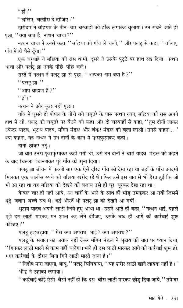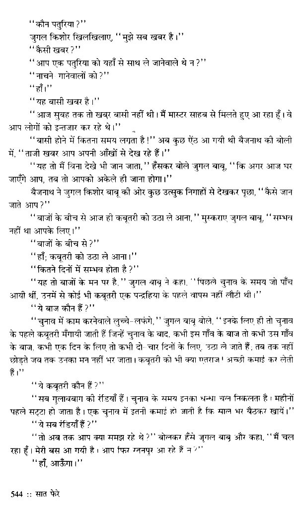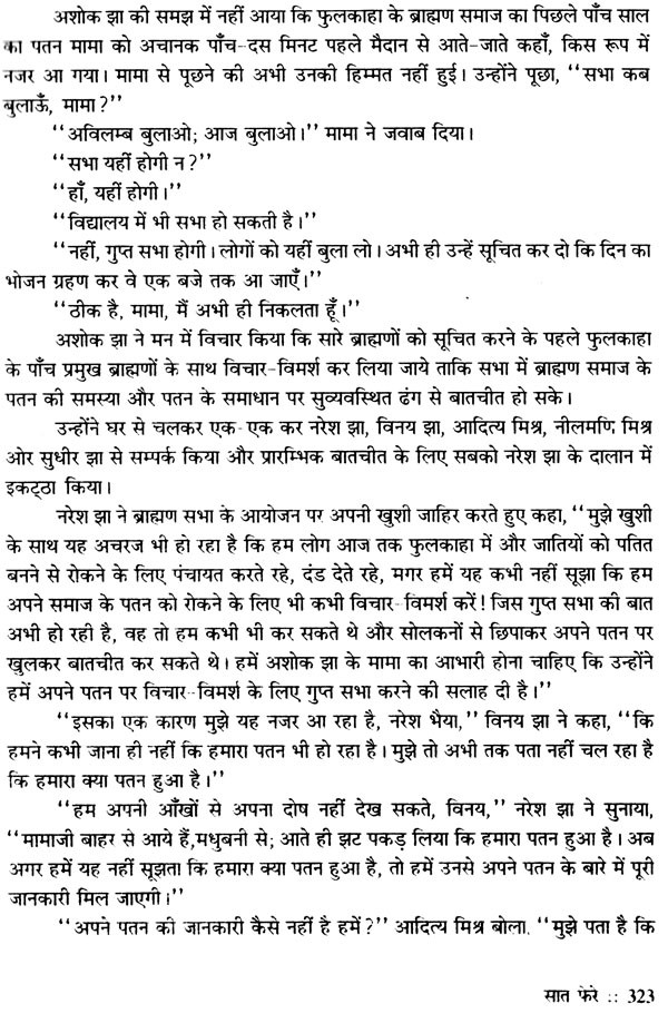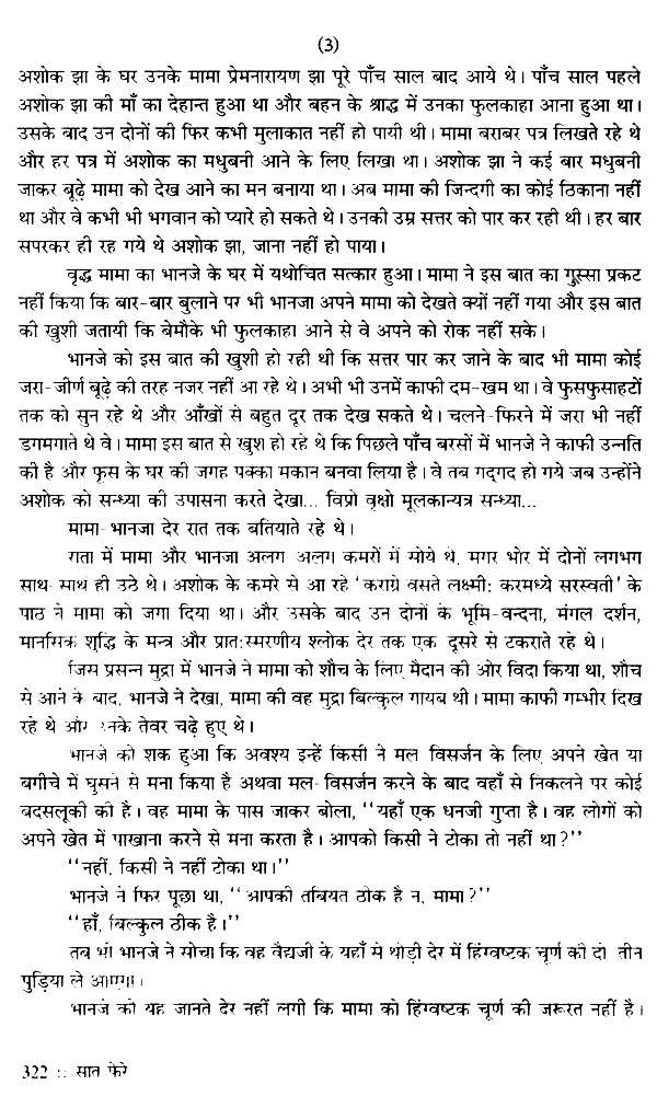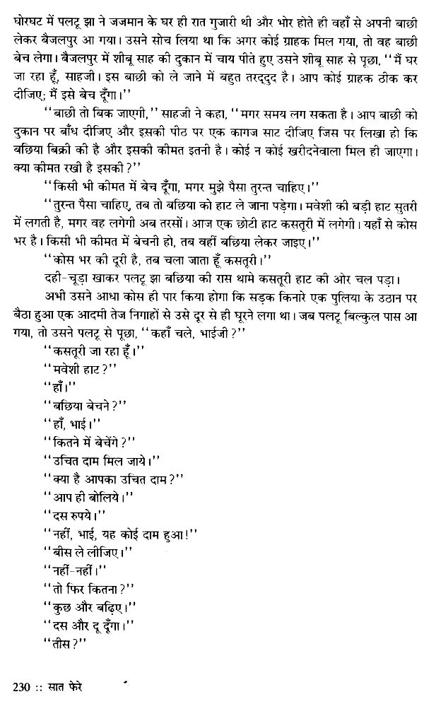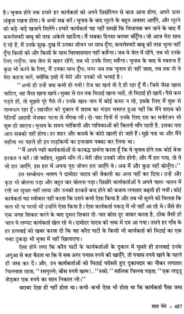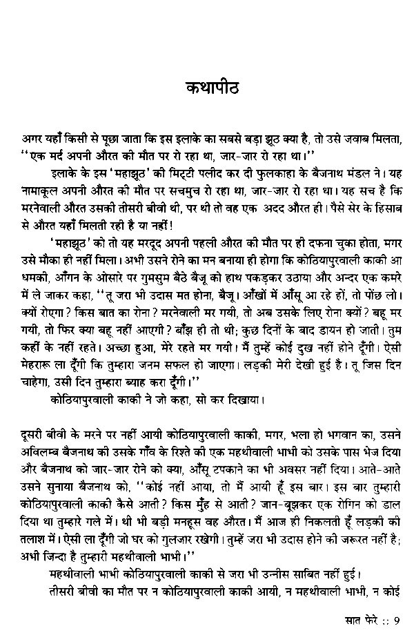 'सात फेरे' वरिष्ठ कथाकार चन्द्रकिशोर जायसवाल का अत्यन्त रोचक उपन्यास है। रोचक इस अर्थ में कि लेखक ने कथासाहित्य के अनिवार्य तत्त्व 'किस्सागोई' का समकालीन प्रवृत्तियों के अनुसार अद्भुत प्रयोग किया है। कथारस को स्थितियों और पात्रों से जोड़कर चन्द्रकिशोर जायसवाल ने 'सात फेरे' की रचना की है। यह उपन्यास एक तिहाजू व्यक्ति की कथा है जो फिर एक विवाह करना चाहता है। इस कार्य में उसका सहायक बनता है एक 'विस्थापित पुरोहित'। दोनों कन्याखोजी अभियान में बार-बार निकलते हैं और अन्तिम फेरे से पहले भाँति-भाँति की दुर्दशा करवाकर घर वापस आते हैं। विवाहाभिलाषी अधेड़ व्यक्ति की मनोदशा के साथ बिहार के एक विशेष अंचल के समाजशास्त्र को लेखक ने छोटे-छोटे महत्त्वपूर्ण विवरणों के साथ प्रस्तुत किया है। उपन्यास में लोकजीवन और उसके विविध लिखित-अलिखित पक्षों का वृत्तान्त इतना पठनीय है कि पूरी रचना पढ़कर ही पाठक को सन्तोष होता है। यह लेखकीय कुशलता है कि व्यंग्य-विनोद द्वारा आच्छादित कथा के बीच उसने स्मरणीय चरित्रों और विमर्शमूलक टिप्पणियों के लिए भी 'स्पेस' निकाल लिया है। 'सात फेरे' अद्भुत कथारस और विचित्र वर्णन पद्धति के लिए पाठकों की अपार प्रशंसा प्राप्त करेगा, ऐसा विश्वास है।