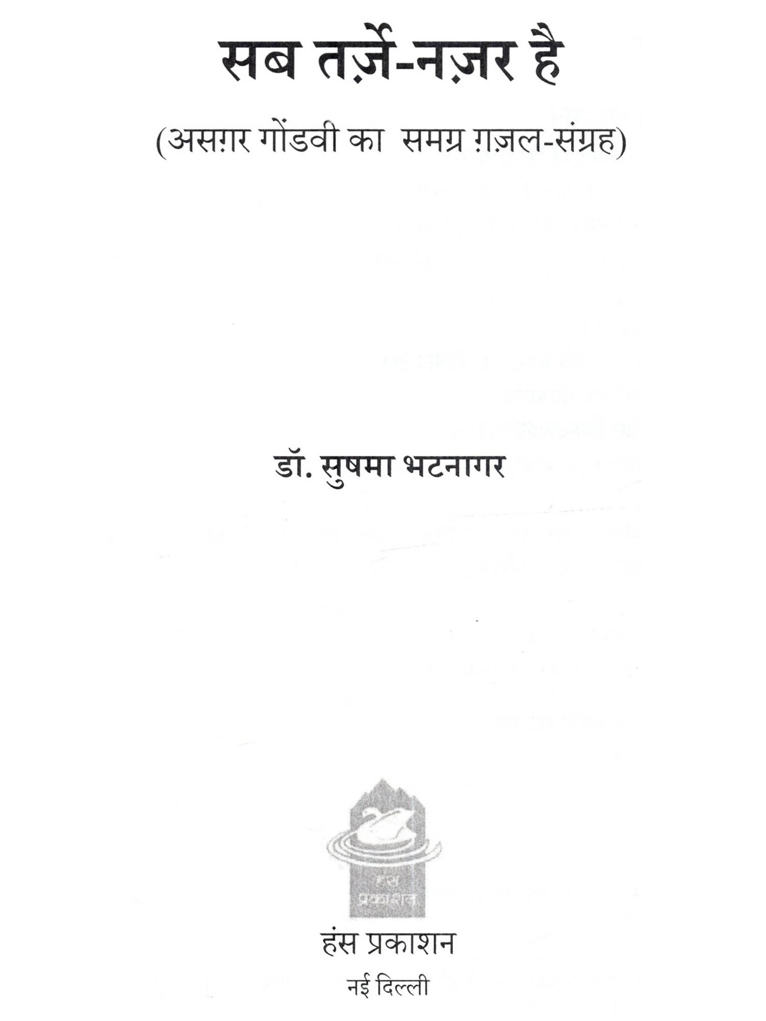 सुषमा भटनागर का लेखन विस्तार की अपेक्षा गहन शोध, अध्यवसाय एवं सूक्ष्म विश्लेषण का हामी रहा है। दिल्ली विश्वविद्यालय से एम. ए. और पी एच.डी. की उपाधि प्राप्त कर कुछ वर्ष लेडी श्री राम कॉलेज में अध्यापन। लोक सभा सचिवालय की समानांतर भाषांतरण सेवा में अधिकारी और फिर निदेशक के रूप में सेवानिवृत्त । तदुपरांत क्रमशः लेडी श्री राम कॉलेज एवं दिल्ली विश्वविद्यालय में अतिथि प्राध्यापक के रूप में साहित्य एवं भाषांतरण का अध्यापन । तीन आलोचनापरक पुस्तकों के अतिरिक्त उर्दू के विख्यात कहानीकार अली बाक़र के उर्दू कहानी संग्रह 'खुशी के मौसम' का हिंदी में अनुवाद, वाणी प्रकाशन से प्रकाशिता उर्दू, हिंदी ग़ज़ल पर विभिन्न पत्र-पत्रिकाओं में लेख एवं समीक्षाएं प्रकाशित। छात्र जीवन से ही उर्दू साहित्य में गहन रुचि होने के नाते आकाशवाणी दिल्ली की युववाणी एवं उर्दू सेवा के लिए उर्दू में फ़ीचर-लेखन, वार्ता एवं चर्चाओं में सक्रिय। पिछले अनेक वर्षों से असगर की शायरी का गहन अध्ययन एवं लेखन। उनकी शायरी पर क्रमशः दो आलेख प्रकाशित, 'लुत्फ़ जब है अपनी दुनिया आप पैदा कीजिए' (समकालीन भारतीय साहित्य, जुलाई-अगस्त 2002) तथा 'ज़माना आ रहा है जब उसे समझेंगे सब असग़र' (वाक्, वर्ष 2007, अंक2)। प्रस्तुत पुस्तक 'सब तर्जे नज़र है' उर्दू शायरी के कुछ कम पहचाने, कुछ अधिक विवादित शायर असगर गोंडवी की समग्र ग़ज़लों का प्रथम शब्दार्थ सहित संचयन है।