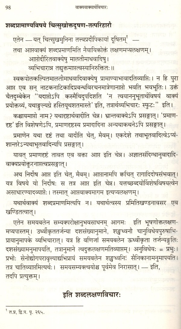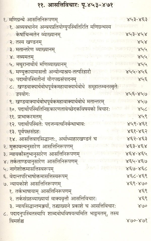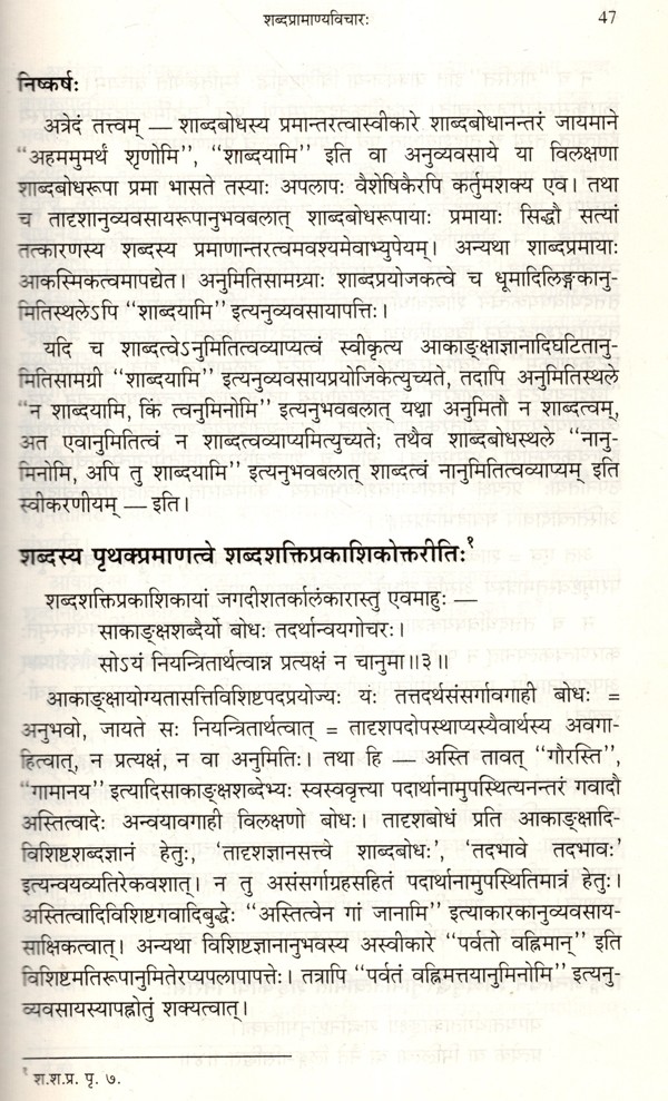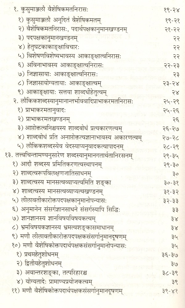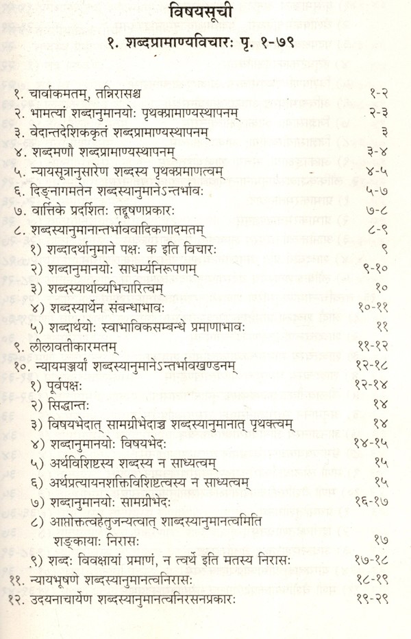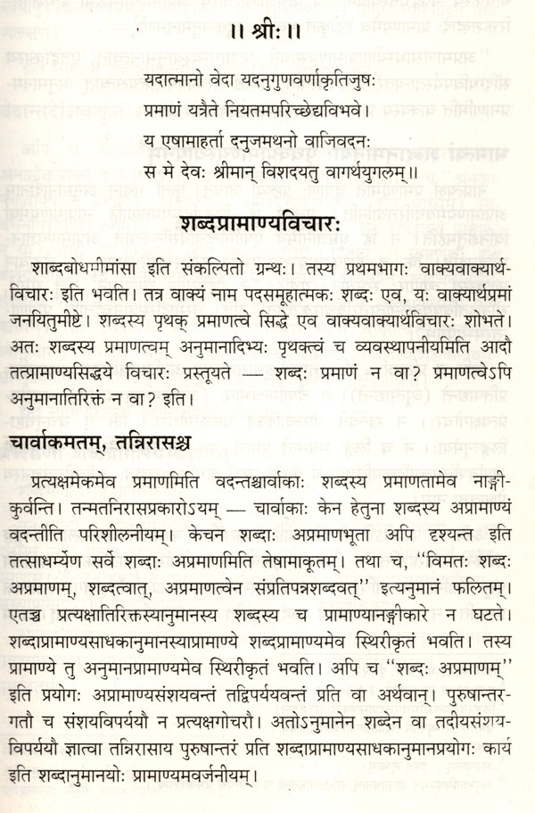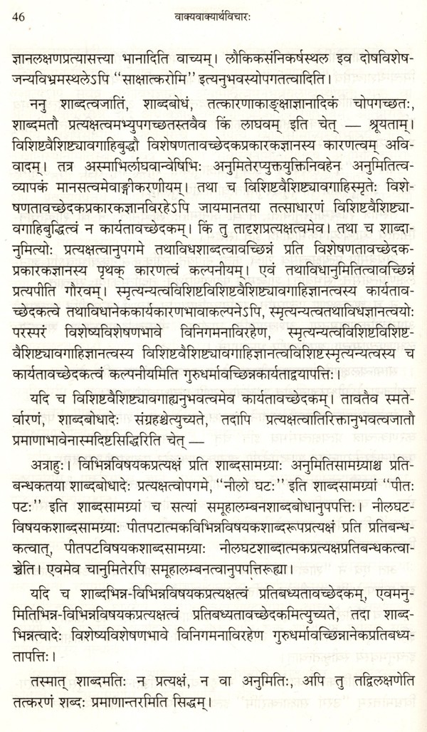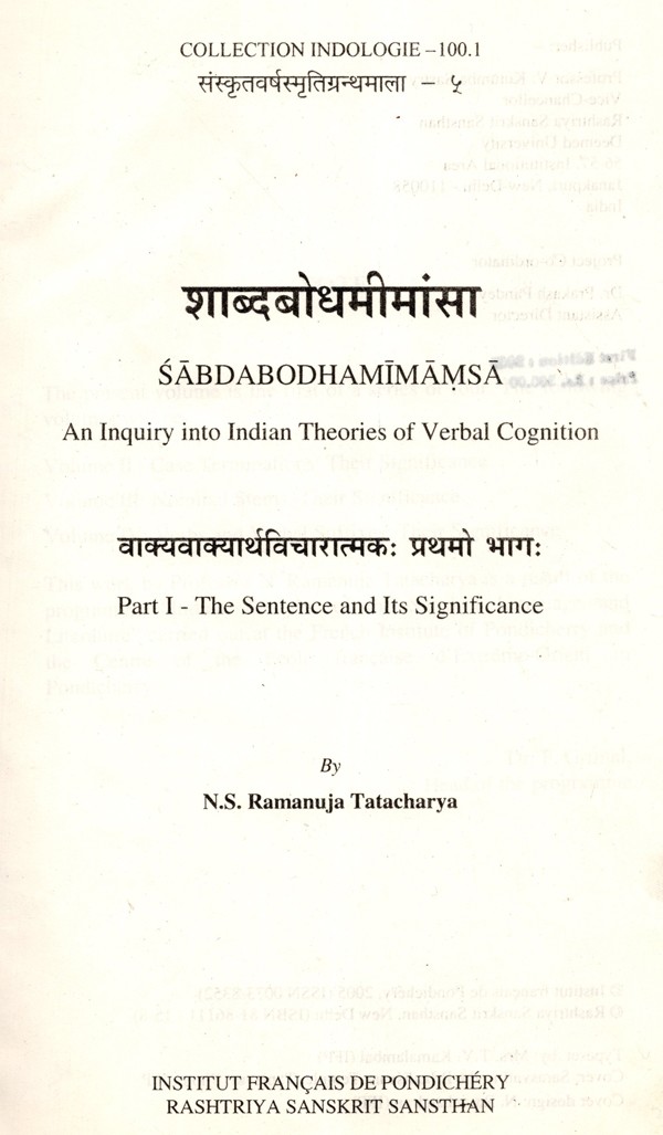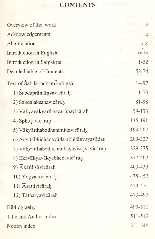 This "Discussion about sentence and sentence-meaning" (Vakya-vakyarthavicara) is the first part of that projected four volume work entitled Sabdabodhamimamsa. Herein the validity and distinction of sabda or verbal testimony, the definition of Sabda, the nature of a sentence and the sentence-meaning, the cause of the cognition of the sentence-meaning, the process through which the cognition of the sentence-meaning arises, the primary substantive in verbal cognition, the unity and division of sentence, the auxiliary causes leading to the verbal cognition i.e. expectancy (@kanka), fitness (yogyata), proximity (@satti) and import (tatparya) - all these topics are dealt with according to the different schools of Indian thought. 1. Validity of sabda