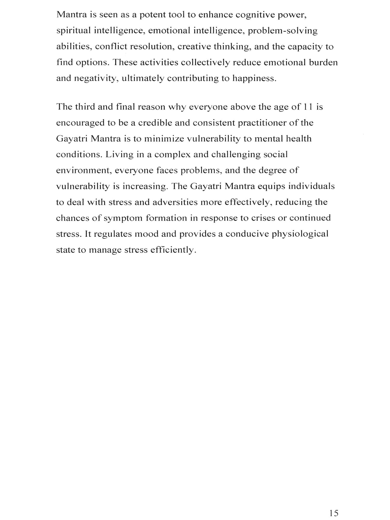 In the tapestry of life, mental well-being is the vibrant thread that weaves happiness, resilience, and fulfilment. This book delves into the essence of the Gayatri Mantra, exploring its potential as a method for nurturing positive mental states in individuals. The journey through these pages embarks on a multidimensional exploration, drawing insights from psychology, neuroscience, medical literature, and the timeless wisdom enshrined in sacred texts.