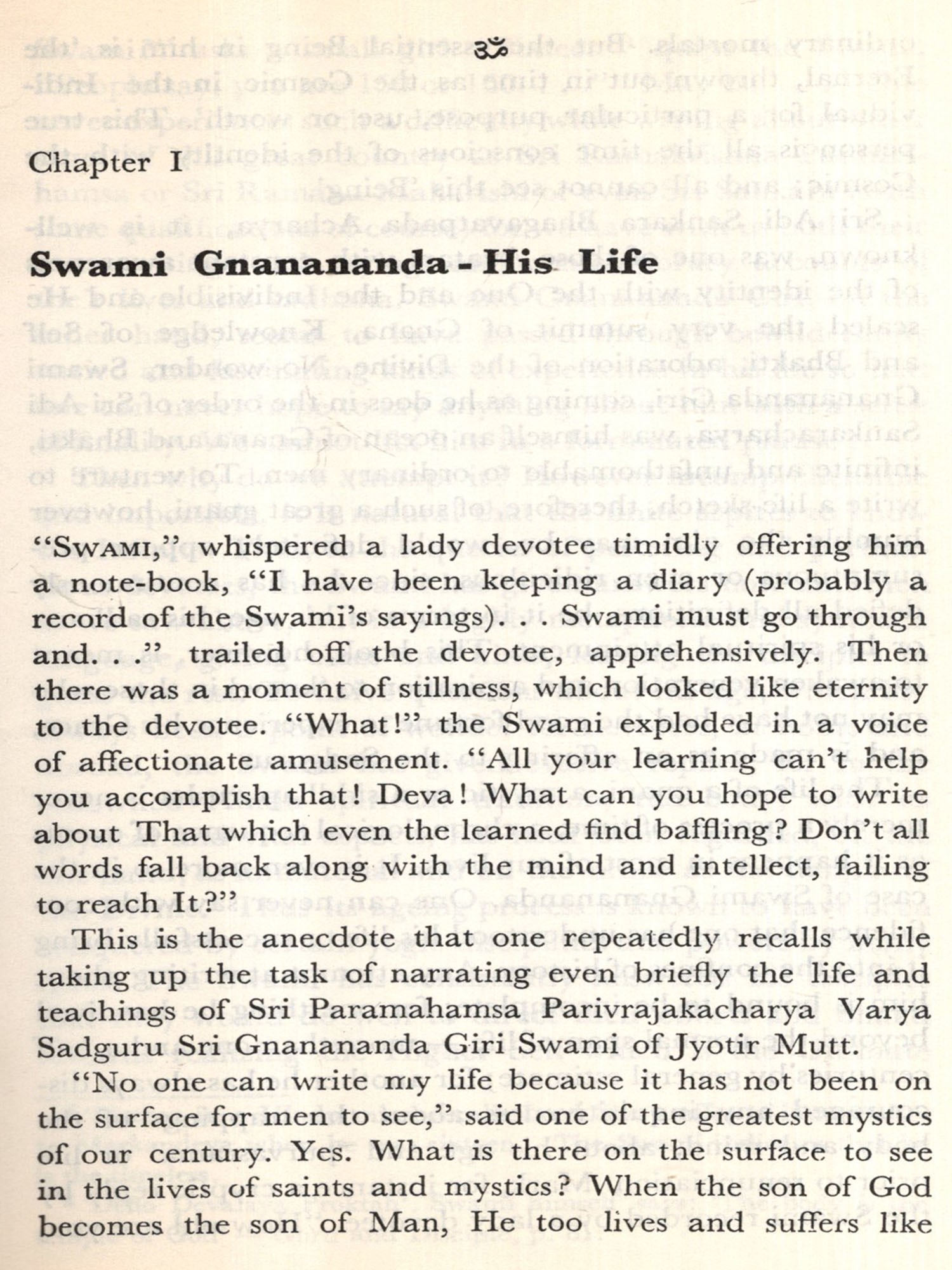 SADGURU GNANANANDA is a baffling enigma to the modern intellectual but an open book with the disarming simplicity of a child of God to the common man. Swamiji swore by tradition but went beyond it in his glorious ministry spanning well over a century nobody knows for certain how long. He breathed the essence of God-Knowledge, the para vidya, but amazed everyone with his grasp of the intricacies of the complex texture of the prevailing material civilisation. He would draw himself on to the summits of Brahmic Nirvana and the next moment join hilarious children on their swing. There was hardly a line of Yoga with which he was not acquainted, not a major experience in spiritual life that he had not undergone.