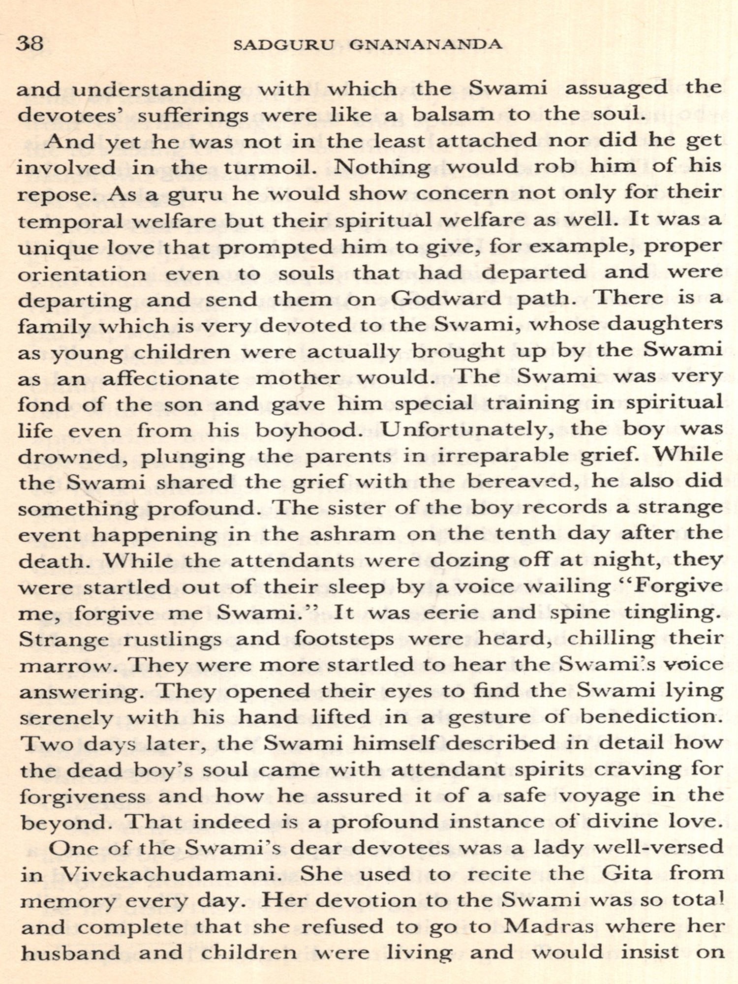 10. We thought that the perspicacious presentation of the Swami's teachings in the book 'Guru and Disciple' by Swami Abhishiktananda, in a style which is both profound and limpid, would illumine the themes on which we have quoted him, in a way which we could never hope to improve. Extracts from A sage from the East - Sri Gnanananda' published by the Society for Promoting Christian Knowledge in the volume 'Guru and Disciple' by Swami Abhishiktananda are reproduced by permission of SPCK. Passages from his book 'Sanyasa', published by the Indian Society for Promoting Christian Knowledge, in the volume 'Further Shore' are reproduced with the per-mission of the heirs of Swami Abhishiktananda.