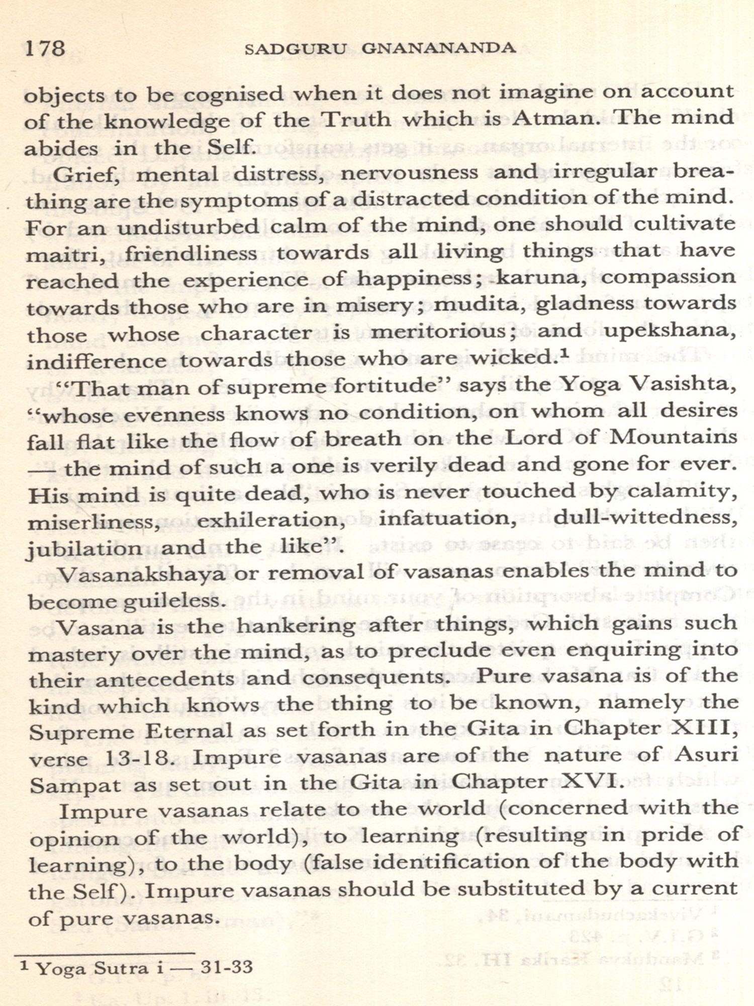 Gnanananda Giri may have belonged to an Advaitic tradition, sampradaya, but his life was a meeting ground for various traditions: Sankhya, Yoga, Tantra, Vedanta. In him fused philosophy, upasana, practical discipline to realise the truth of the philosophy, occultism, gupta vidya, and sound commonsense. He synthesised Jnana, Knowledge, Bhakti, Love, Karma, Action in a unique manner; he related them to the processes of purifying and subtilising the mental body, the vital body and the physical body. He taught how to organise the different vehicles, koshas, around their true Self, dispensing with the pseudo-self-i.e. the ego. He insisted that one learn first to poise oneself in the Witness consciousness before one can hope to move into the station of the Self.