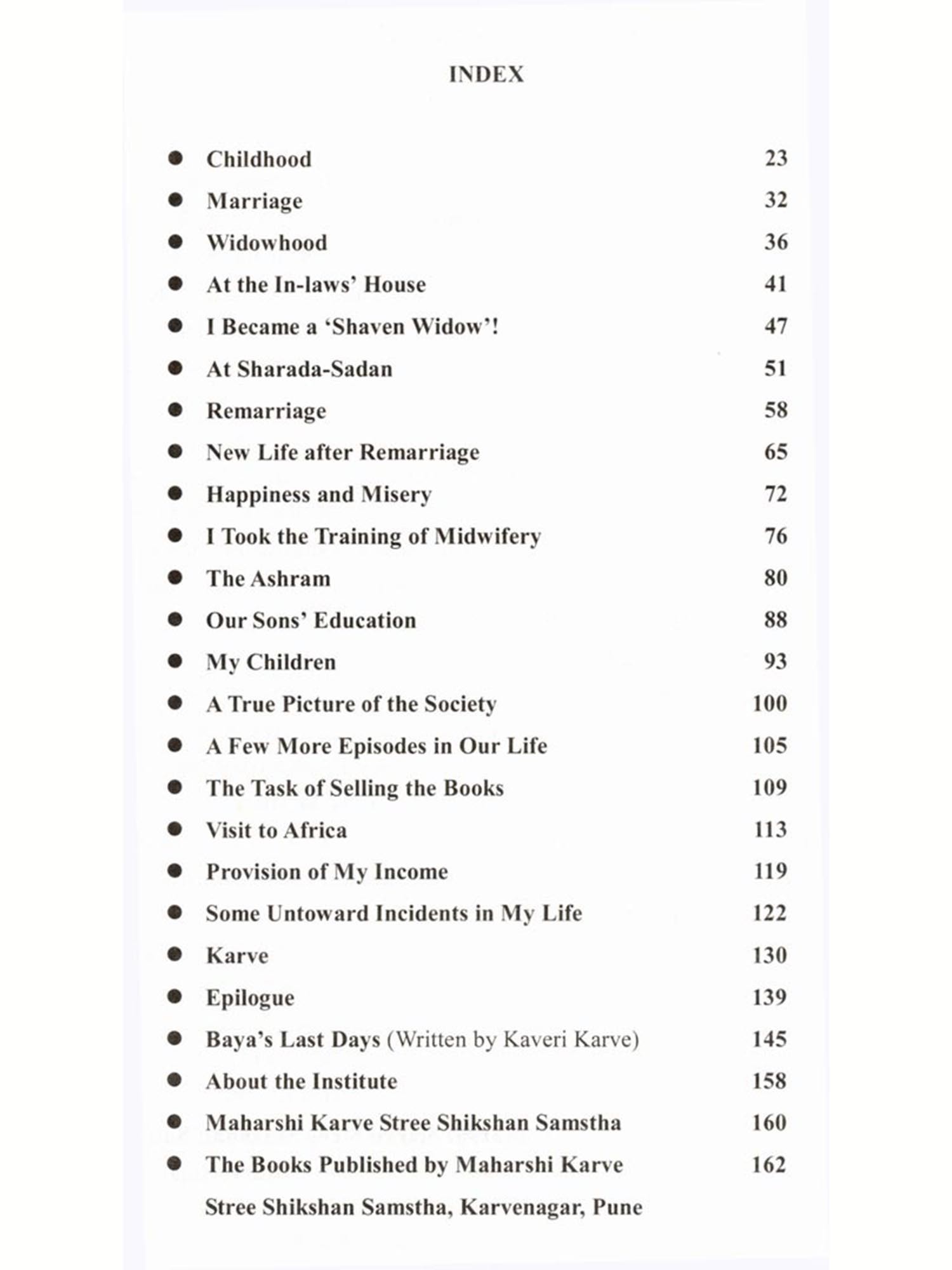 The editor has presented the book in the form of twenty-one small and self-contained chapters. They come under the titles like.... Childhood', 'Marriage', 'Widowhood', 'Sharada-Sadan', 'Remarriage', "New Life after Remarriage', 'The Ashram', 'Our Sons' Education', 'A True Picture of the Society', 'Visit to Africa', 'Provision of My Income', 'Some Untoward Incidents in My Life', 'Karve Even when we read the titles of the chapters, we get a good idea of the content of the autobiography.