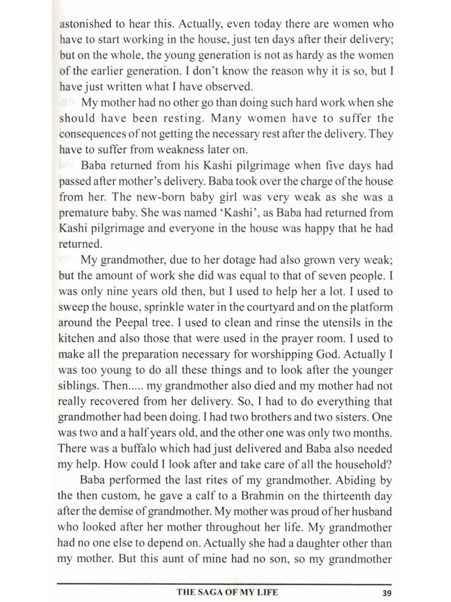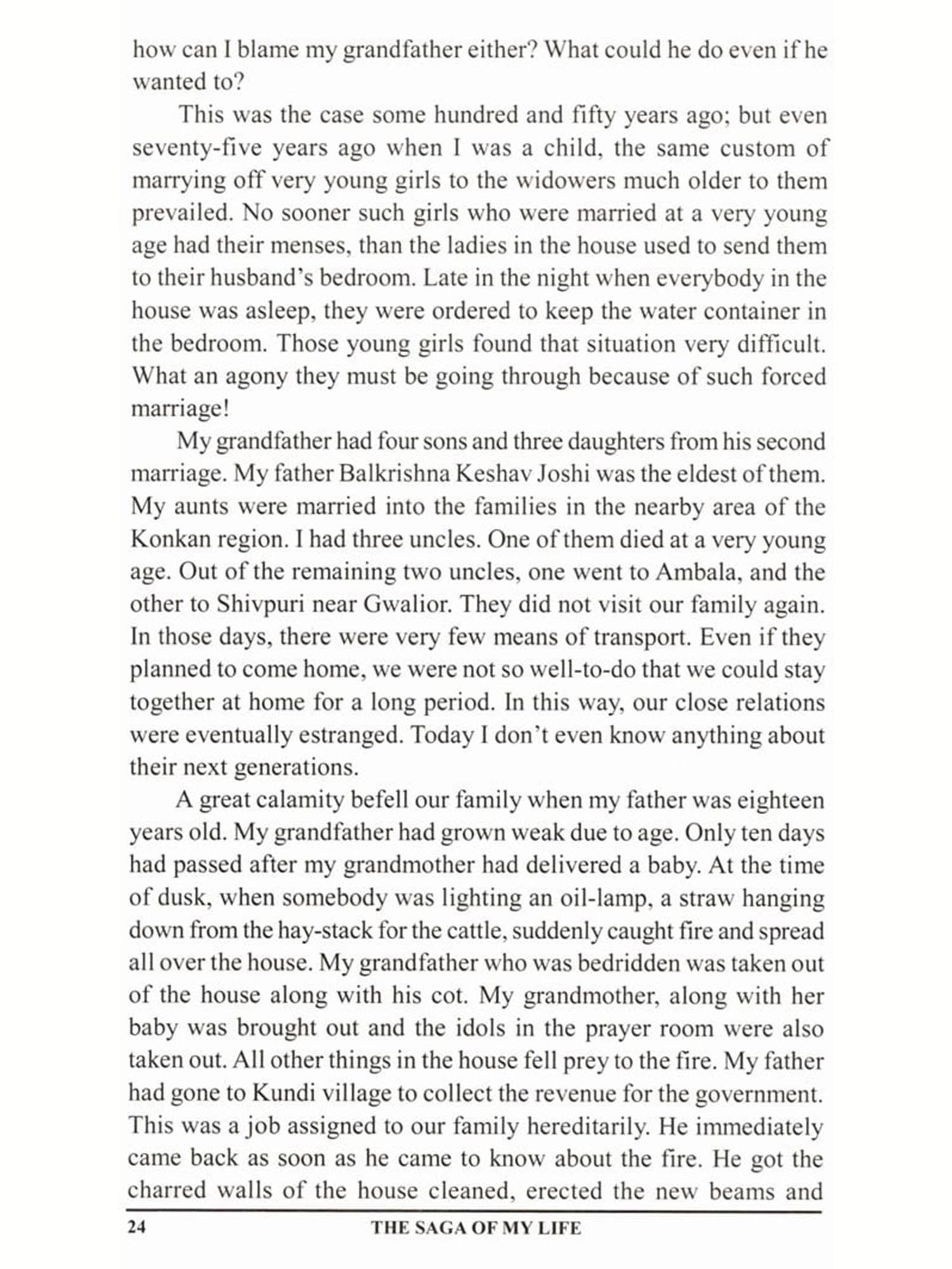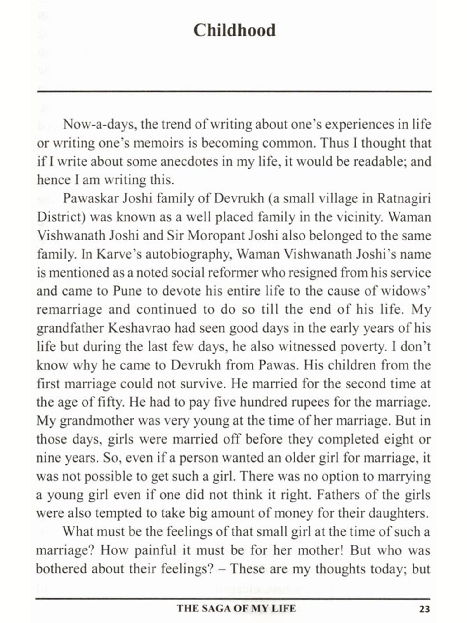 autobiographical account, titled 'Maze Puran' ( )"The Saga of My Life'. It's first edition was published in 1944. Only after seven years, in 1951, a famous Bombay based publishing company named Keshav Bhikaji Dhavale published its second edition. The crown-sized edition of the book, consisting of a hundred and fifty pages was priced for two and a quarter rupees only. Now, the third edition is being published by the Institute (Maharshi Karve Stree Shikshan Sanstha). It is a happy and auspicious moment for the Institute to publish the autobiography of Mrs. Anandibai alias Baya Karve, because it occupies an important place in the history of women's education, as an authentic document.