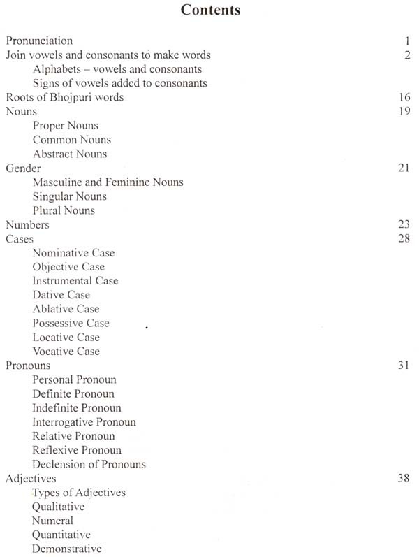 The Devanagri alphabets, vowels and consonants have been given in complete with the exceptions and changes occurring in Bhojpuri sounds. Word building by adding prefixes and suffixes too has been included.