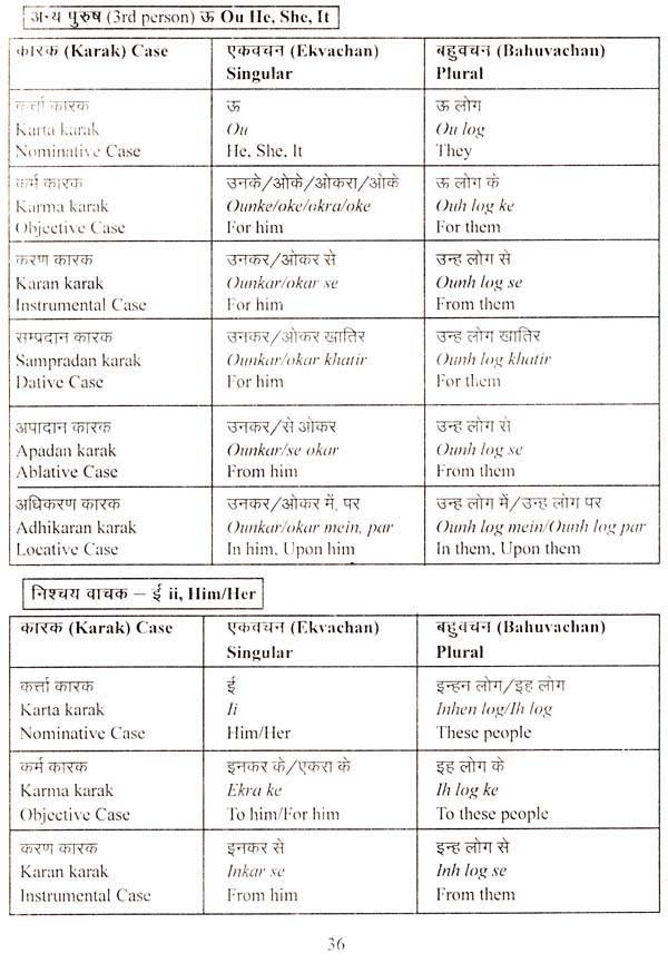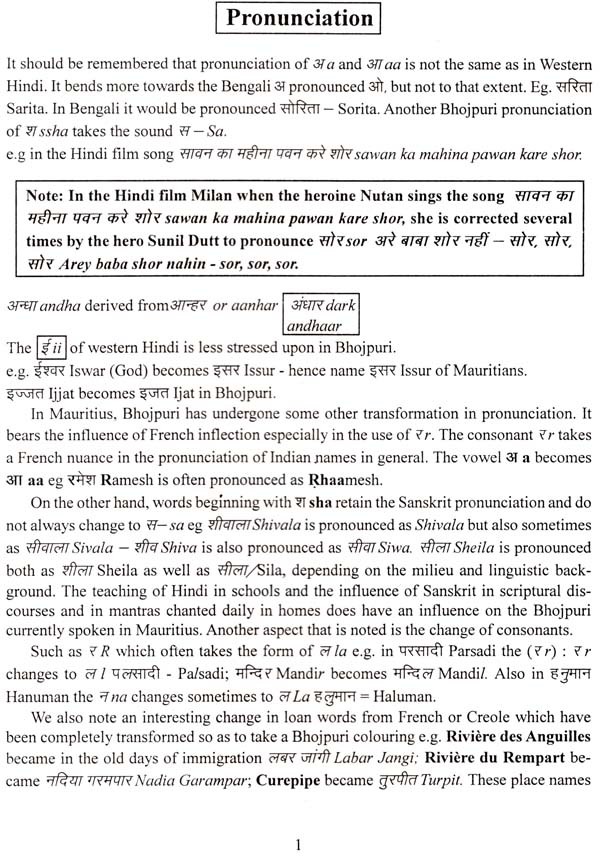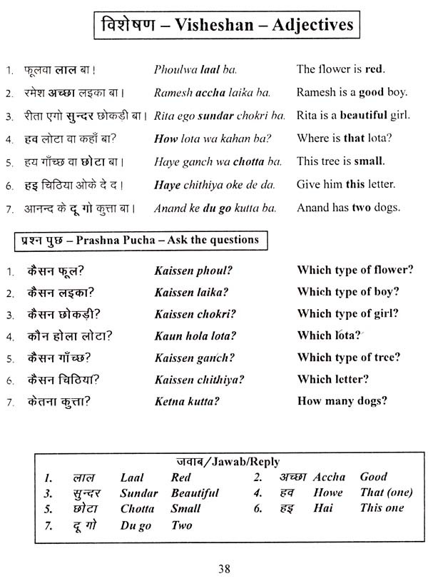 I have given the different parts of grammar in Bhojpuri and the equivalent terms or parts of speech in English to make it easily understood and assimilated. Differences in approaches such as the use of postpositions in Bhojpuri and prepositions in English have been high-lighted with adequate examples to draw the point home. Moreover, I have used both Devanagri and Roman scripts throughout so that even if you are not acquainted with Devanagri you will still have access to Bhojpuri. In addition, I have given word for word translation in English side by side.