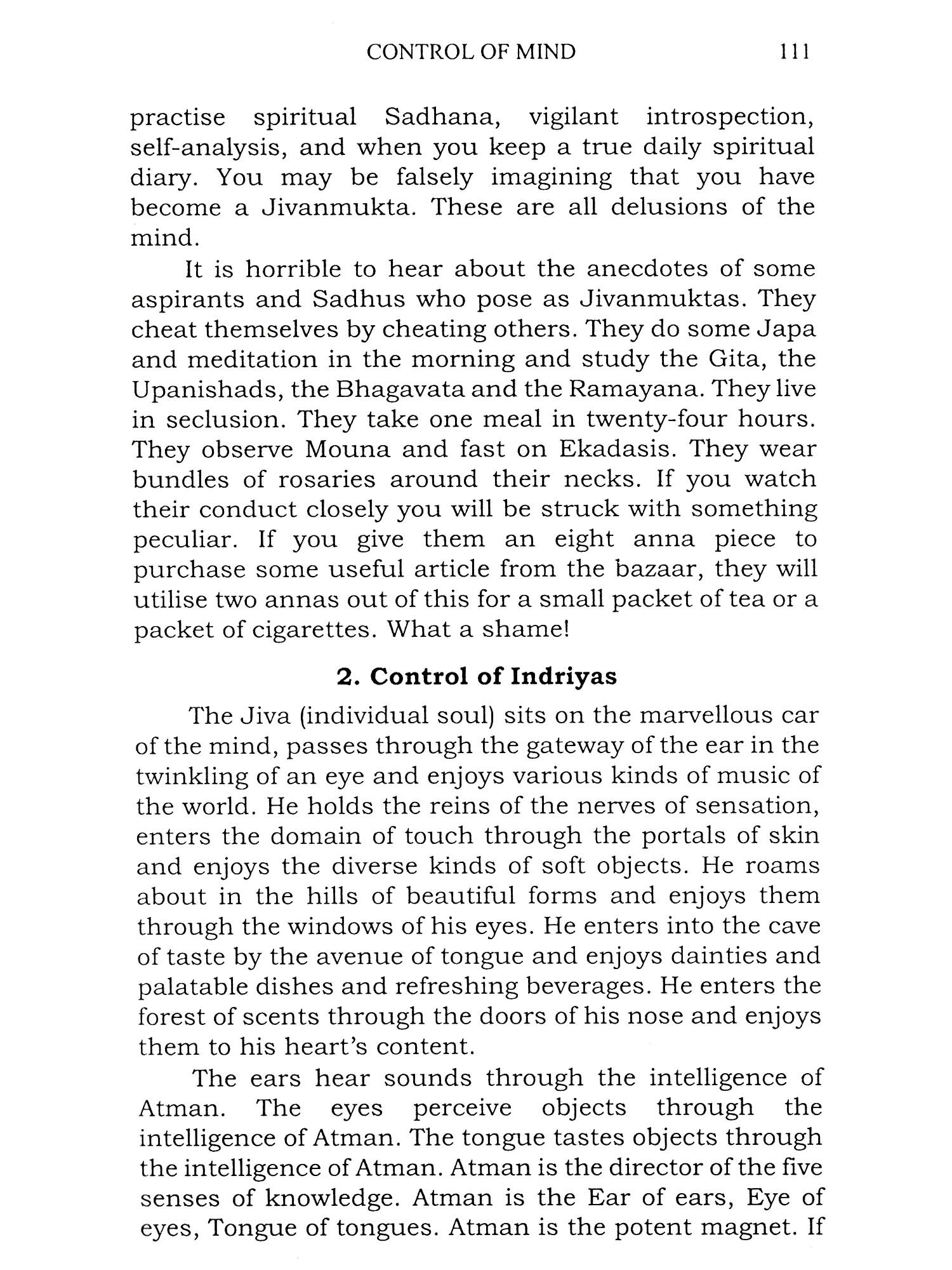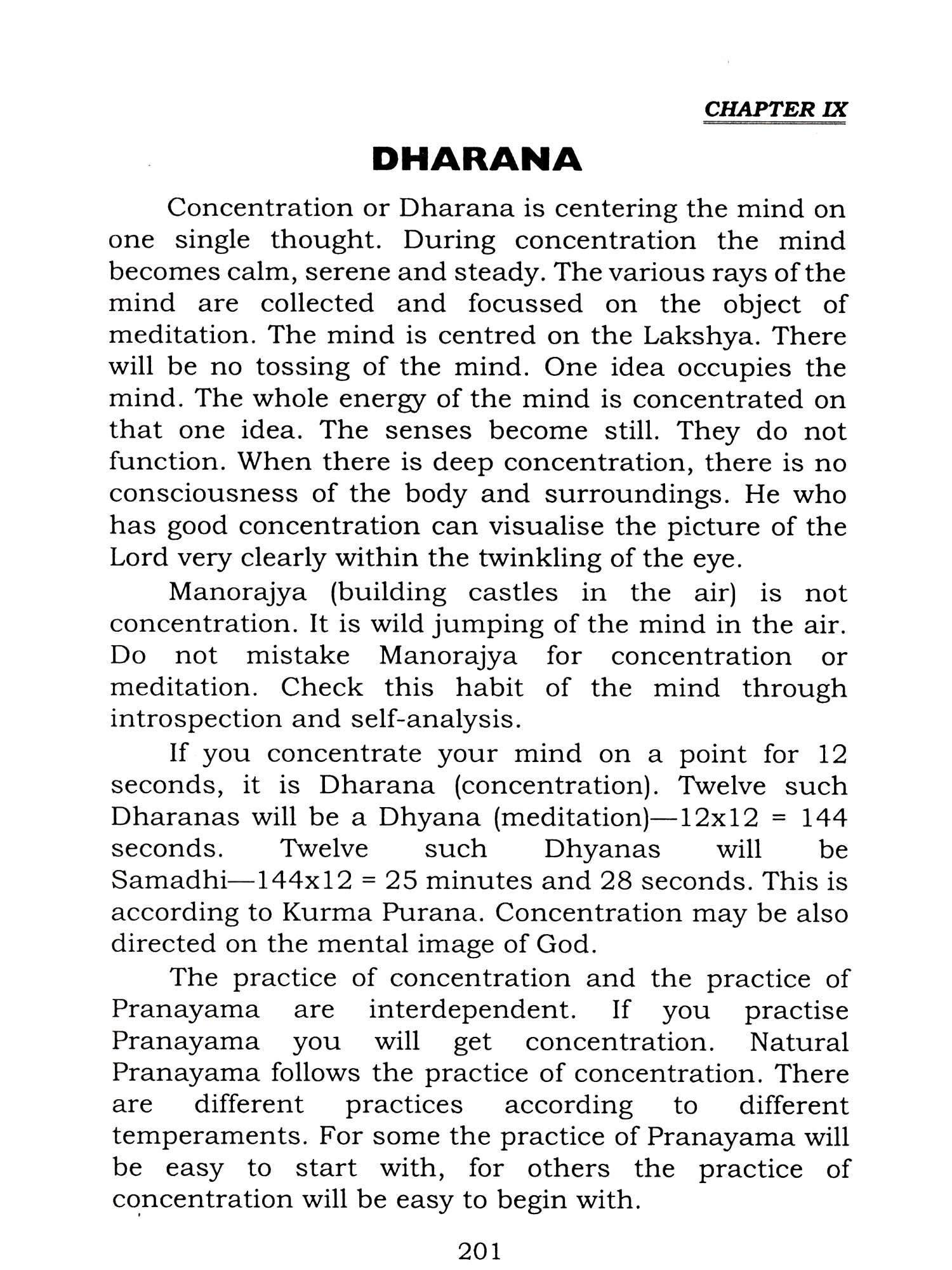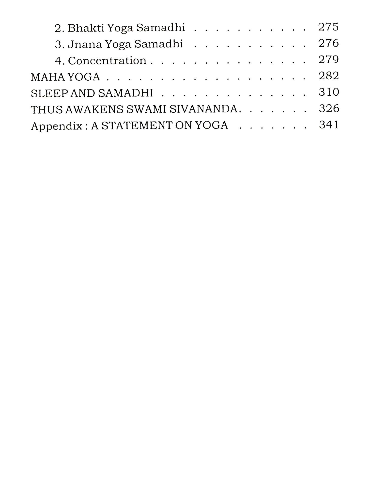 Mind and breath are like milk and water. Raja Yoga is control of mind. He who wants to become a perfect Yogi and to experience the wonderful Samadhi must control mind and breath. He must continuously practise Yoga and observe the rules. He must thoroughly overcome the five Tattvas. Restraint of the mind (Nirodha) leads to Jnana. Nirodha is the culmination of Sankhya and Yoga. It is Nirodha which underlies all the Sadhanas or spiritual exercises. Restraint of the mind is the essence of all worship. This is Jnana and Dhyana. The highest end is attained by restraint of the mind. The mind should be completely restrained from the objects. The mind should be restrained till it attains dissolution in the heart. Atman or Brahman is your immortal Self. It is the only blazing reality. If you know this Atman only you can attain perfection. Perfection can be yours in this very life. Atman is to be recognised, to be known as your innermost being through Samadhi. If you know this Atman, which is the Ultimate Reality, which is Perfection, then only your life becomes useful and real existence. The knower of the Atman, the inner perfection, crosses all sorrows and becomes free. If you do not know this Atman, then there is great loss for you. Samadhi is not a mere emotional enthusiasm or an exhilaration of feeling. It is the direct unique intuitive experience of Truth or Absolute Consciousness or the Ultimate Reality.