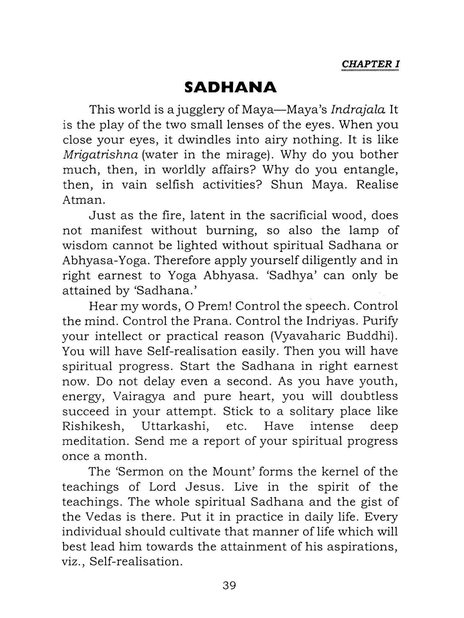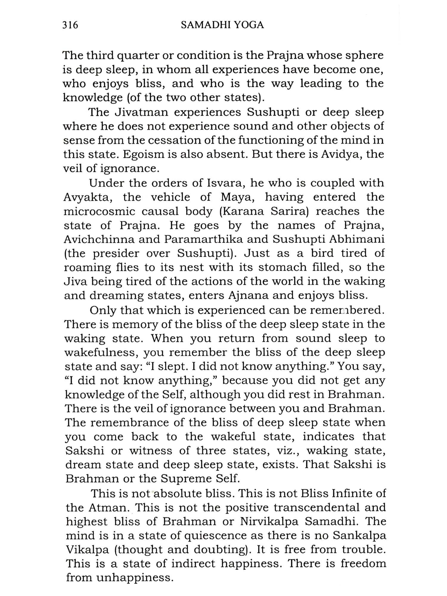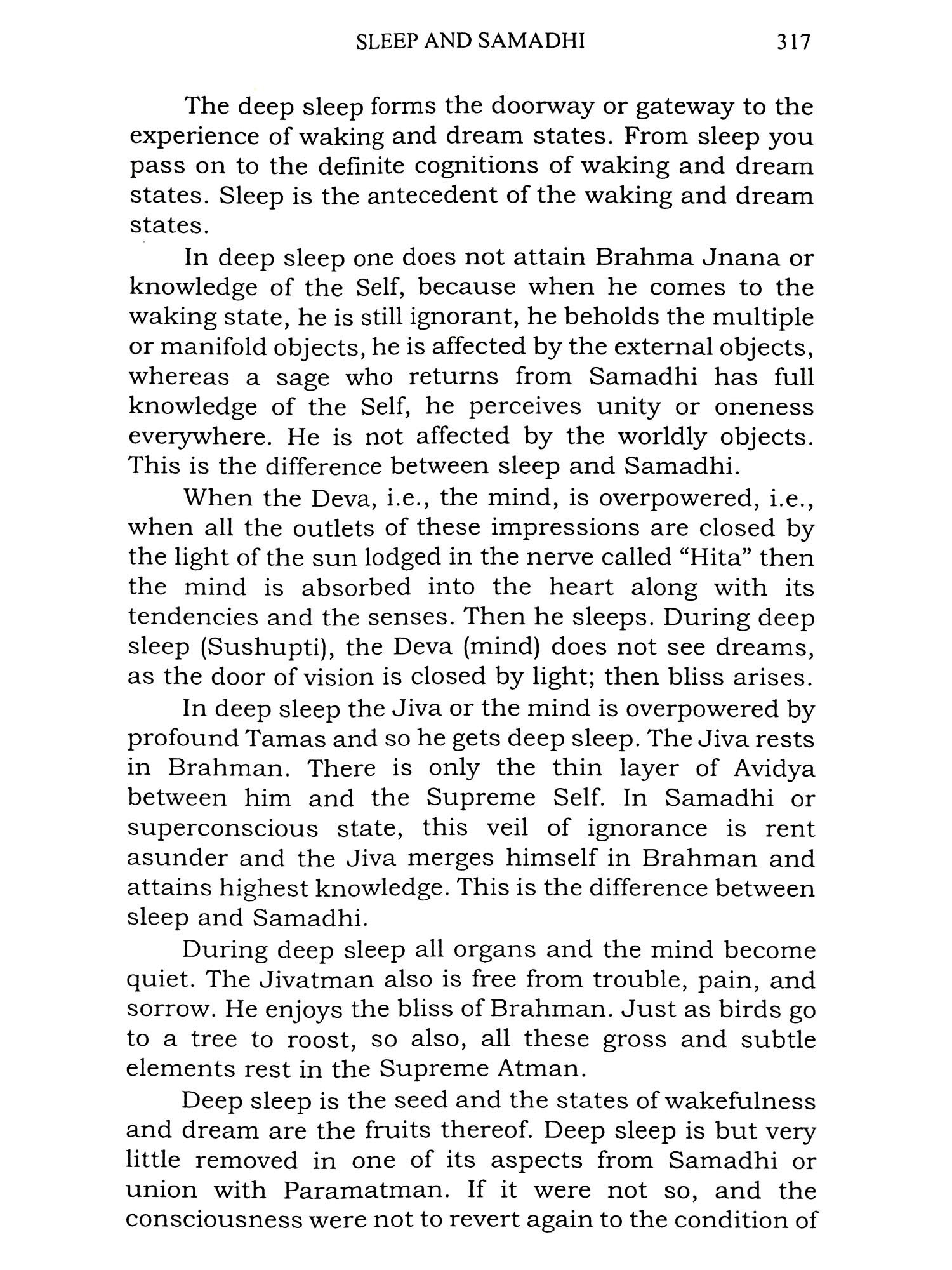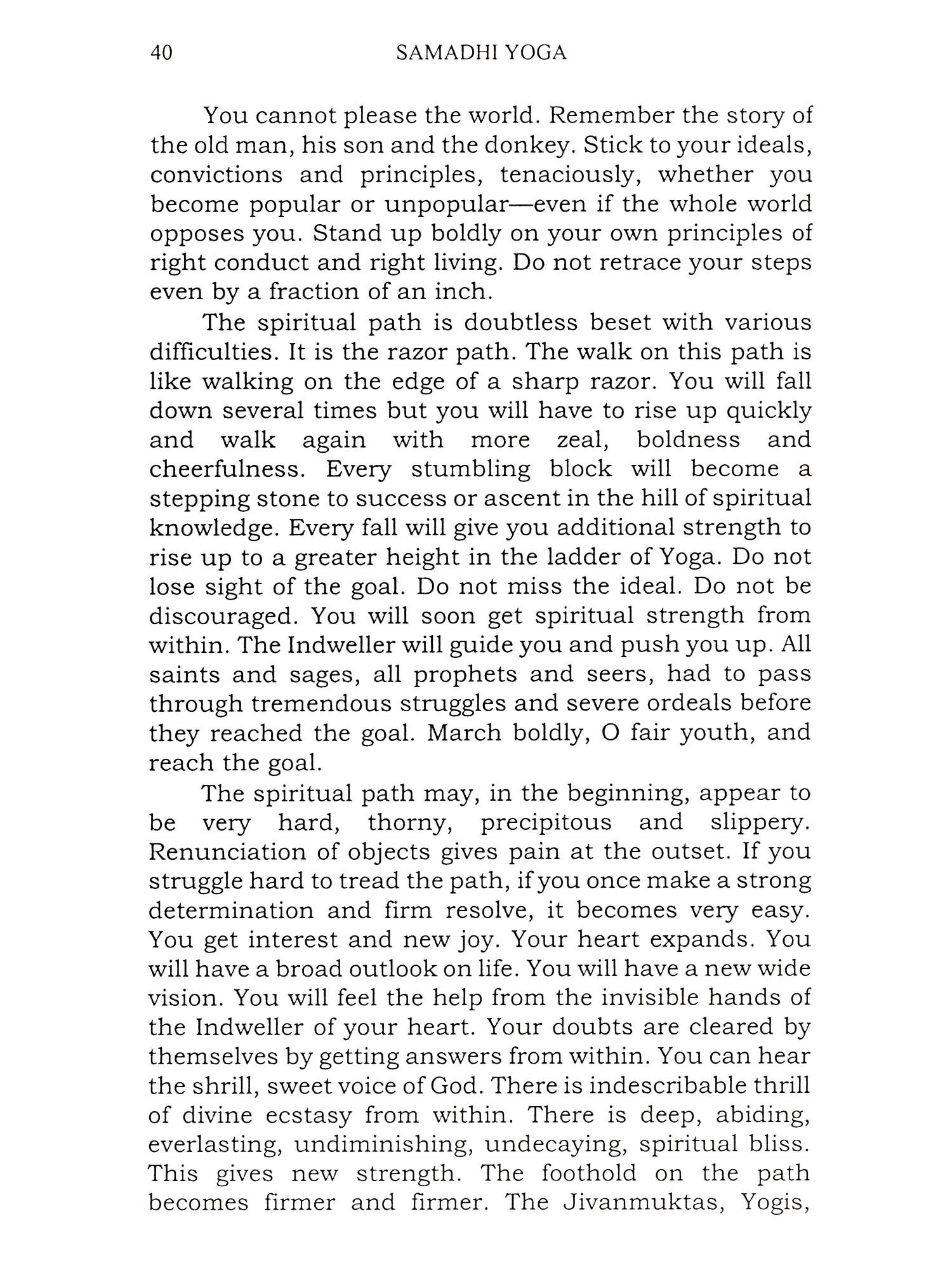 Mind and breath are like milk and water. Raja Yoga is control of mind. He who wants to become a perfect Yogi and to experience the wonderful Samadhi must control mind and breath. He must continuously practise Yoga and observe the rules. He must thoroughly overcome the five Tattvas. Restraint of the mind (Nirodha) leads to Jnana. Nirodha is the culmination of Sankhya and Yoga. It is Nirodha which underlies all the Sadhanas or spiritual exercises. Restraint of the mind is the essence of all worship. This is Jnana and Dhyana. The highest end is attained by restraint of the mind. The mind should be completely restrained from the objects. The mind should be restrained till it attains dissolution in the heart. Atman or Brahman is your immortal Self. It is the only blazing reality. If you know this Atman only you can attain perfection. Perfection can be yours in this very life. Atman is to be recognised, to be known as your innermost being through Samadhi. If you know this Atman, which is the Ultimate Reality, which is Perfection, then only your life becomes useful and real existence. The knower of the Atman, the inner perfection, crosses all sorrows and becomes free. If you do not know this Atman, then there is great loss for you. Samadhi is not a mere emotional enthusiasm or an exhilaration of feeling. It is the direct unique intuitive experience of Truth or Absolute Consciousness or the Ultimate Reality.