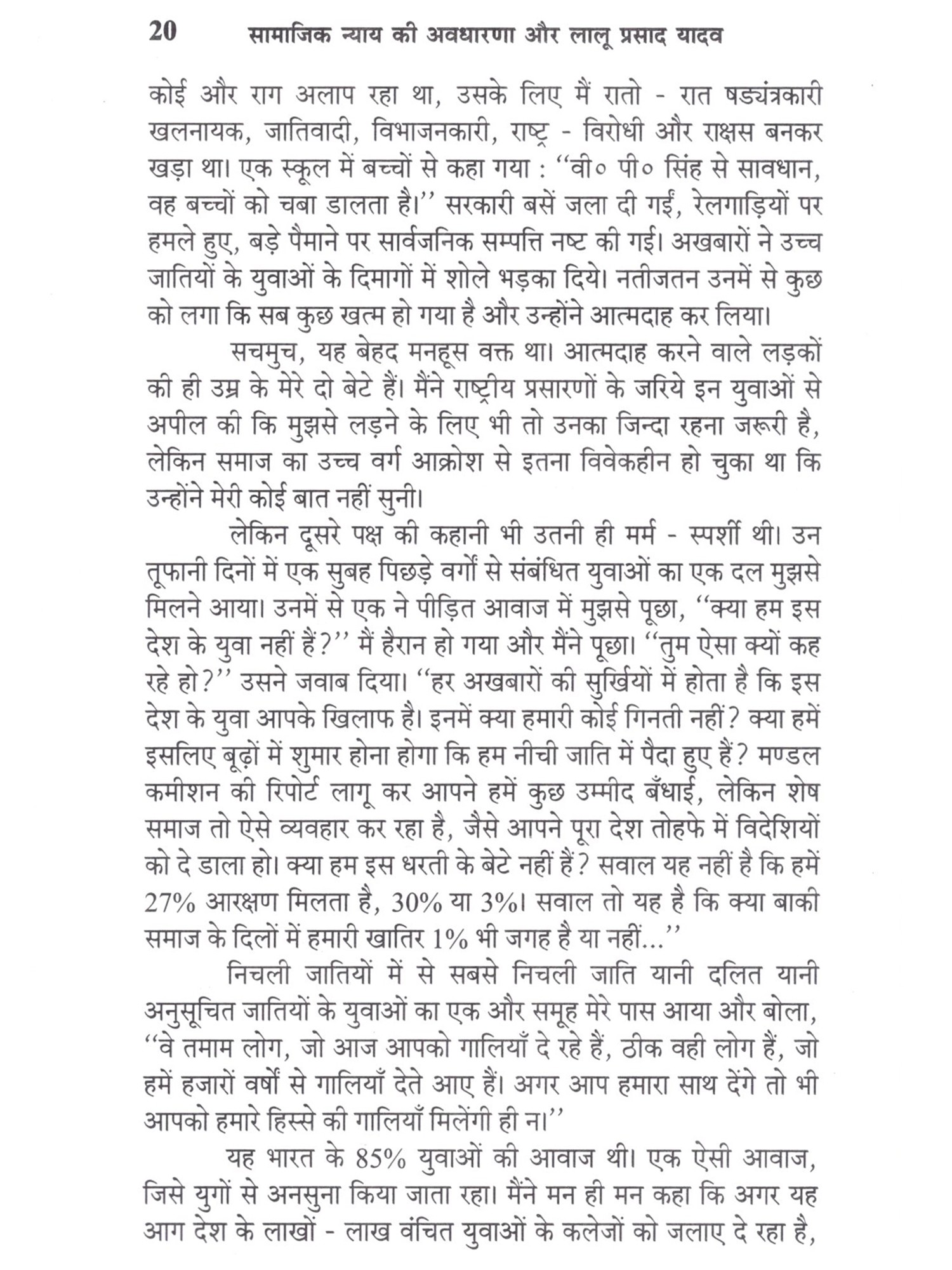 प्रवृत्ति की भित्रता के कारण एक ही चीज लोगों को भिन्न भित्र रूपों में दिखाई देती है। औरों की बात मैं क्या करूं, राष्ट्रपिता महात्मा गाँधी जैसे व्यक्ति को भी देश के लोगों ने अपने अपने ढंग से देखा था। ऐसी स्थिति में लोकनायक जयप्रकाश नारायण के सात्रिध्य में रहकर सम्पूर्ण क्रान्ति और समाजवाद का पाठ पढ़ने वाले तथा मुसहर टोली में जाकर सत्य के साथ प्रयोग करने वाले लालू प्रसाद यादव जैसे व्यक्ति को सामाजिक न्याय मिलने की बात भला कैसे सोची जा सकती है! लोगों के जेहन में जब कभी भी 'न्याय' शब्द प्रवेश करता है तो उन्हें बरबस सन् 1916 में लिखी गयी कथाकार प्रेमचन्द की कहानी 'पंच -परमेश्वर' की याद आने लगती है। कहानी 'पंच परमेश्वर' के गाँव गिराँव के अनपढ़ पंच (न्यायकर्ता) अलगू चौधरी और जुम्मन शेख, कानून तो नहीं जानते थे पर न्याय की मर्यादा को जरूर जानते समझते थे, लेकिन आज के पंच कानून तो जानते हैं पर शायद न्याय की मर्यादा को नहीं जानते समझते। पंचों का वह दोनों वर्ग आज एक दूसरे के आमने सामने खड़ा है, जिन्हें पूरा समाज बड़ी उत्सुकता से निहार रहा है। 'सामाजिक न्याय की अवधारणा (Concept of Social Justice), हजारों वर्षों पुरानी गुलामी एवं सामाजिक शोषण के विरूद्ध सन् 1990 में प्रारम्भ हुई 'आजादी की दूसरी लड़ाई' का मशविदा है। 07 अगस्त, 1990 के बाद यह 85% शोषितों के दिलों की धड़कनों में समा गया है। सामाजिक न्याय (Social Justice) :- (i) अन्यायी दुर्योधन ने अपने भाई पाण्डवों को सूई के नोंक बराबर भूमि देने से इन्कार किया था। भगवान कृष्ण ने कुरुक्षेत्र की रणभूमि में पाण्डवों का साथ दिया और न्याय के लिए भाव से लड़ने के लिए प्रेरित भी किया था। गीता का यही सार 'सामाजिक न्याय' की (iv) समता, समानता, पारस्परिक प्रेम और भाईचारा तथा बंधुत्व के सिद्धांतों के आधार पर समाज का नवनिर्माण, 'सामाजिक न्याय की अवधारणा' है। (v) "कथनी मीठी खाँड़ सी....", के मायाजाल में न फंसना, 'सामाजिक न्याय की अवधारणा' है। (vi) अपने दोस्त दुश्मन, दूसरों अथवा अपनों के बीच के स्वार्थी, विश्वासघाती, कुर्सी प्रेमी, दगाबाज तथा केवल लाभ लेने में विश्वास रखने वाले दोगले चरित्र वाले लोगों को ठीक से पहचानना और उनसे बचना, 'सामाजिक न्याय की अवधारणा' है। (vii) भूले भटके, गुमराह तथा अशिक्षित लोगों की सहायता कर उन्हें उचित परामर्श देना एवं सही मार्गदर्शन कराना, 'सामाजिक न्याय की अवधारणा' है। यह पुस्तक बहुआयामी व्यक्तित्व वाले देश के एक राजनीतिक विचारक, लालू प्रसाद यादव की जीवन कथा है। डॉ० राम मनोहर लोहिया के समाजवादी दर्शन में आस्था एवं विश्वास होने के कारण मैंने इस पुस्तक को लिखने का मीमांसित निर्णय लिया था। भारतीय मानसिकता के अनुसार मेरी जाति के आधार पर लोग जबरन ले जाकर मुझे कहीं खड़ा कर दें, यह बात दिगर है, पर मेरी 