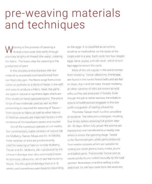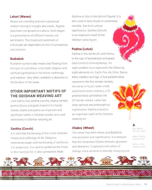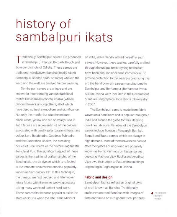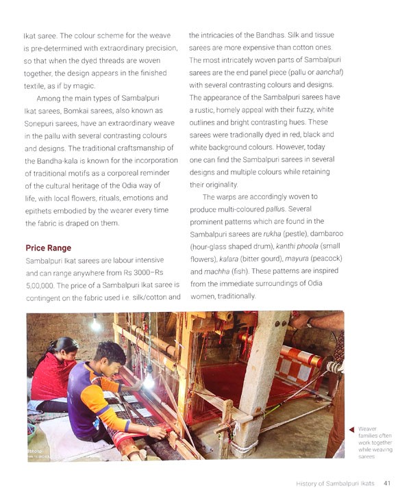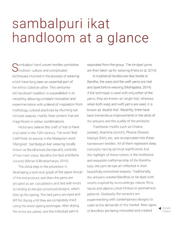 The traditional art of Ikat weaving has travelled across land and sea from Malaysia, and the Sambalpuri Ikat is one of the best-kept secrets of Odisha. The iconic motifs and mathematical precision of the designs, traced by feathery outlines of white with extravagantly contrasting colours are only achievable by enormous labour and creativity, which Sarita Mishra has documented in this volume from years of research. Highlighting the traditional handloom industry, the varied raw materials, weaving techniques and process, the finished products, the challenges faced by the artisans and initiatives for sustainability at play, the resplendent accompanying photographs pay an invigorating tribute to the steadfast hardwork of generations of numerous craftsmen.