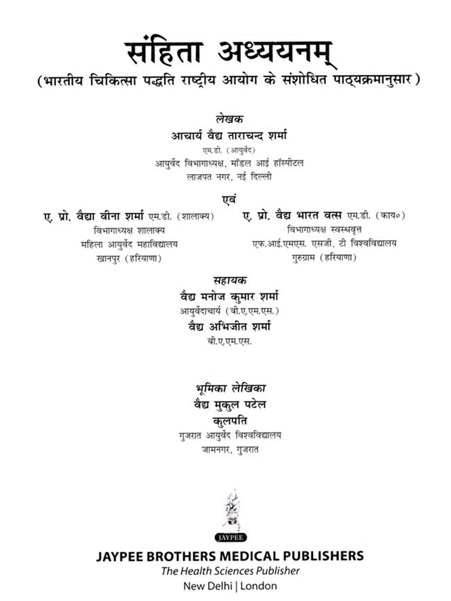 लेखक आचार्य वैद्य ताराचन्द शर्मा जी ने अनेक विषयों पर छात्रोपयोगी पुस्तकें लिखी है। उसी क्रम में नये पाठ्यक्रम की संस्कृत विषय के साथ संहिता अध्ययनम् भी प्रथम बार लिखी गई है। आपने अनेक वर्षों तक अध्यापन कार्य किया है एवं मूलचन्द हॉस्पीटल में वरिष्ठ अनुसंधान अधिकारी भी रहे हैं। वर्तमान में आचार्य जी दिल्ली के संस्कृत आयुर्वेद विद्वान, जाने माने वरिष्ठ नाड़ी चिकित्सक एवं विद्यापीठ के राष्ट्रीय चिकित्सक गुरु तथा अखिल भारतीय आयुर्वेद महासम्मेलन में विद्यापीठाध्यक्ष हैं।
