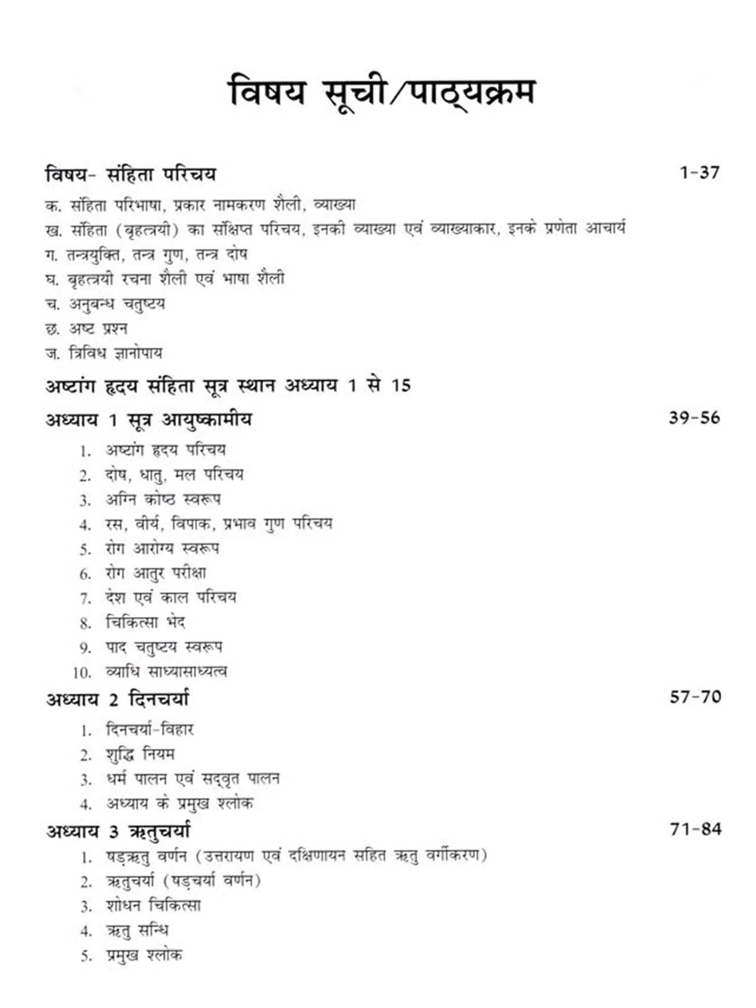 आयोग द्वारा पाठ्यक्रम परिवर्तित एवं परिवर्धित किये जाने के क्रम में प्रथम व्यावसायिक से ही यह प्रक्रिया प्रारम्भ करते हुए अष्टांग हृदय के स्थान पर संहिता अध्ययन नामक विषय प्रारम्भ किया है। इसमें अष्टांग हृदय सूत्र स्थान के 15 एवं चरक सूत्र स्थान के एक से बारह अध्यायों को लिया है। साथ ही संहिता परिभाषा, नामकरण, बृहत्त्रयी एवं लघुत्त्रयी इनके प्रणेता, आचार्य, व्याख्याकार, प्रतिसंस्कर्ता एवं व्याख्या वर्णन, तन्त्रयुक्ति, तन्त्र गुण दोष, रचना शैली, भाषा शैली, अनुबन्ध, त्रिविध ज्ञानोपाय एवं विशेष अष्ट प्रश्न आदि शास्त्र अध्ययन एवं समझने की दृष्टि से पाठ्यक्रम में दिये हैं। जिनकी आवश्यकता भी थी।
