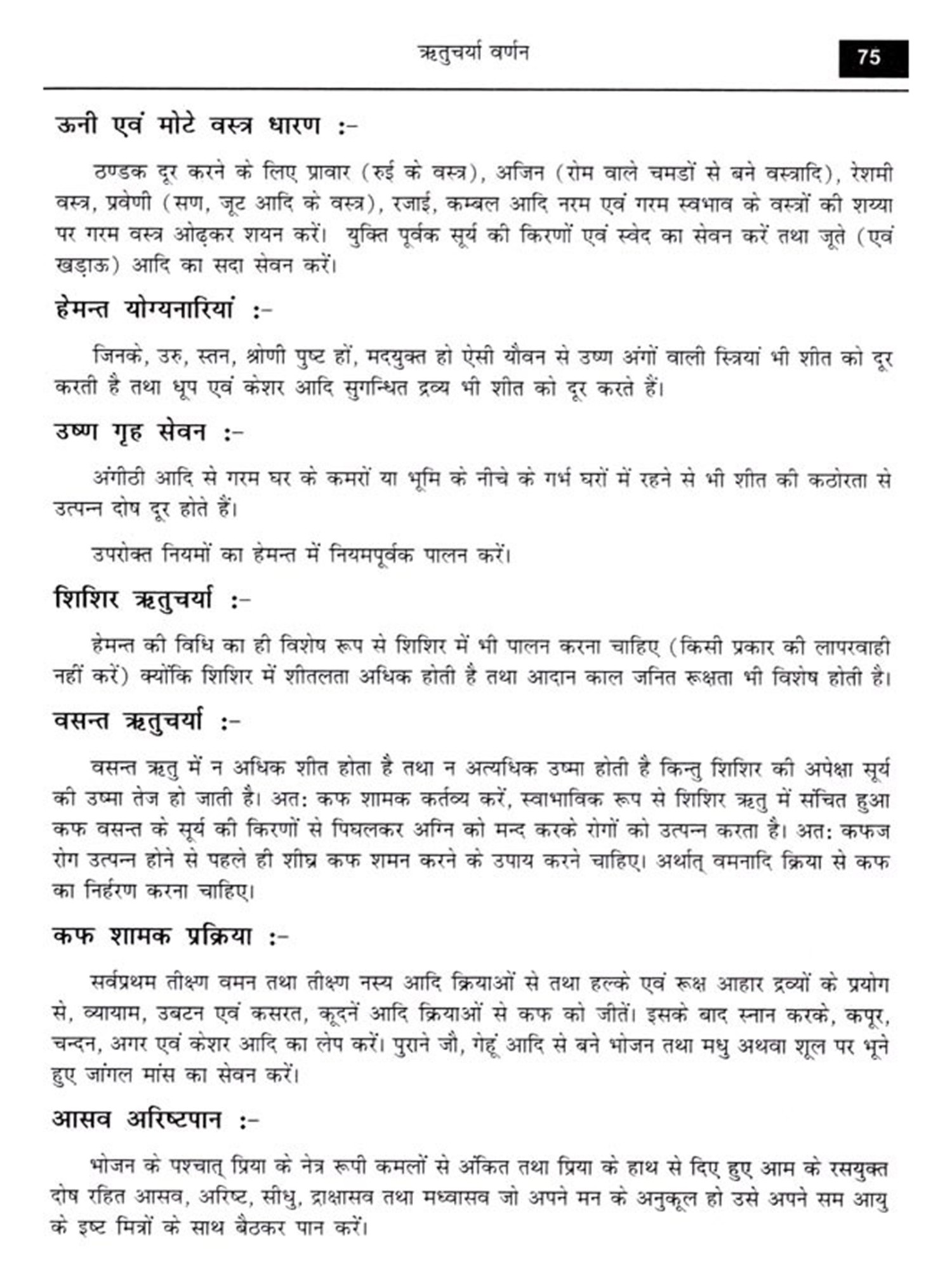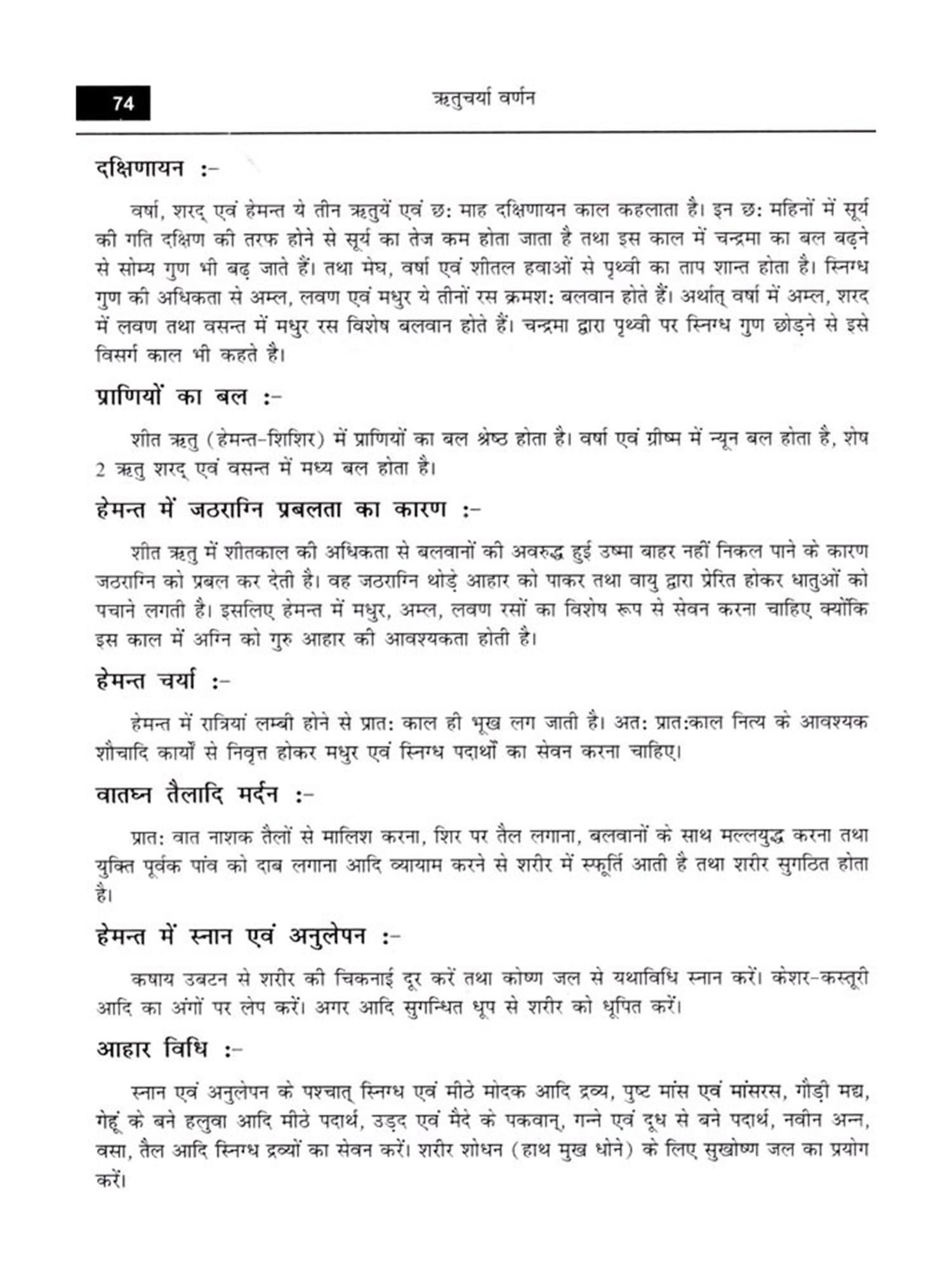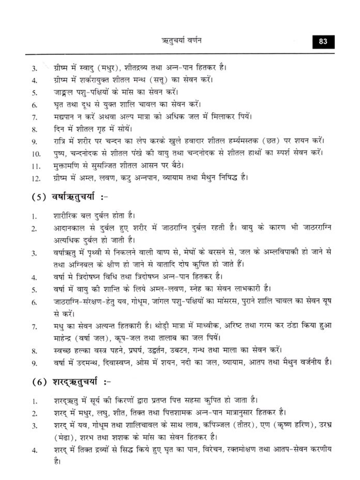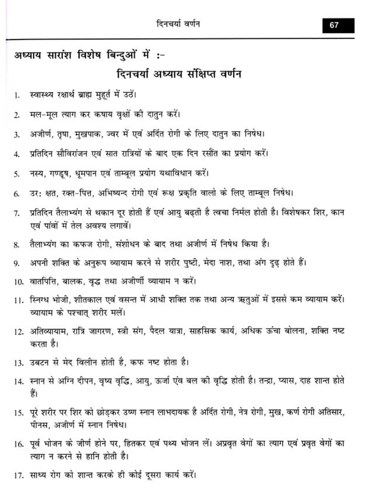 पुस्तक में यथावश्यक सभी बिन्दुओं पर उपयोगिता की दृष्टि से प्रकाश डाला है। साथ ही प्रत्येक अध्याय में आये विशेष विषय यथा उपवास से ओटोफैगी प्रक्रिया, मेन्टल हेल्थ एवं माइक्रोबायोटा, प्रकृति की आधुनिक परिपेक्ष्य में समीक्षा, कर्क एवं मकर संक्रान्ति की दोनो अयनों के निर्माण में आधुनिक विचारधारा, दिनचर्या का सर्केडियन रिम बनाने में भूमिका, स्नेहाभ्यंग से ऊतक पोषण की प्रक्रिया आदि अनेक प्रसंगों को स्पष्ट किया है।