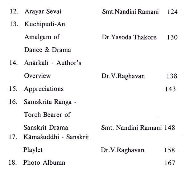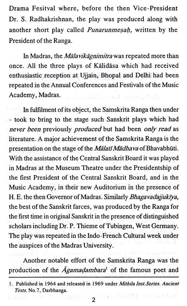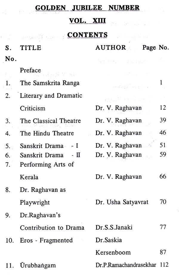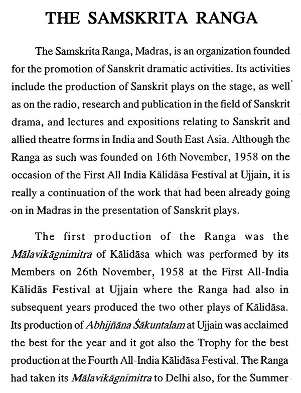 The present volume contains a collection of valuable material on Sanskrit Drama and related topics of interest, a major part of which covers some of the collected writings of Dr.Raghavan including some unpublished ones also; Samskrita Ranga's work, and the contribution of its founder as a dramatist are described through certain articles, while there are some others focusing on other art forms like Kachipudi dance and Arayar Sevai, a ritualistic dance ; an analysis of the play Orubhangam, is yet another one from one of Ranga's actor-member. Appreciation of Ranga's plays, a list of its productions over the past five decades and an interesting collection of Photographs from different produc-tions, make this volume a memorable souvenir to mark the occasion. This special volume is placed as a homage to the memory of the Scholar-Savant, founder of Samskrita Ranga -Dr. V. Raghavan.