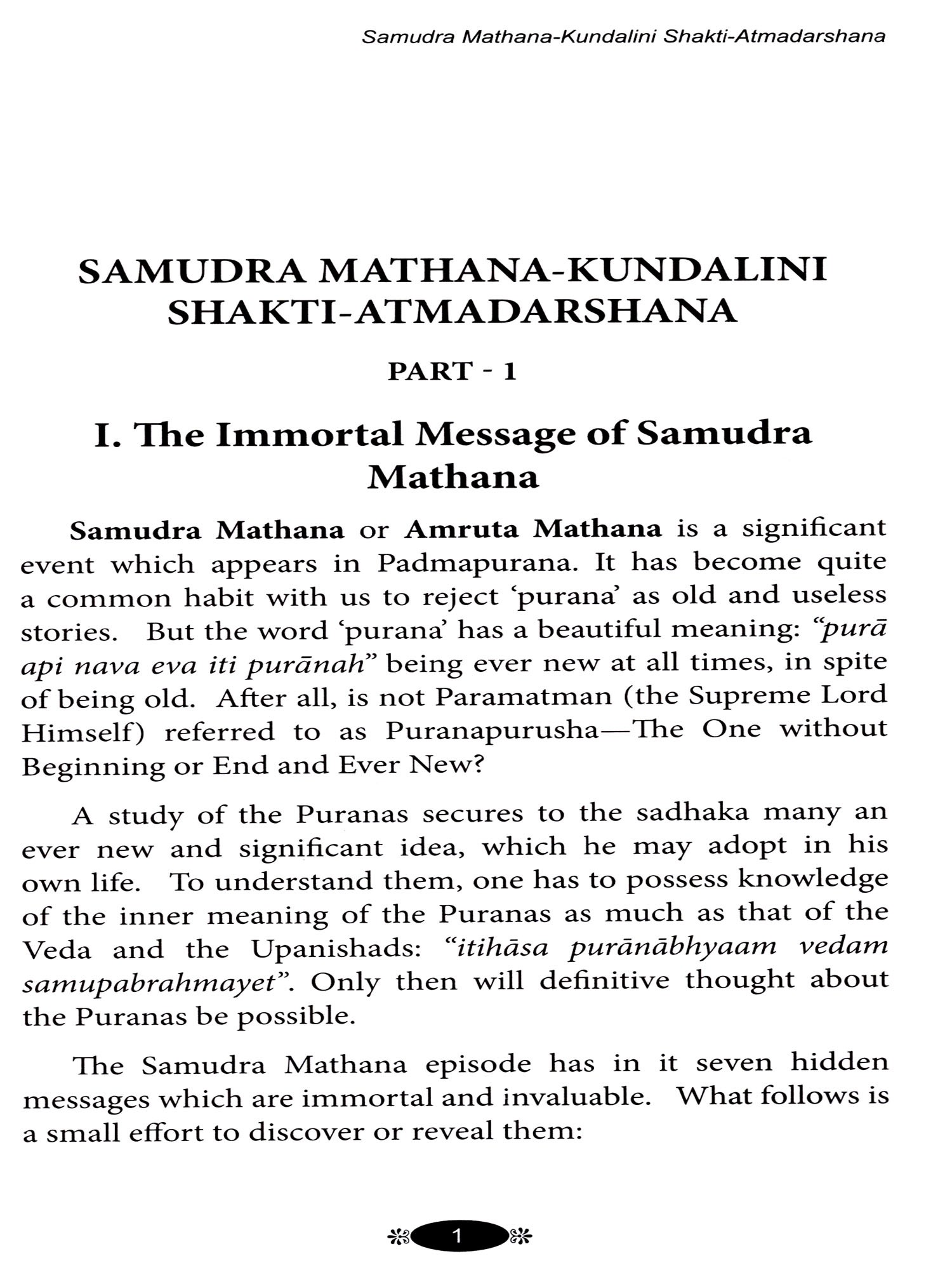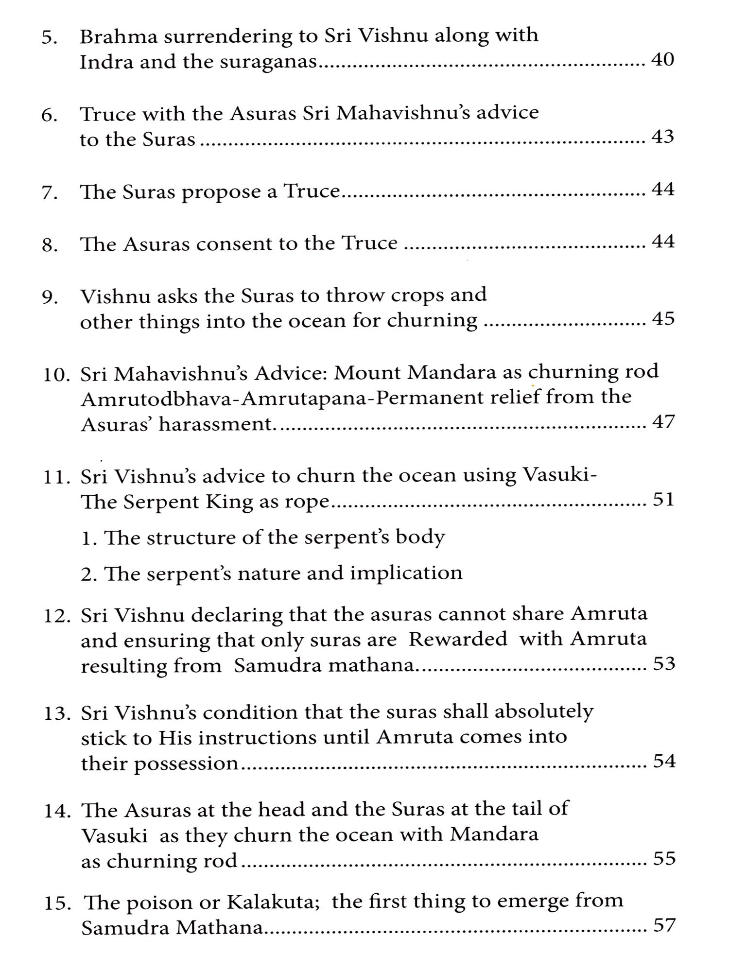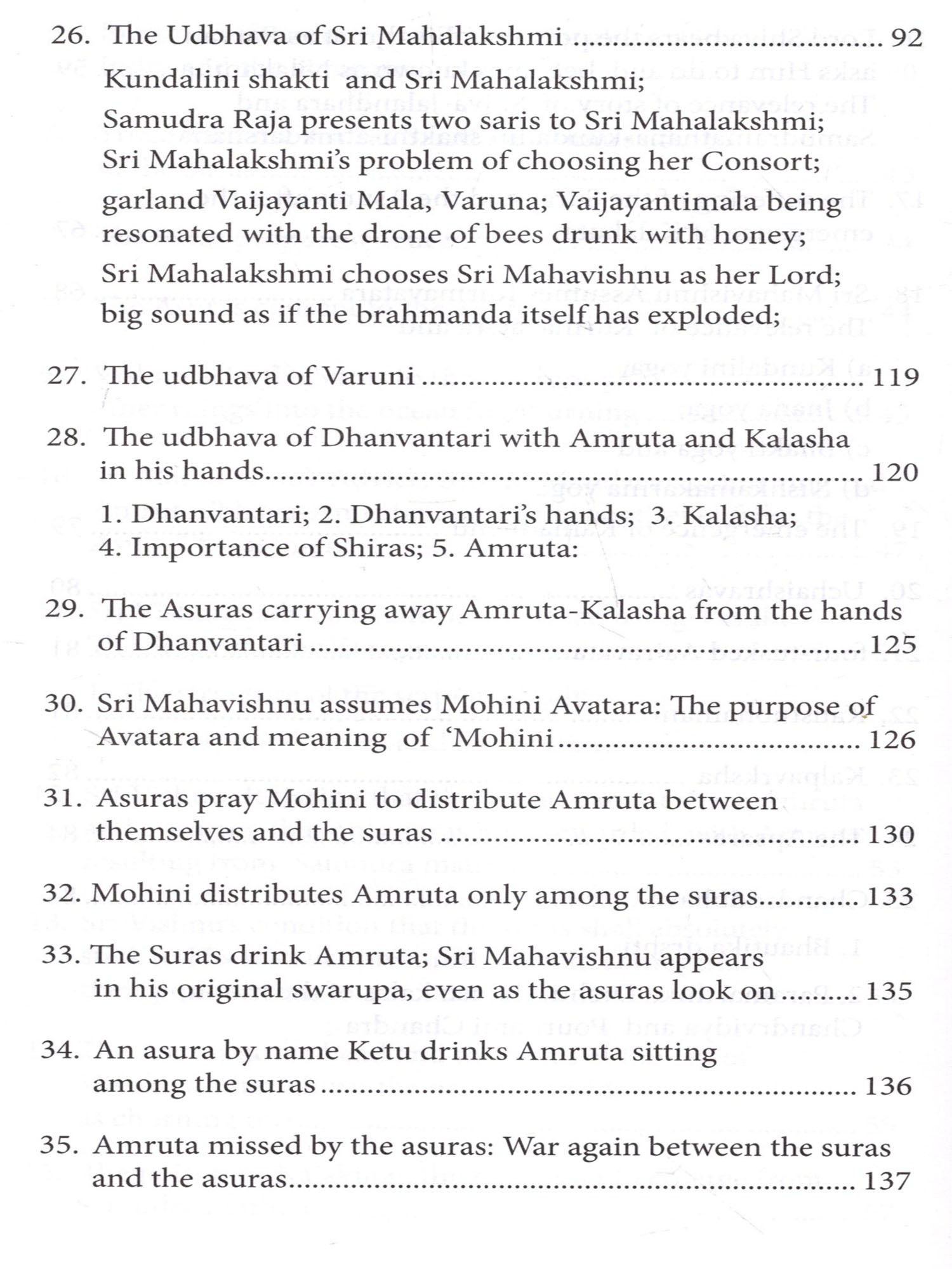 The story of 'Samudra mathana or Amruta mathana' is replete with inner meanings. It has been my conviction for many years that this story illuminates the path of the jivatman and leads him towards atmadarshana. It has embedded in it valuable guidance for the sadhaka-regarding the search for the guru; the guru-tattva; nishkamakarma; viveka; vairagya; bhaktiyoga; jnanayoga and rajayoga or kundalini-yoga. The story also throws light on the visionary and auditory experiences which occur during dhyana. The present book is in the hands of the reader owing to this firm conviction. If the book succeeds in impressing on the reader that The Ramayana, The Mahabharata and our Puranas are not to be looked upon as mere concocted stories; that, on the contrary, emanating from the springs of our sanatana dharma, they have great and universal messages to the whole of mankind.