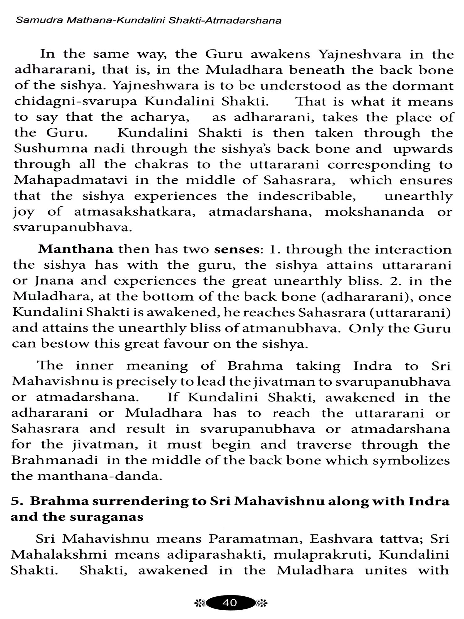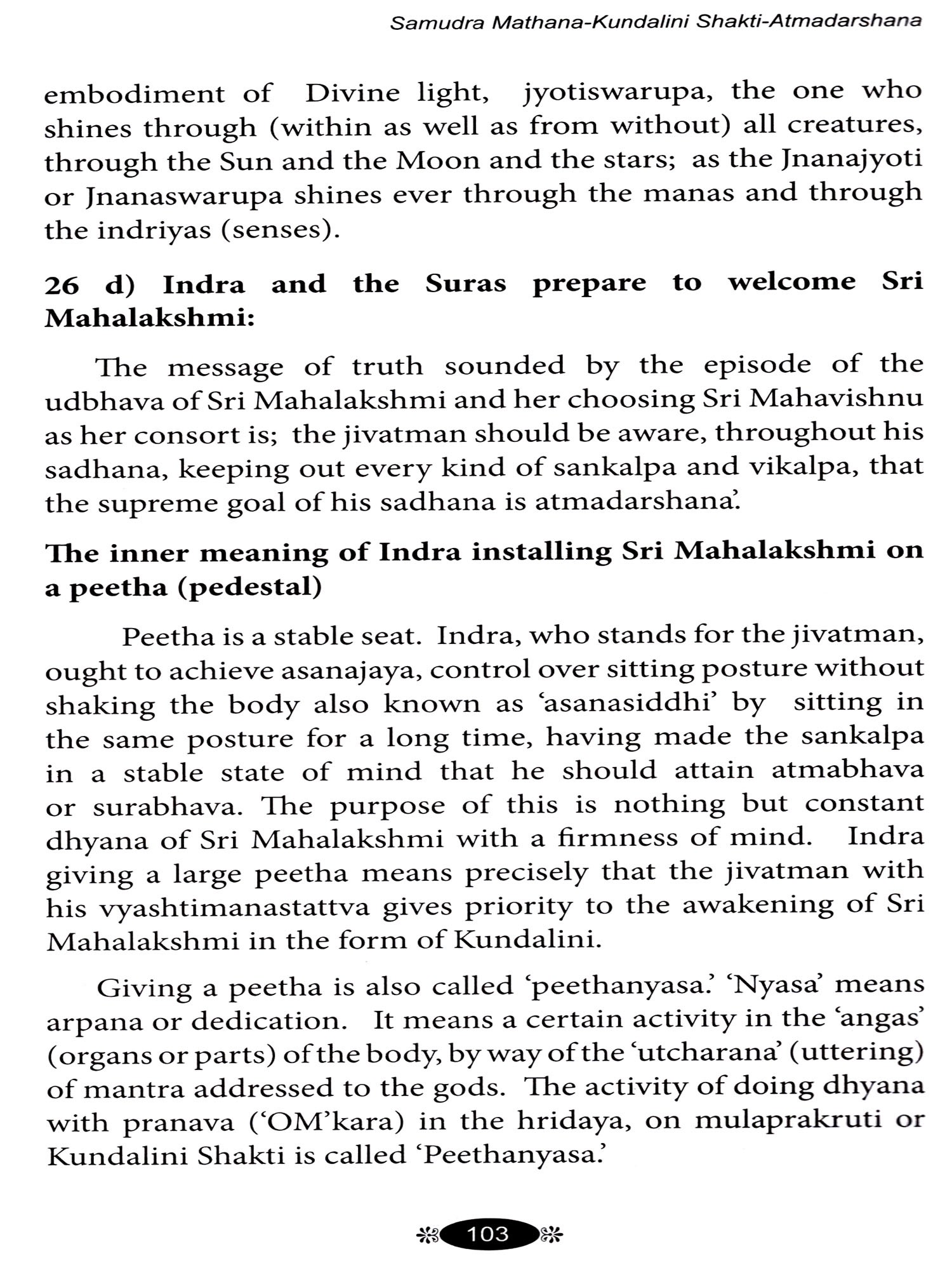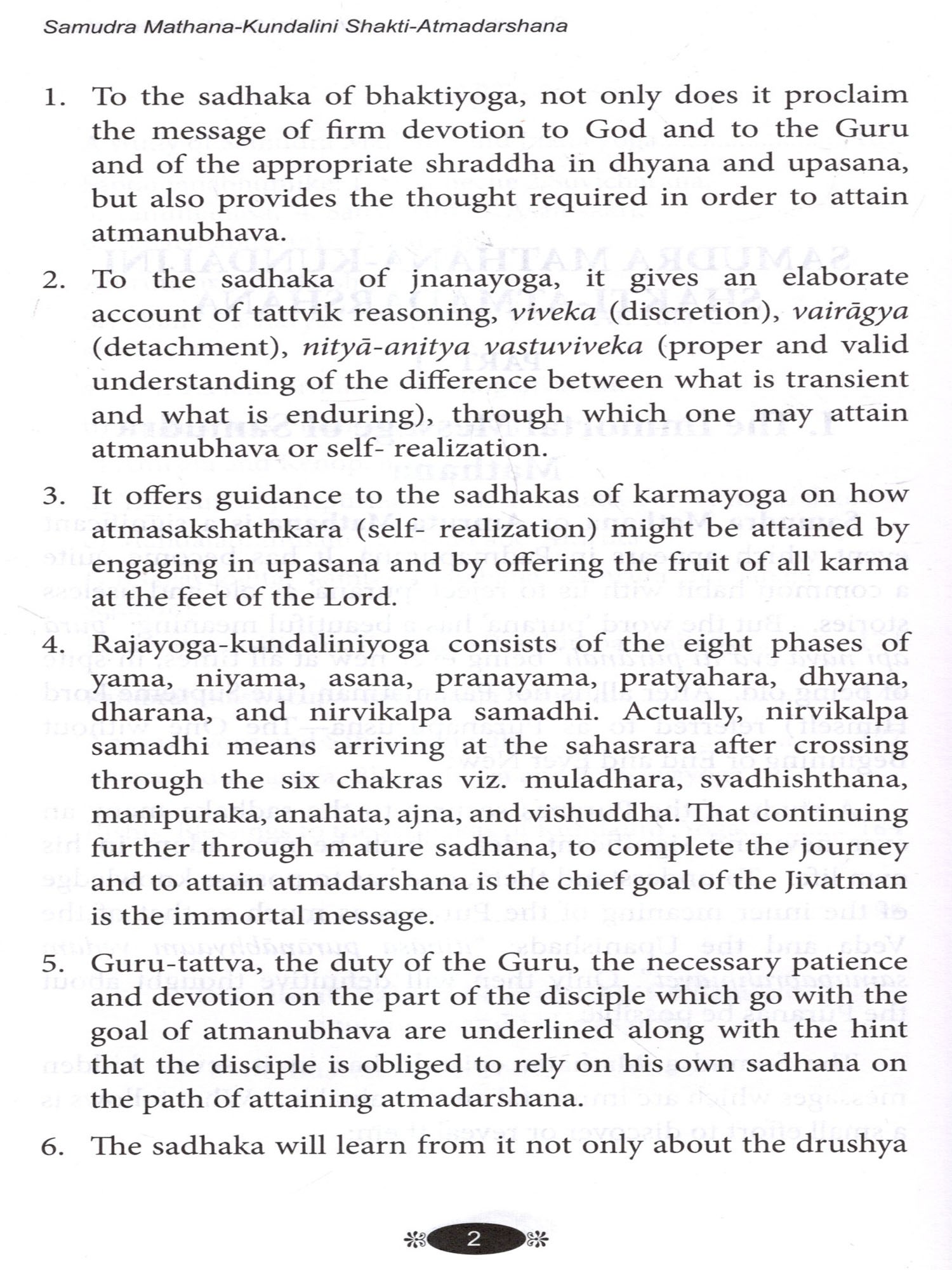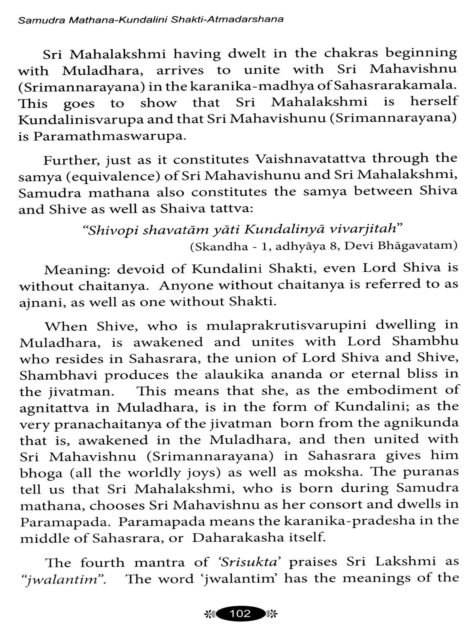 The story of 'Samudra mathana or Amruta mathana' is replete with inner meanings. It has been my conviction for many years that this story illuminates the path of the jivatman and leads him towards atmadarshana. It has embedded in it valuable guidance for the sadhaka-regarding the search for the guru; the guru-tattva; nishkamakarma; viveka; vairagya; bhaktiyoga; jnanayoga and rajayoga or kundalini-yoga. The story also throws light on the visionary and auditory experiences which occur during dhyana. The present book is in the hands of the reader owing to this firm conviction. If the book succeeds in impressing on the reader that The Ramayana, The Mahabharata and our Puranas are not to be looked upon as mere concocted stories; that, on the contrary, emanating from the springs of our sanatana dharma, they have great and universal messages to the whole of mankind.