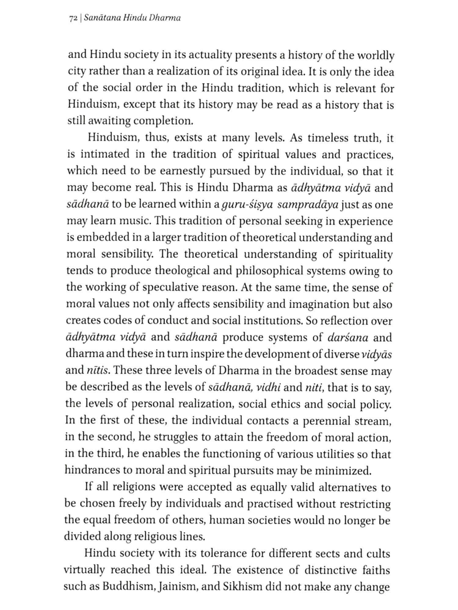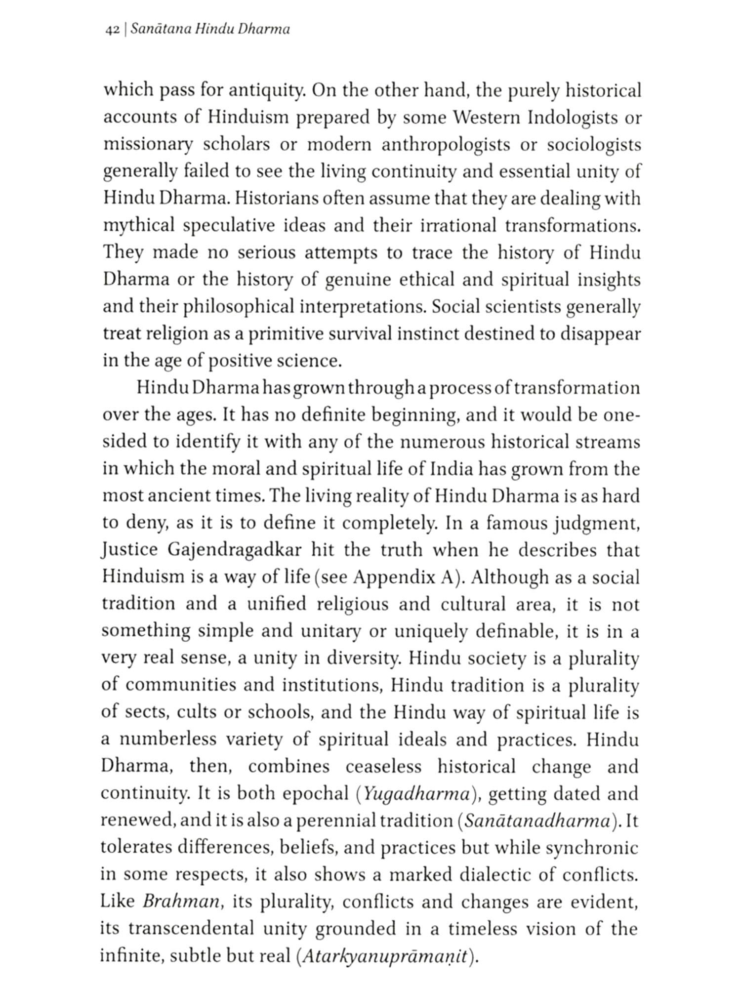 This small book is not intended to provide a history of Hindu Dharma. Nor does it attempt to survey the customs and beliefs current in Hindu society in its numberless segments. What it seeks to do is to present an outline of the spiritual philosophy and practice, which constitute the essence of Hindu Dharma. Incidentally, it also raises some questions about the present reality and historical features of Hindu Dharma.