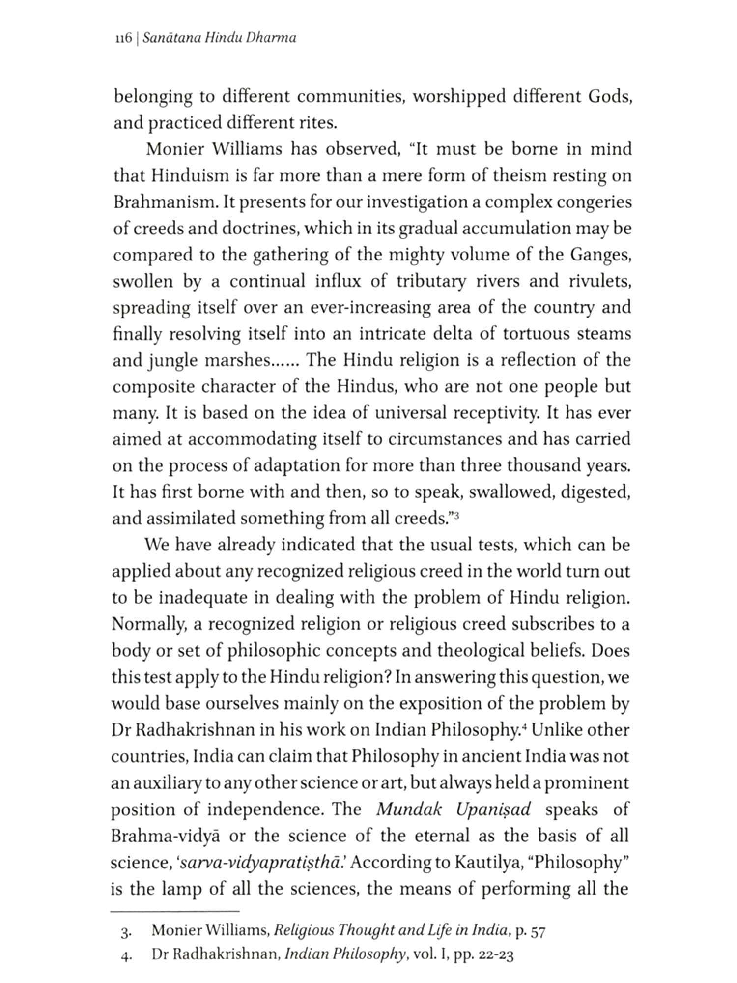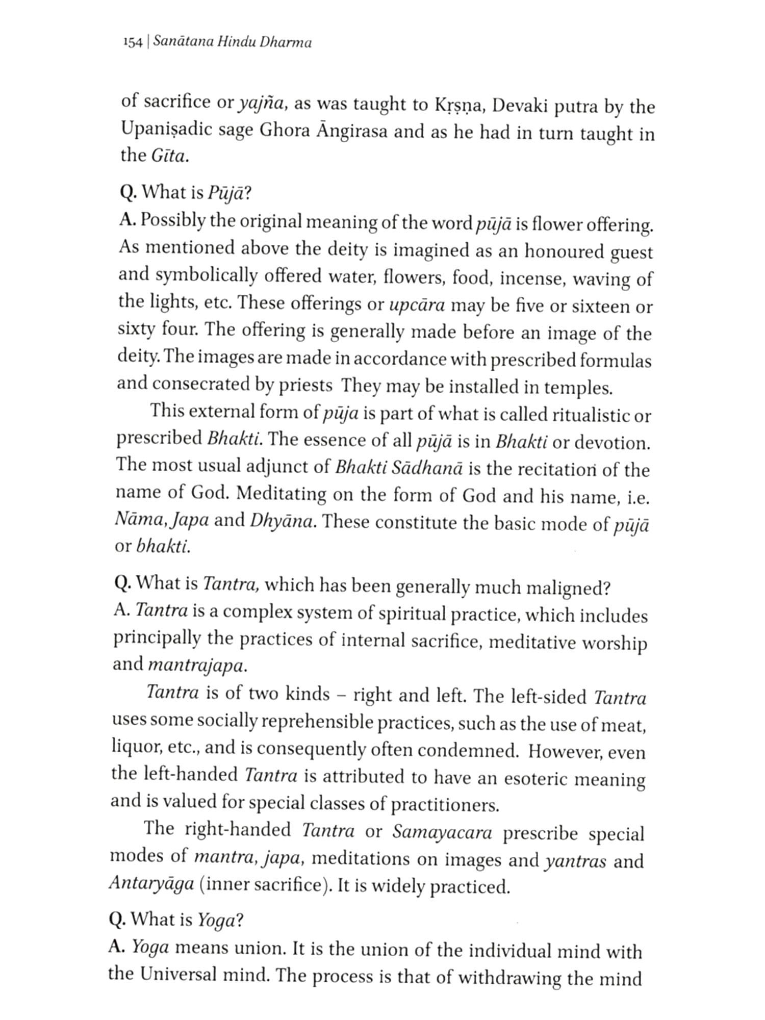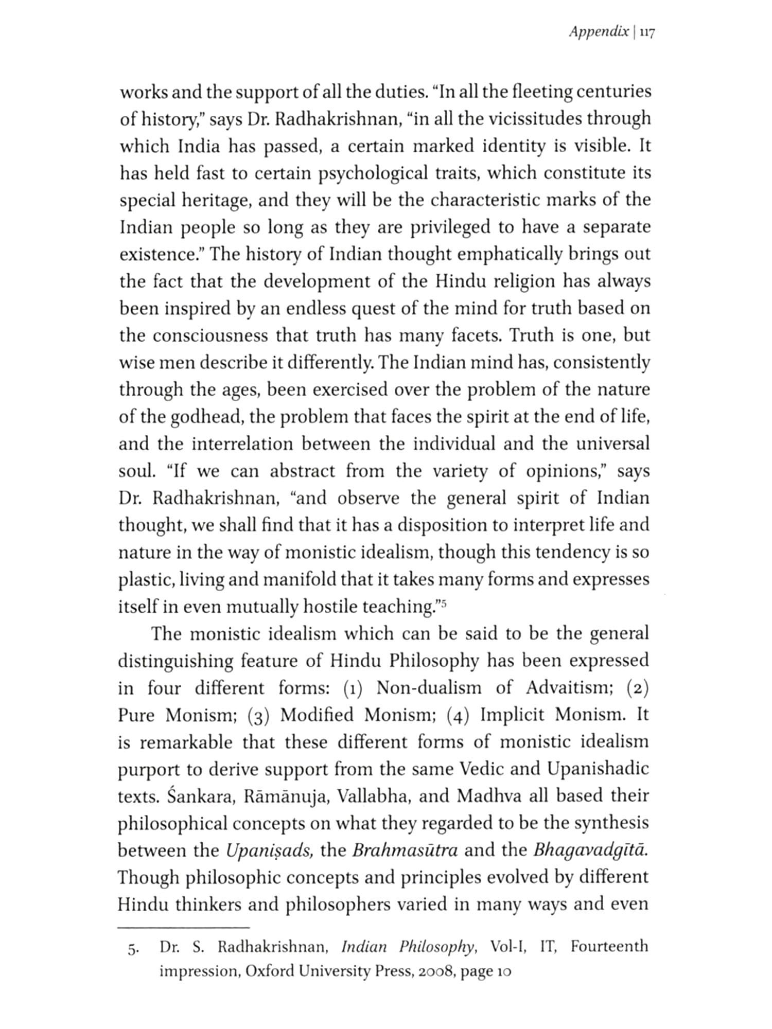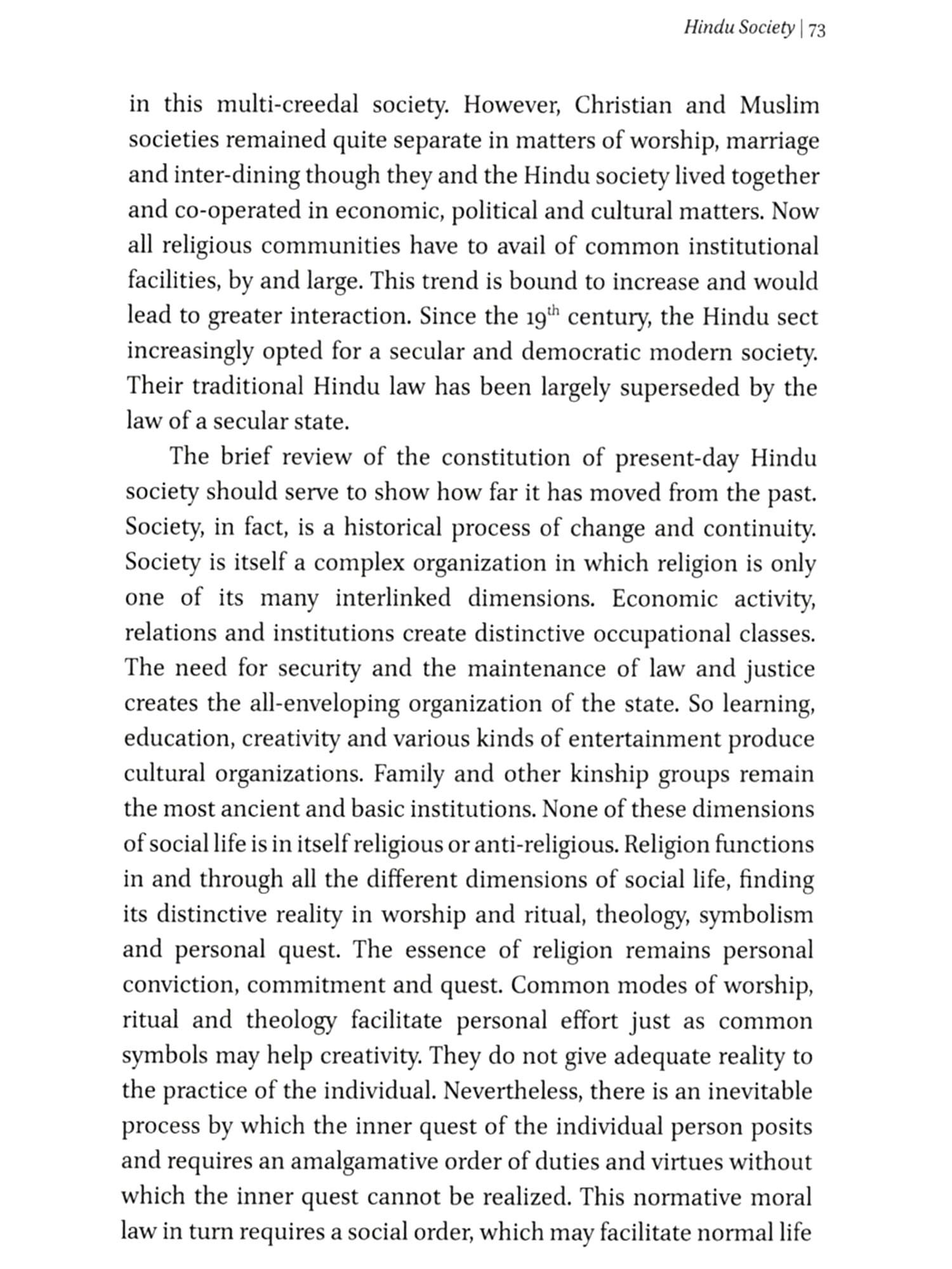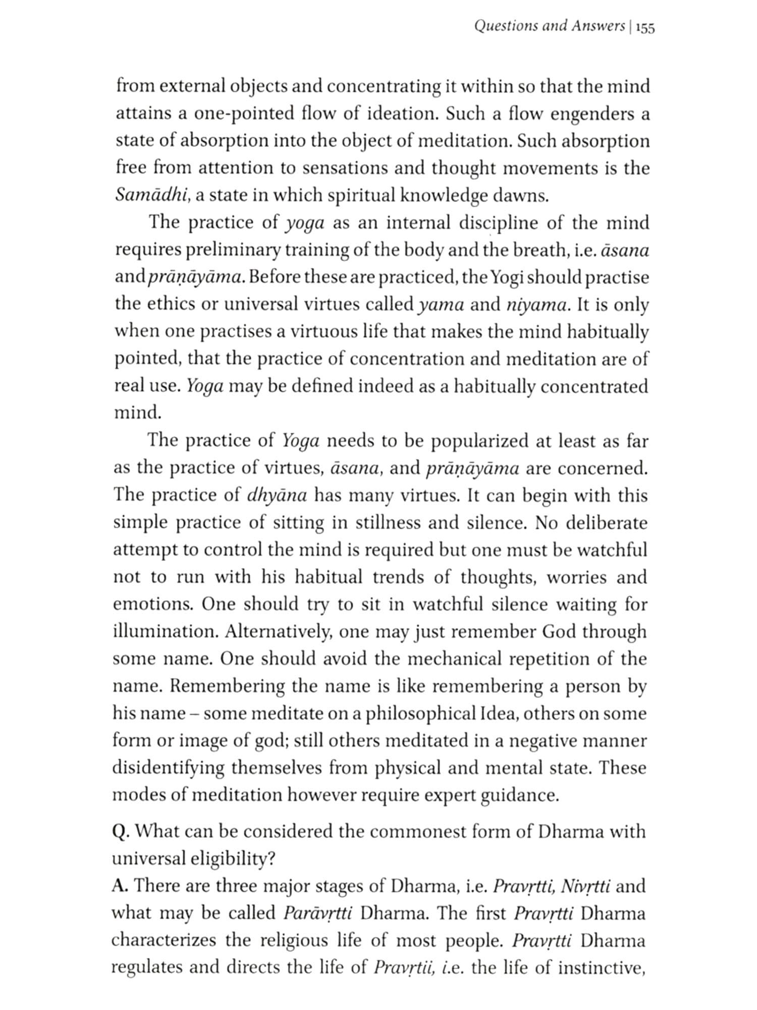 The third section as a set of Q and A offers a precise and lucid exposition of complex ideas and diverse interpretations emerging in the antecedent sections, highlighting their affinities and differences, and their dialectical synthesis, reiterating that Hindu Dharma is not an 'ism' in the usual sense as it is not constituted by any defined system of dogmas, nor religious authoritarianism.