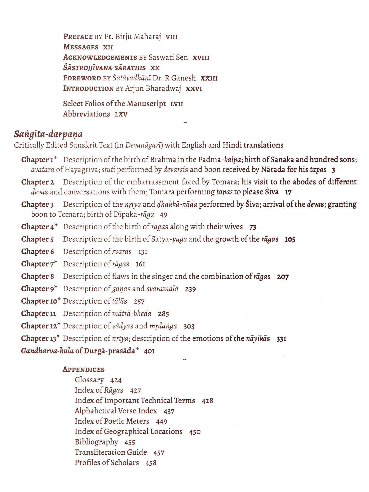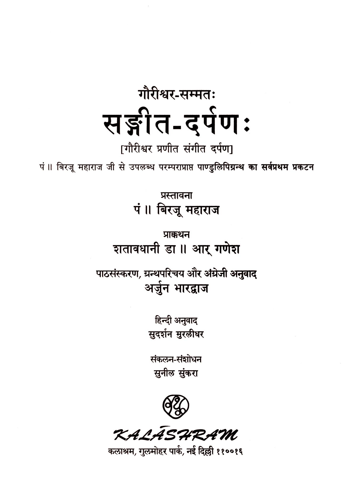 THE CURRENT WORK titled Sangita-darpasa attributed to Gaurisvara is based on the manuscript material that has been safeguarded by Padma Vibhushan Pt. Birju Maharaj and his ancestors for about two centuries. The current work is the first publication of its critically edited Sanskrit text with accompanying translation and elaborate notes. The treatise provides valuable insights into music and dance of the medieval period and also serves as a historical documentation of the artistic thoughts of the author. Along with some hitherto unseen features, the treatise documents aspects which can be put in practice especially with respect to dance.