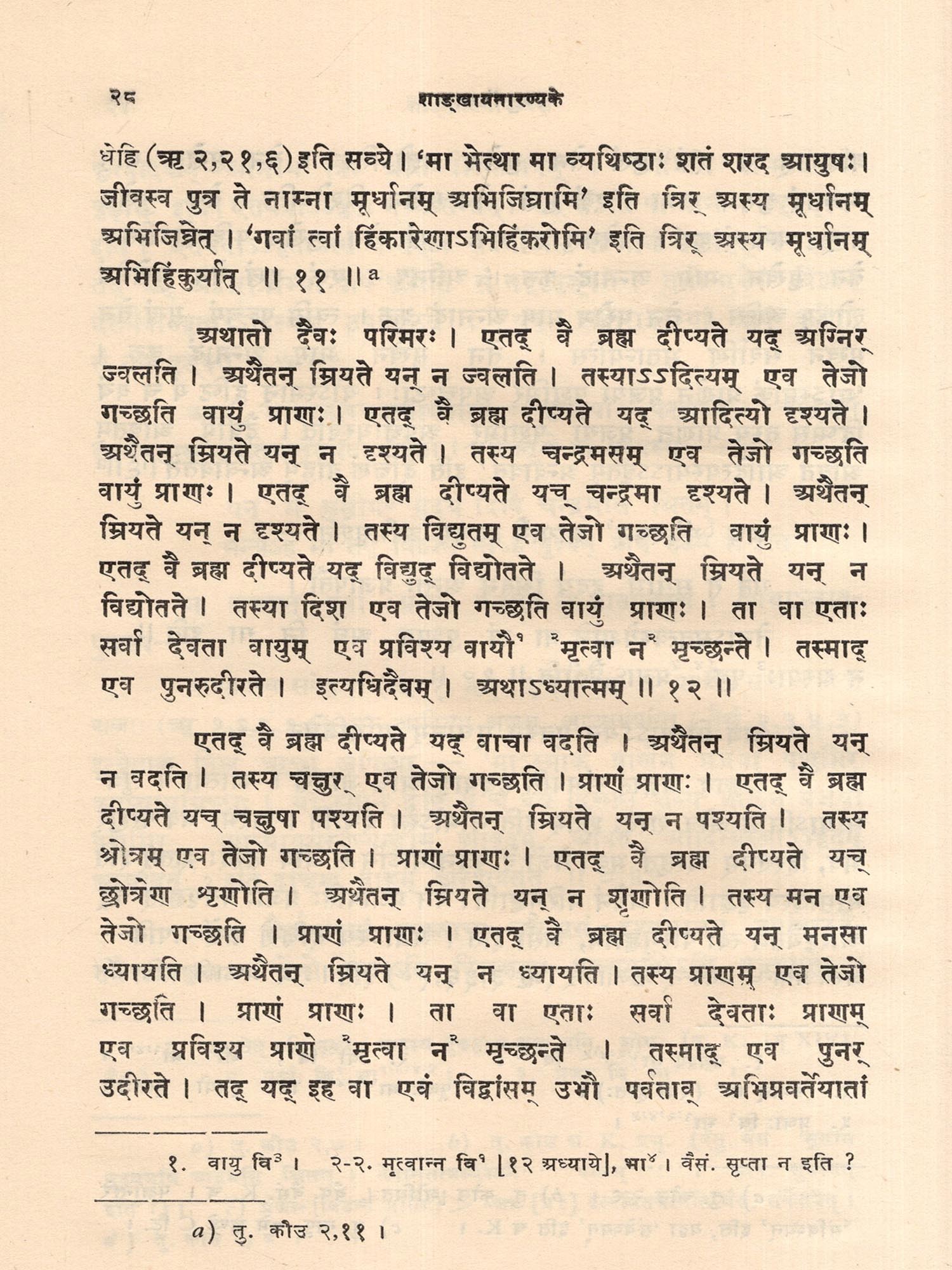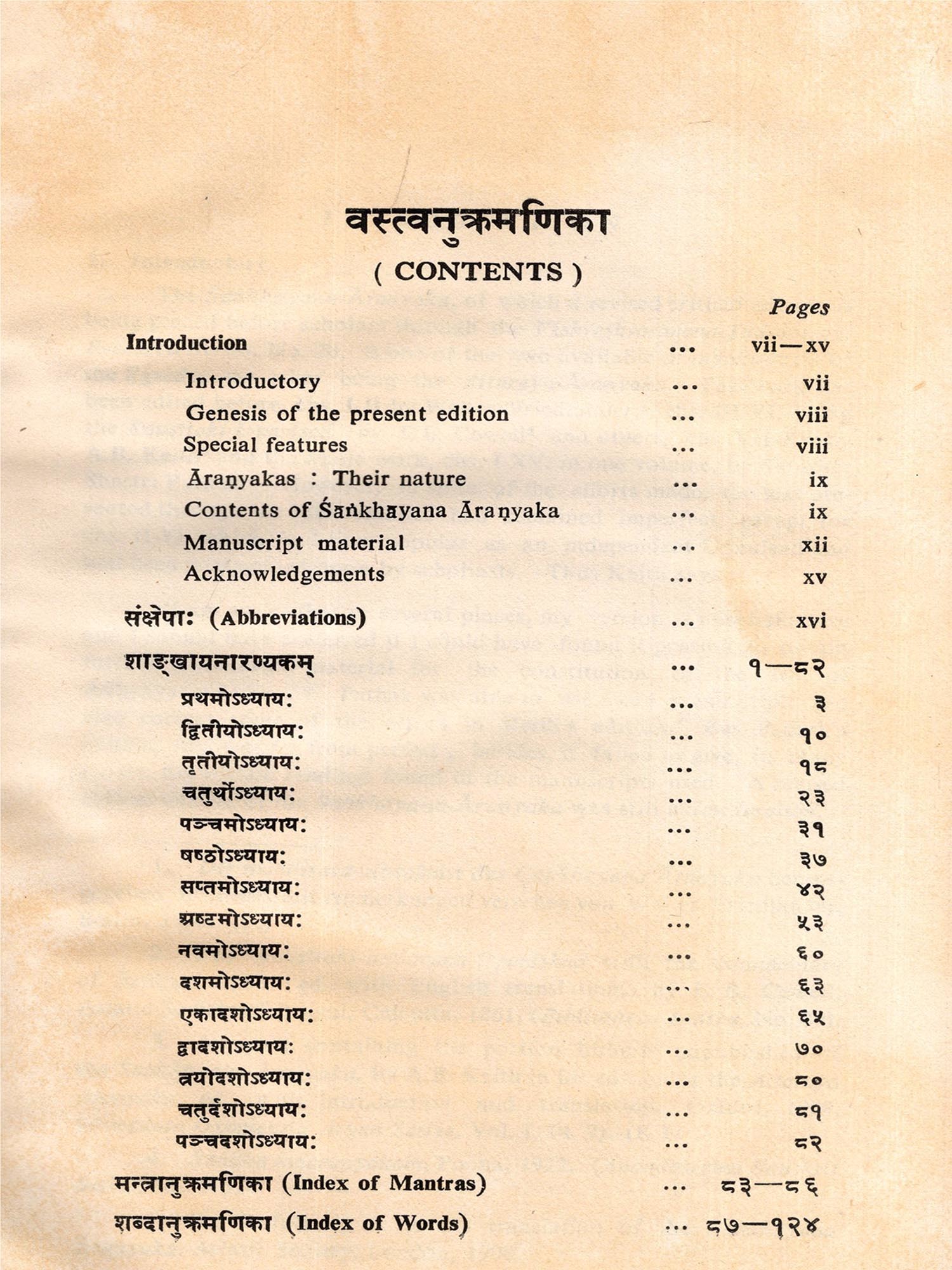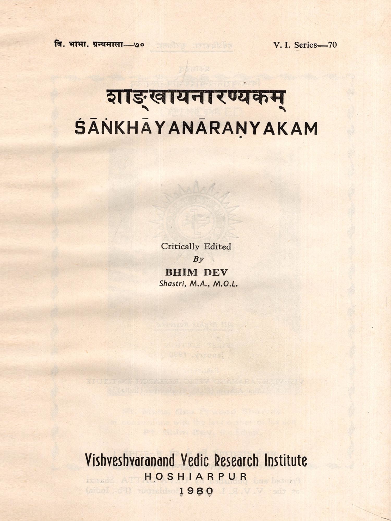 The Sankhayana-Aranyaka, of which a revised critical edition is being placed before scholars through the Vishveshvaranand Indological Research Series, No. 70, is one of the two available aranyaka-texts of the Rgveda, the other being the Aitareya-Aranyaka. This work has been edited before, chs. I-II by Walter Friedlander, chs. III-VI, being the Kausitaki-Upanisad, by E.B. Cowell and others, chs. VII-XV by A.B. Keith and the whole work, chs. I-XV, in one volume, by Shridhar Shastri Pathak. However, in spite of the efforts made, the text pre-sented through the said editions had remained imperfect, except for chs. II-VI, which had been popular as an independent Upanisad and had been commented upon by scholiasts. Thus Keith says: