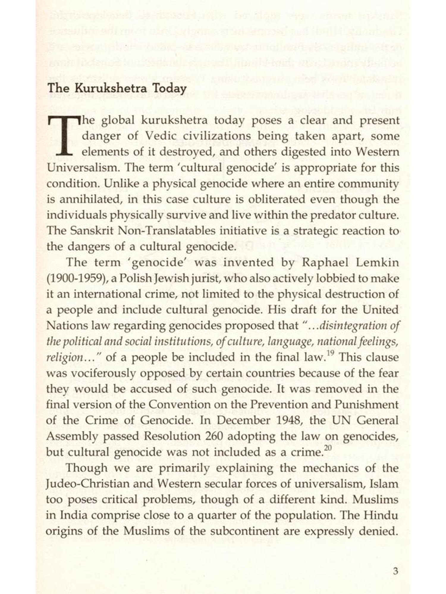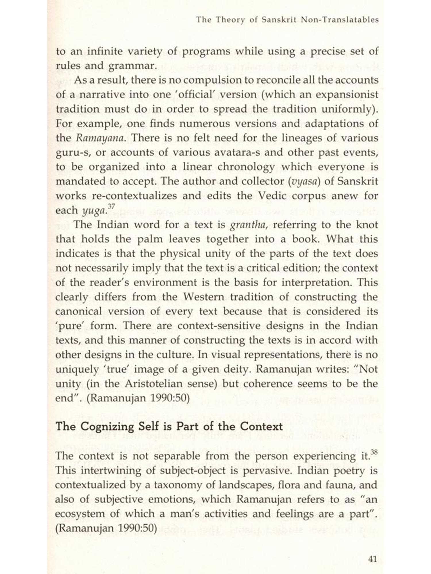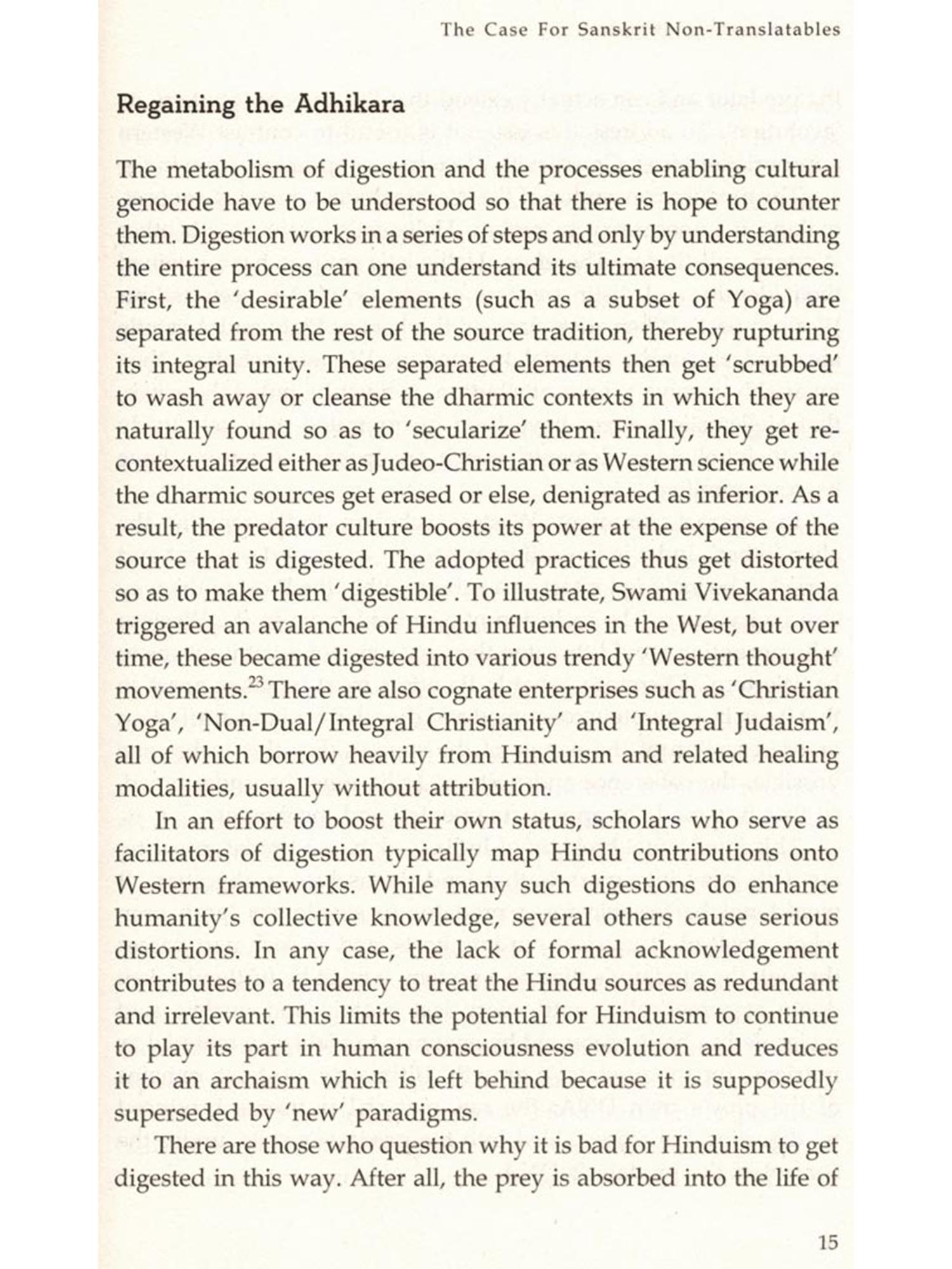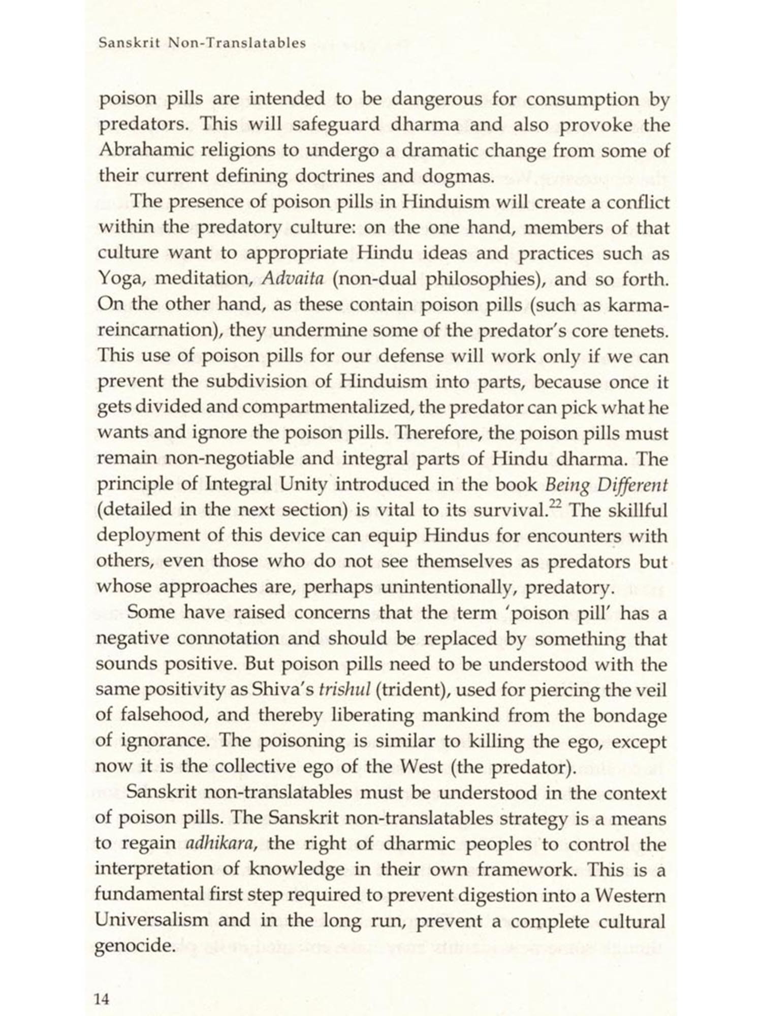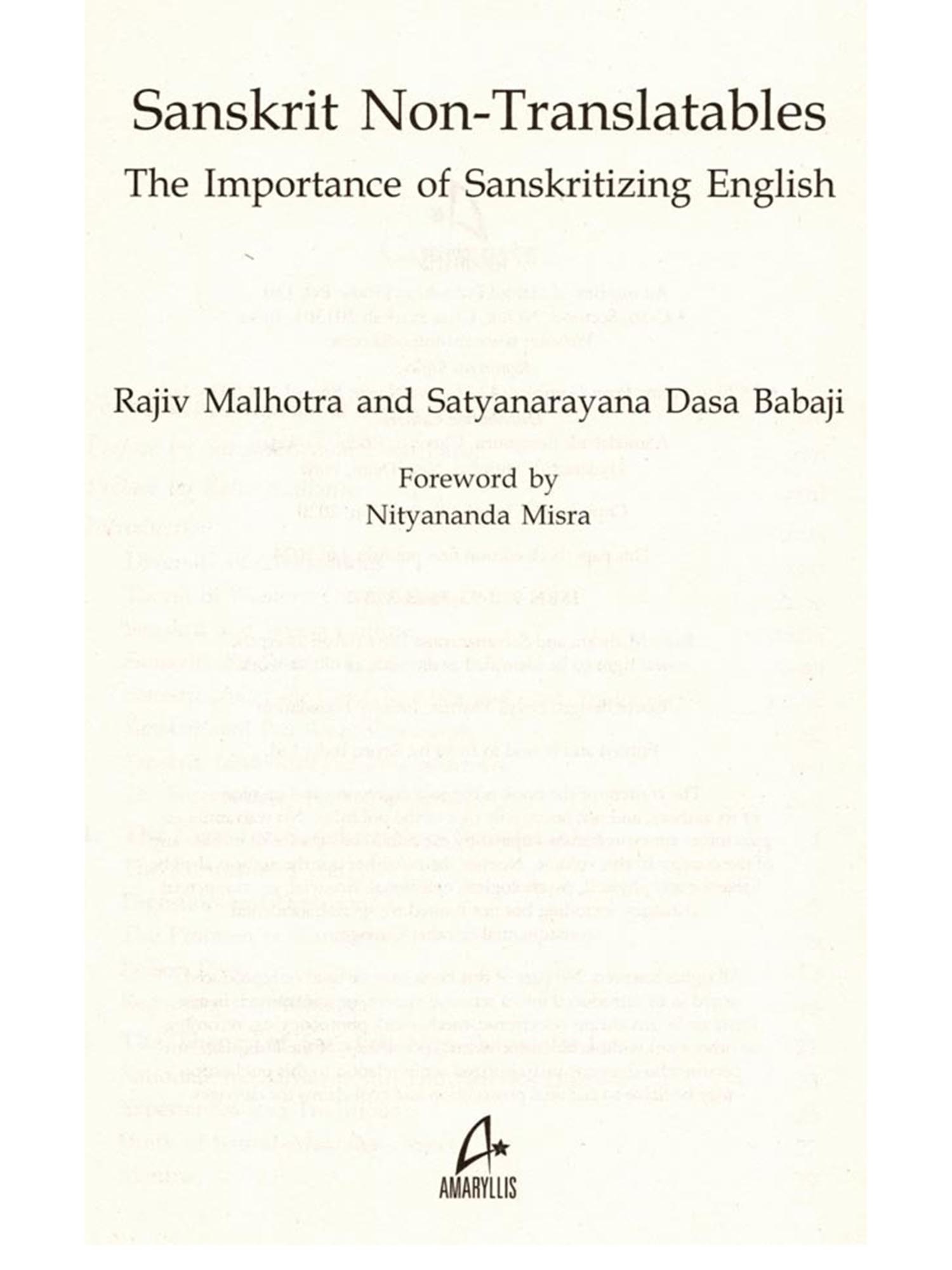We know for a fact that translations of important texts from one language to another can never be wholly effective or completely true and faithful to the original. To truly understand and appreciate Shakespeare, one has to read Shakespeare in the original Elizabethan English. With both concepts and fifty-four examples, Sanskrit Non. Translatables: The Importance of Sanskritizing English vividly shows how the lost in translation' effect is amplified manifold when translating from a highly structured, refined, rich, and potent language like Sanskrit to a language like English. Readers of the book will realize how translations of Sanskrit texts into Hindi or other Indian languages, which retain much of the original Sanskrit vocabulary, are far more effective than translations into English. The translation of the Valmiki Ramayana into English by Robert Goldman (professor of Sanskrit at the University of California, Berkeley) is no doubt good, but the Hindi translation published by Gita Press is undoubtedly better. For a reader who understands Hindi, the latter should be the first preference.