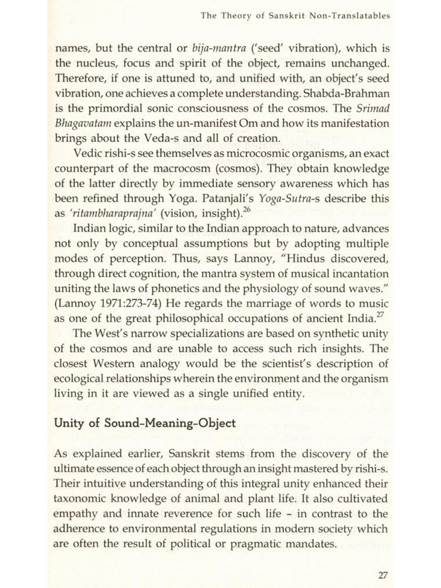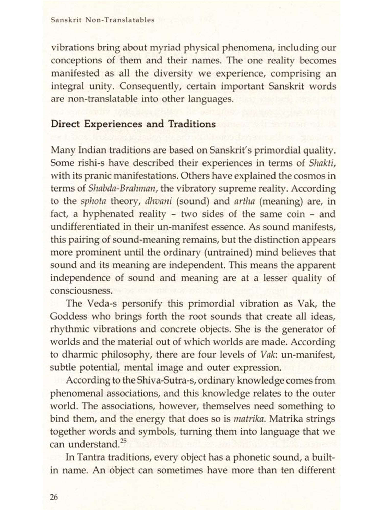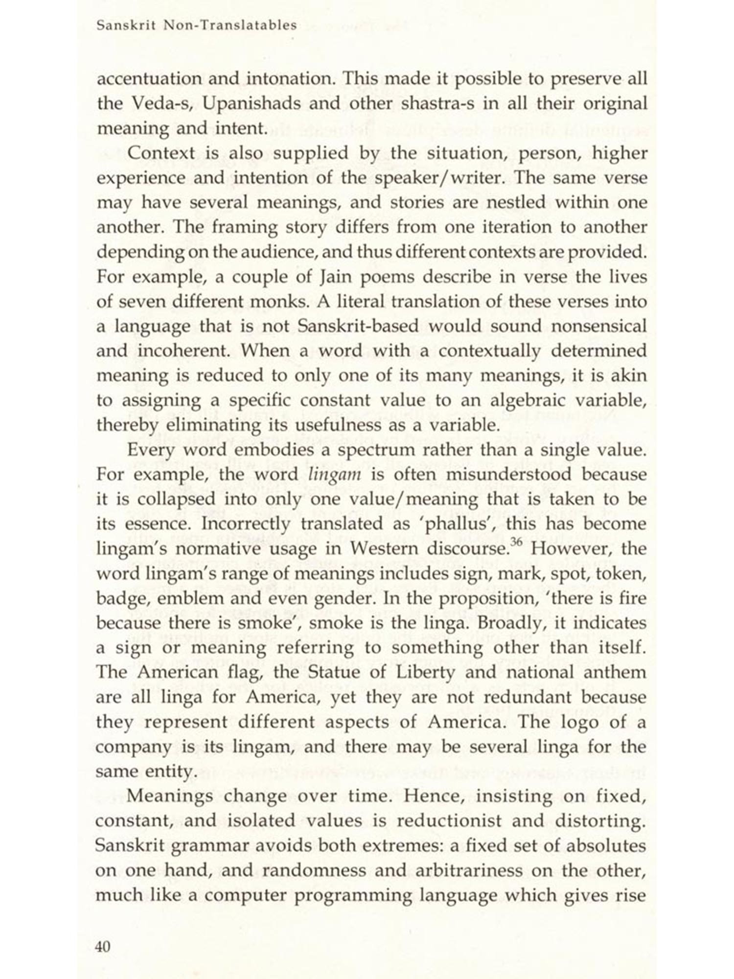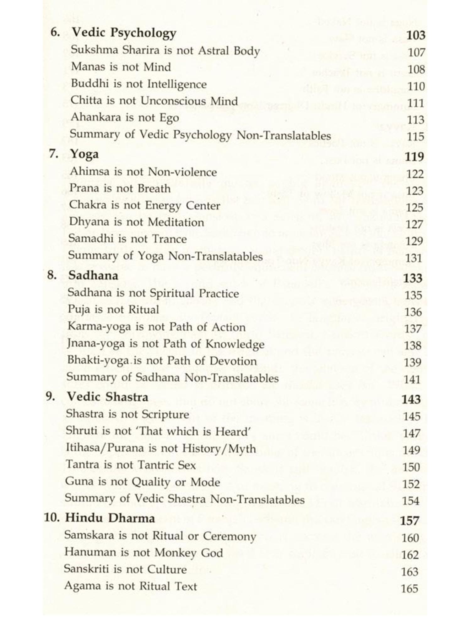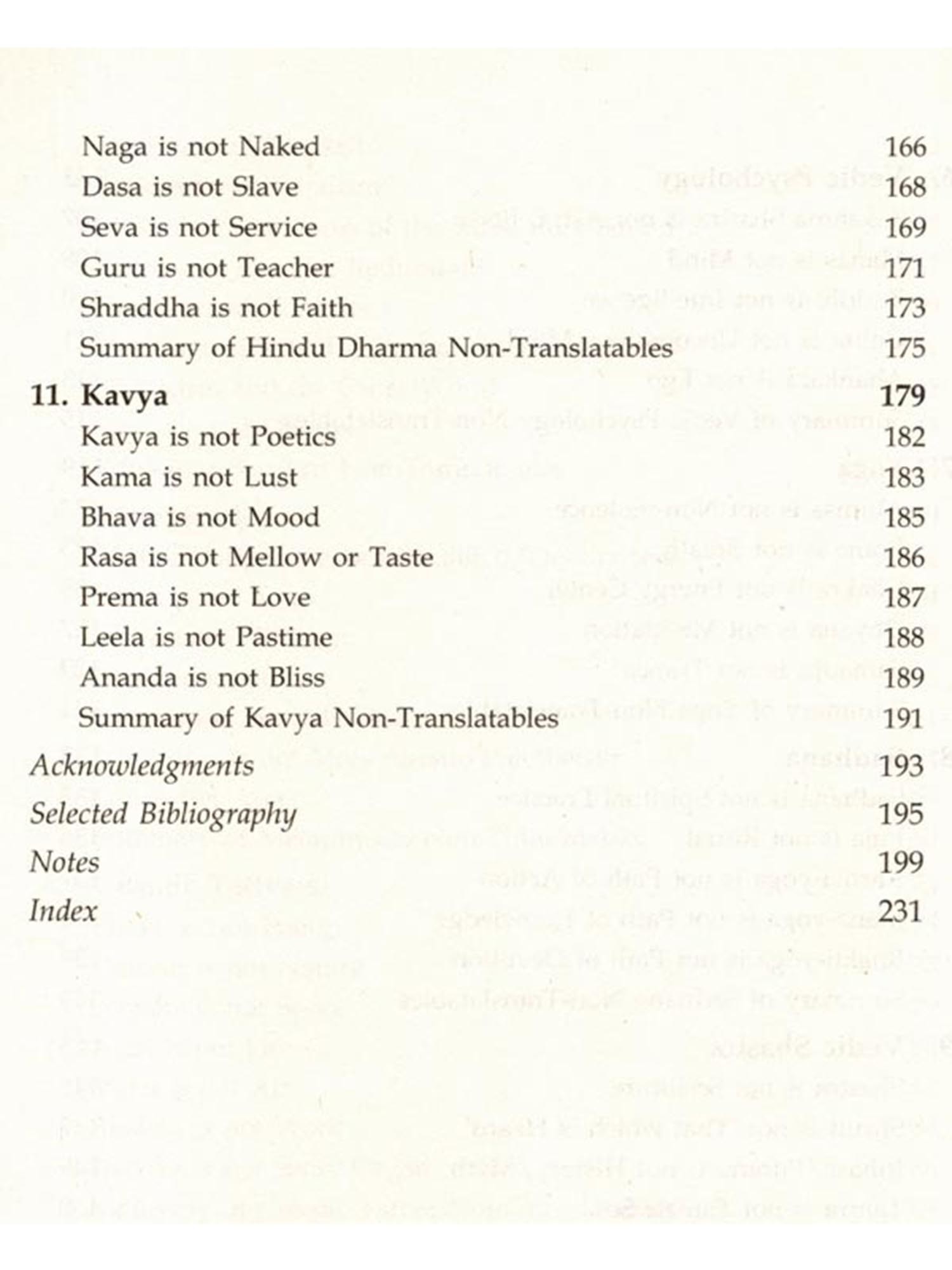 While discussing the non-translatable terms, the authors also throw light on many significant concepts in Hinduism. The discussion on Om clarifies several misconceptions about the word that have recently been made popular by a prominent Hindu guru The discussion on the malabhatas shows how words like 'space', 'fire', and 'air/wind' fail to capture the essence and profound meanings of the words akasha, agui, and wayu. When we say 'space', we do not get an idea of shabda (loose translation, "sound") but the concept of akasha in Hindu philosophy is inextricably linked with the concept of shabda, as the definition of akasha in the Tarkasangraha (a seventeenth century treatise on logic and reasoning by Annambhatta) clarifies: "shabda-gunakam akasham"