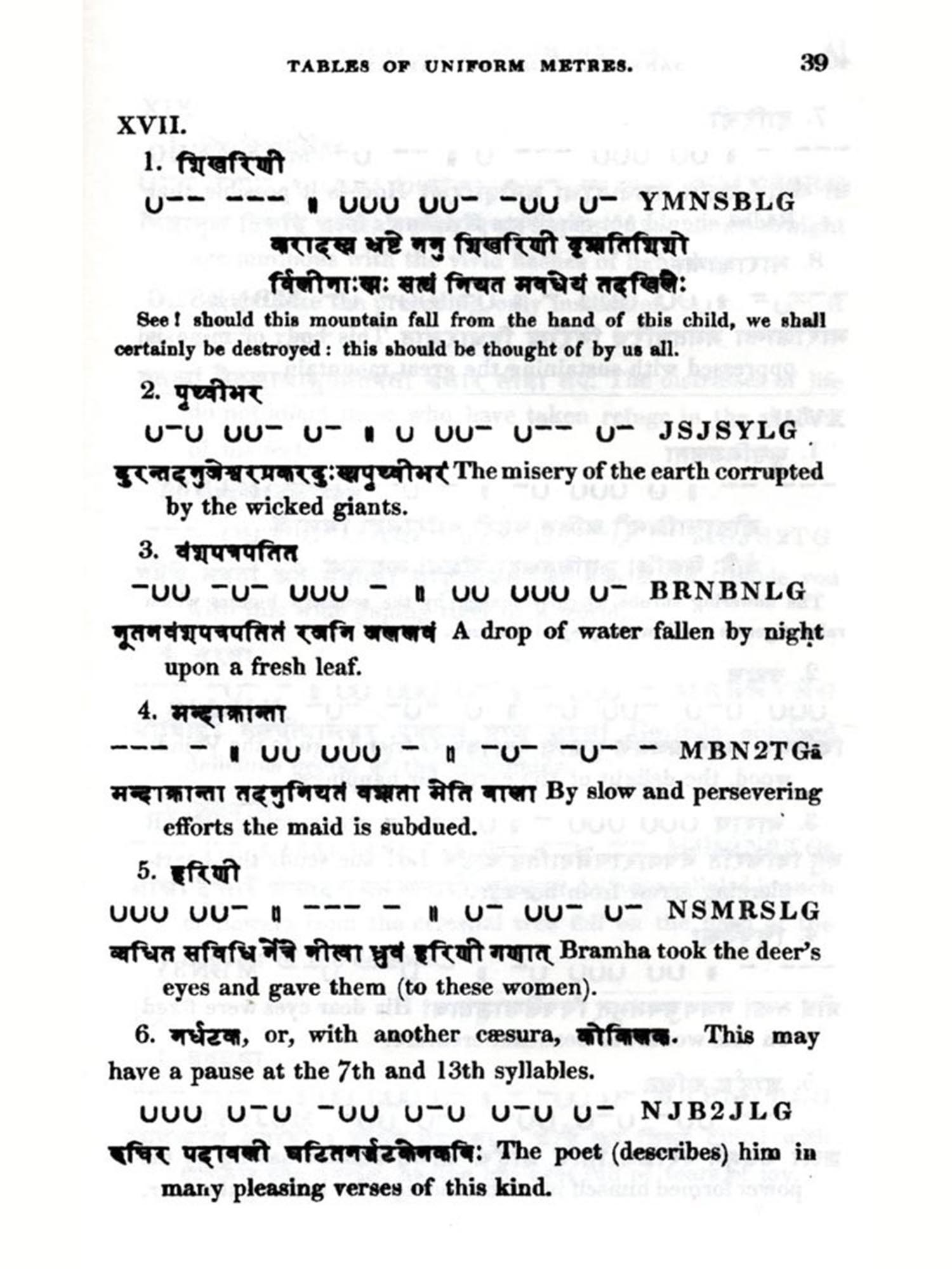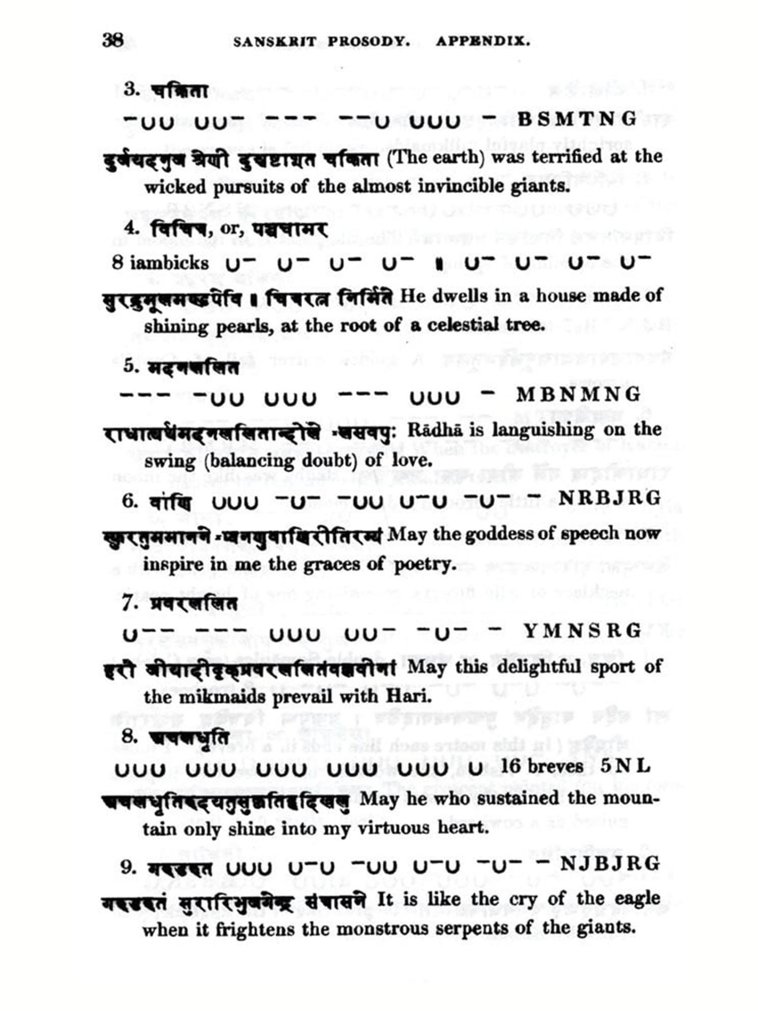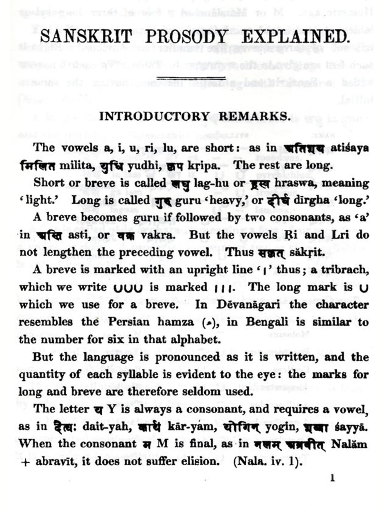 SANSKRIT LITERATURE is chiefly in verse. The poems and plays, the histories and legends, treatises on law, divinity, astronomy, mathematicks, and indeed nearly all literature being in metre. The "Prosody is easy and beautiful," says Sir William Jones. "It is infinitely more rich and more varied," observes the learned Chézy, "than that of Greek; and has no syllables of doubtful quantity." The venerable Colebrooke (Essays ii. 62) speaks of the aid it affords in de-ciphering passages rendered obscure by the inaccuracy of the transcripts: he notices that the artifice of its construction is peculiar, and not devoid of ingenuity; and it is richer than that of any other language. Yet many who have attempted the study in India, guided by a Pandit, complain that the art is intricate. Indeed most of the aspirants have been dis-heartened (as I was at first); for the Prosody is overlaid with a profusion of pedantic refinements, arithmetical and superstitious. Most of the rules in the Sanskrit Prosodies are intended to guide composers, not learners.