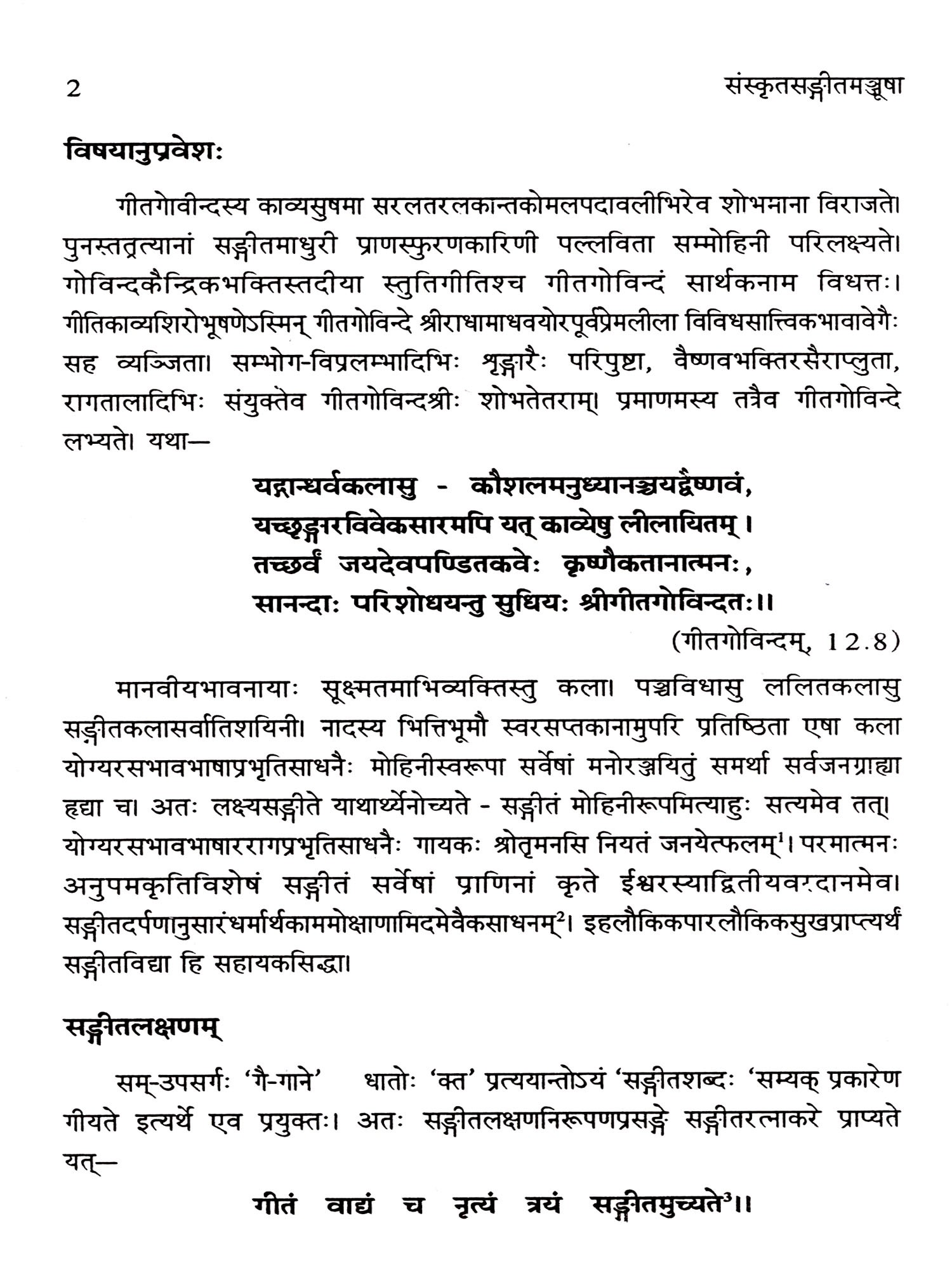 In this context, the first article, 'Gitagovinde Sangitata-ttvam' deals with the musical elements found to be present in the most popular lyric poetry i.e. the Gitagovinda of Sri Jayadev, a celebrated poet of 12th century A.D.. The term 'music' as the combination of Gita, Vadya and Nrtya, has been reflected properly in the twenty-four Prabandhas of Gitagovinda, set in various rāgas, tālas being accompanied by bādya and being supported by nṛtya. The lucidity of the expression in the love theme of Radha and Krsna and the Prabandha style of composition is very much supportive in establishing the musical elements of Gitagovinda. This paper is presented in the 45th session of AIOC, BORI, Pune, 2010 held at R.S.Vidyapeetha, Tirupati, A.P.. This paper is awarded Kamalesh Kumari Kulashrestha prize for the best performance in Classical Literature section.