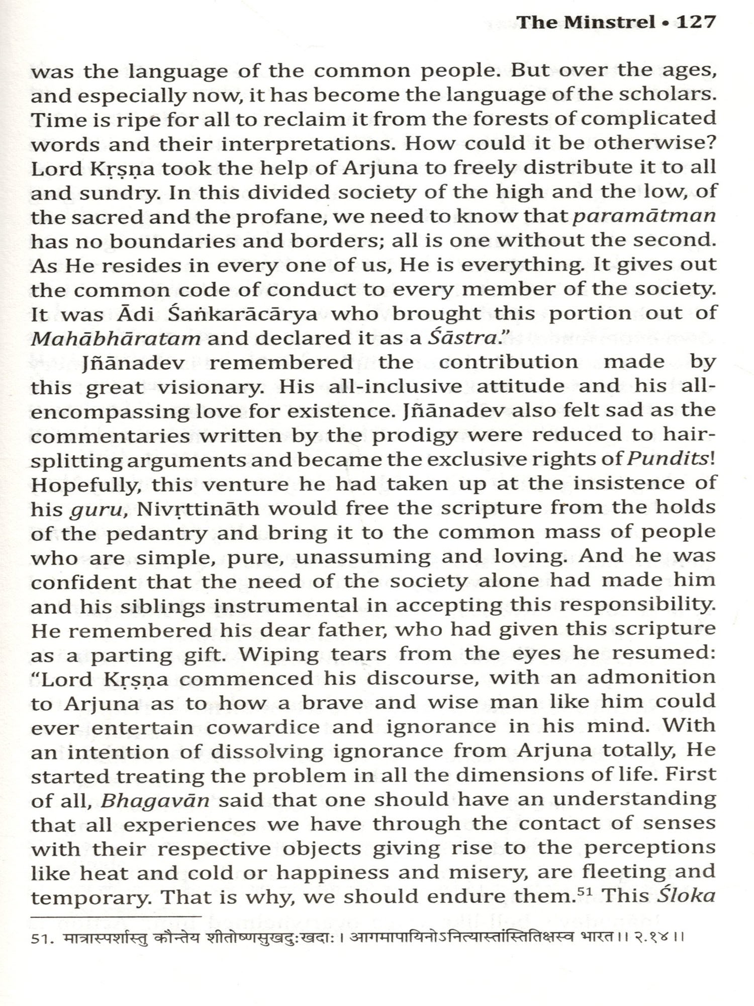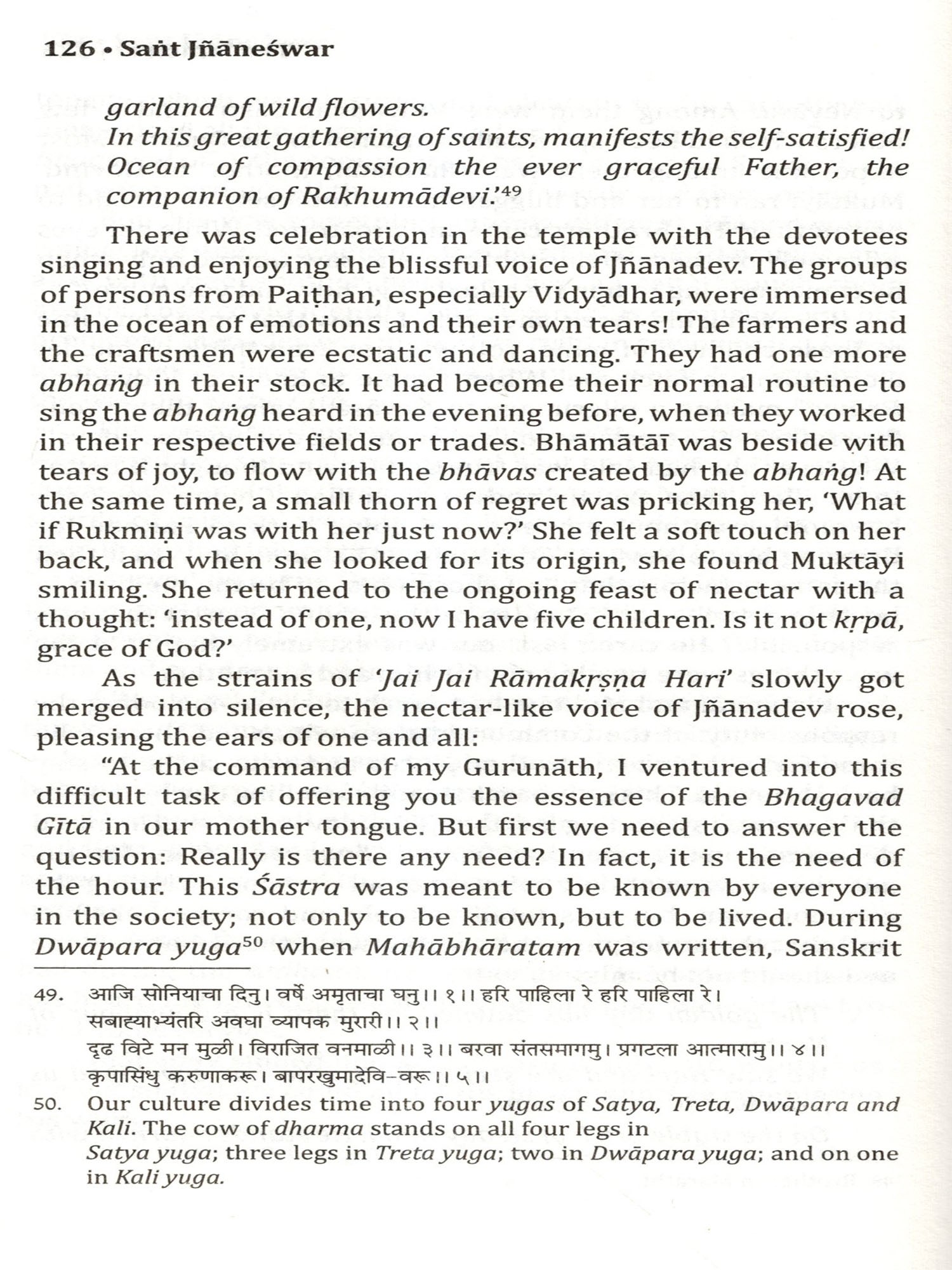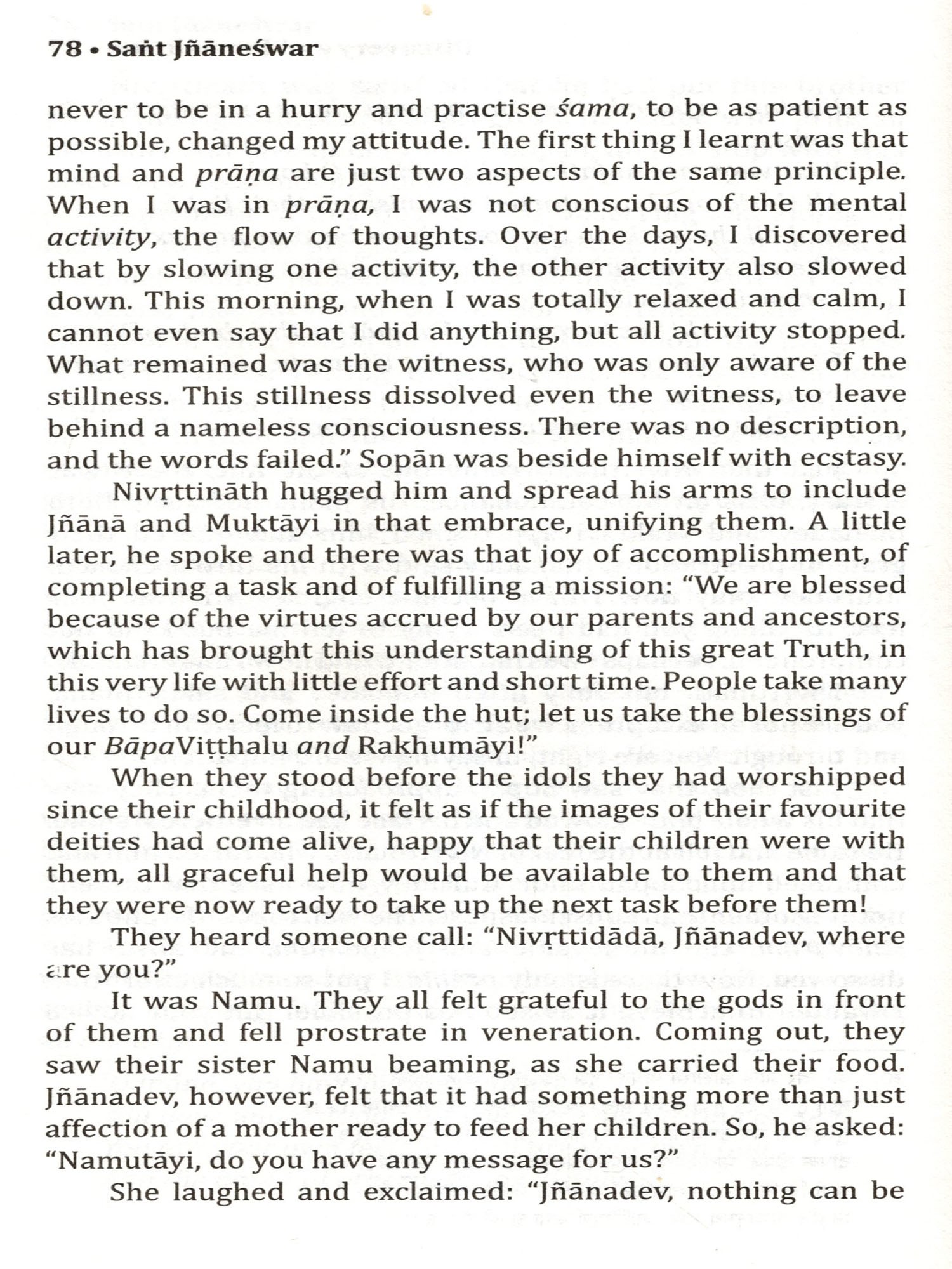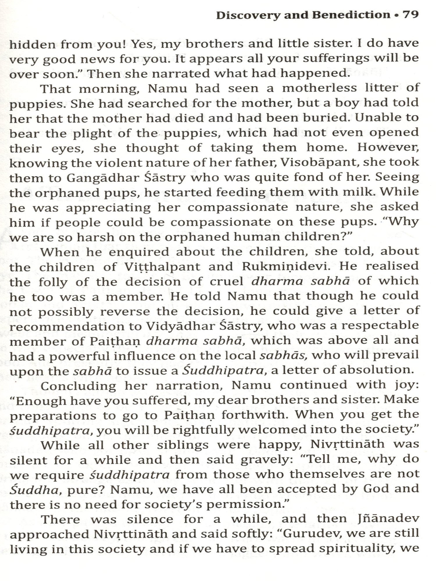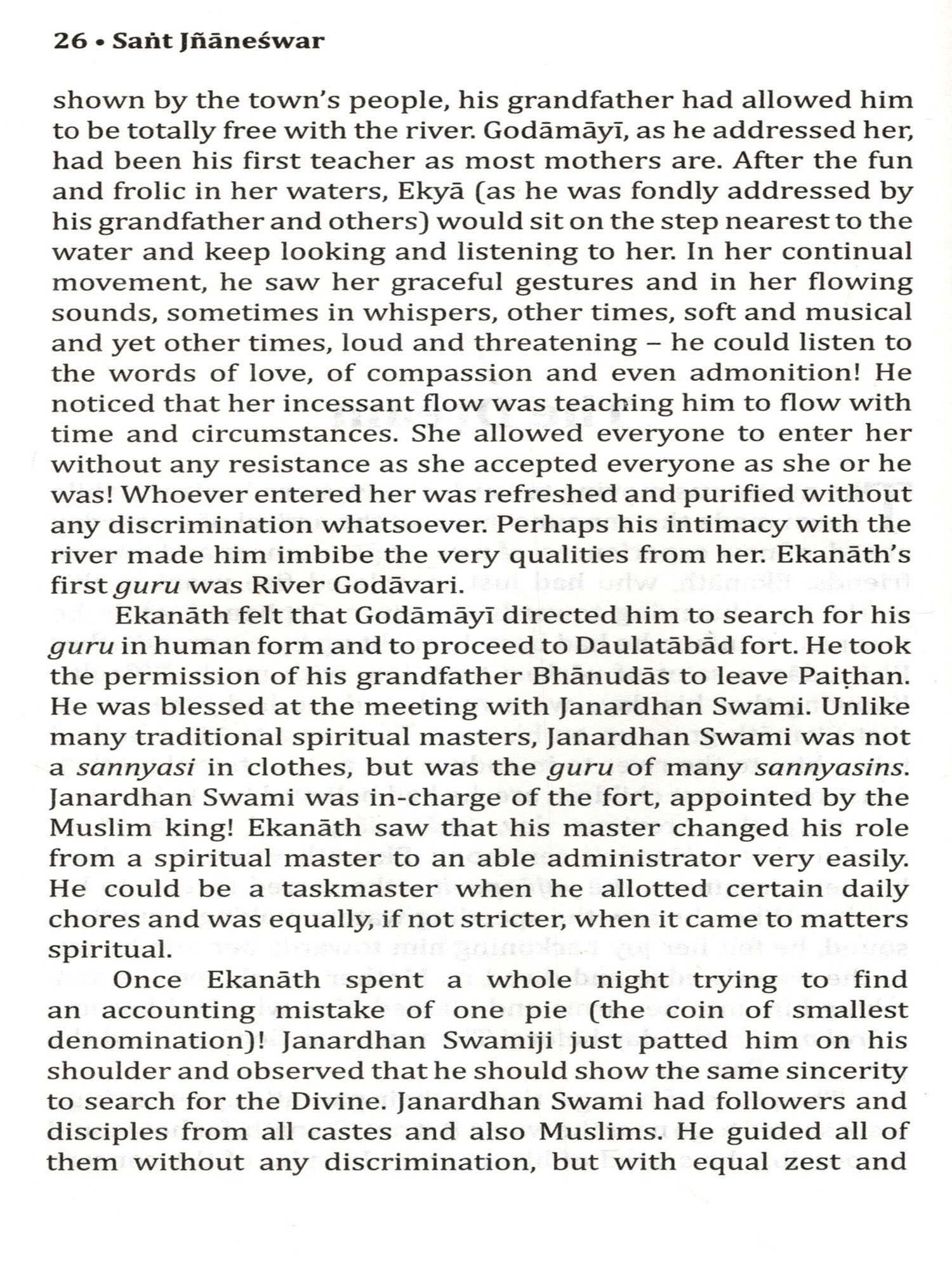 Life of Sant Jnaneswar, also known as Sant Jnanadev and his three saintly siblings Nivrttinath, Sopandev and Muktabai of the late thirteenth century forms a perfect background to understand and practice this wonderful path of Love. Though born in the community of Brahmins, they were ostracised from the society and persecuted. For their tender age, they exhibited indomitable grit not only to bear the tribulation willingly but to transform the negative feelings cascaded by the society into divine emotions of compassion and unbound love.
