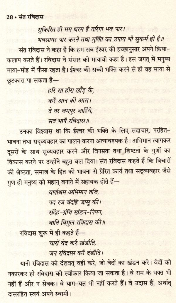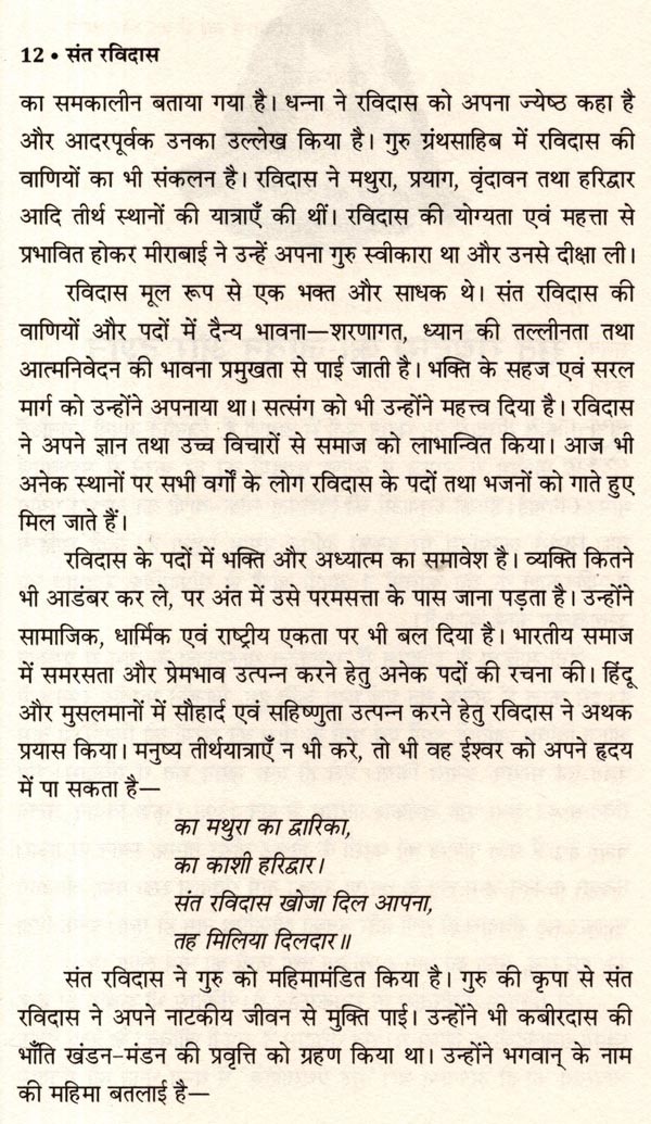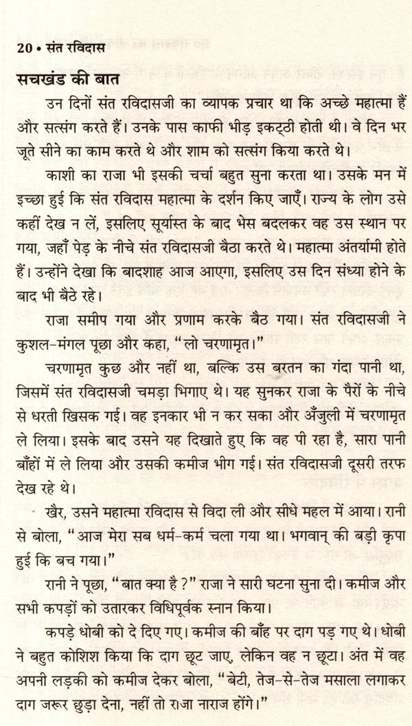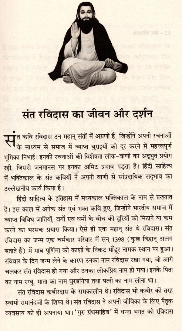 सं त रविदास प्रसिद्ध भारतीय कवि और समाजसुधारक जीवन सामाजिक न्याय और समानता के प्रति अति का प्रतीक था। उनकी रचनाएँ आध्यात्मिकता, नैतिकता और सामाजिक न्याय की पैरवी करती हैं और सभी मनुष्यों के लिए करुणा तथा प्रेम की गहरी भावना से ओत-प्रोत हैं। संत रविदास कचीरदास के समकालीन थे। वे कधीर की तरह स्वामी रामानंदजी के शिष्य थे। गुरु ग्रंथसाहिब में संत रविदास की वाणियों का भी संकलन है। उनकी योग्यता एवं महत्ता से प्रभावित होकर मीराबाई ने उन्हें अपना गुरु बनाया और उनसे भीक्षा ली। वे मूल रूप से एक भक्त और साधक थे। उनकी वाणियों और पदों में दन्य भावना, शरणागत, ध्यान की तल्लीनता तथा आत्मनिवेदन की भावना प्रमुखता से पाई जाती है। भक्ति के सहज एवं सरल मार्ग को उन्होंने अपनाया था सत्संग को भी महत्त्व दिया है। जात-पात के भेदभाव को मिटाने का महत्त्वपूर्ण कार्य उनके सरल काव्य ने किया और मानव को जीवन जीने की कला तथा मानवता का पाठ पढ़ाया। अधिक पड़े-लिखे न होते हुए भी उन्होंने समाज को जाग्रत् करने का अद्भुत कार्य किया। समरसता और समभाव का अमर संदेश देनेवाले शिरोमणि संत रविदास की प्रेरक जीवनगाथा।