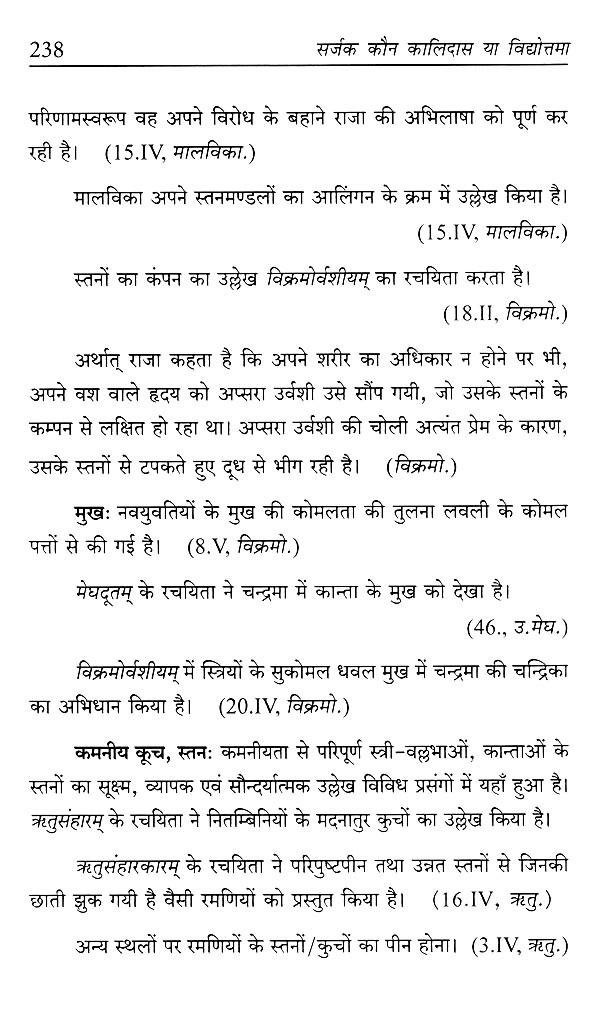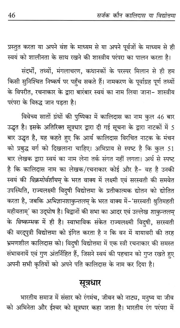 इस साहित्य का परिपाक यह स्पष्टतः संकेत करता है कि इन कालजयी ग्रंथों की रचयिता राजसी परिवेश से संवलित कोई विदुषी स्वी ही हो सकती है। यदि हम कालिदास और काशी की राजकुमारी विदुषी विद्योत्तमा के विवाह संबंधी शास्त्रार्थपरक लोक-कथा- किंवदंती को ध्यान में लाएँ, और वहीं दूसरी ओर इन सातों ग्रंथों के विशाल साहित्य के अंतः साक्ष्यों का आद्योपान्त सूक्ष्म अन्वेषण- विश्लेषण कर चिंतन करें, तब स्वतः इनका प्रमाण मिल जाएगा कि विदुषी विद्योत्तमा ही महाकवि कालिदास की सातों कृतियों की रचयिता रही हों। उन्होंने अपने पति के नाम पर साहित्य लेखन कर, स्वयं को विलुप्त करके भी अपनी सृजनात्मकता को निरन्तर अभिव्यक्त करती रहीं। स्वी-जीवन की साधनावस्था है जबकि उत्तरकाल इसकी सिद्धावस्था।