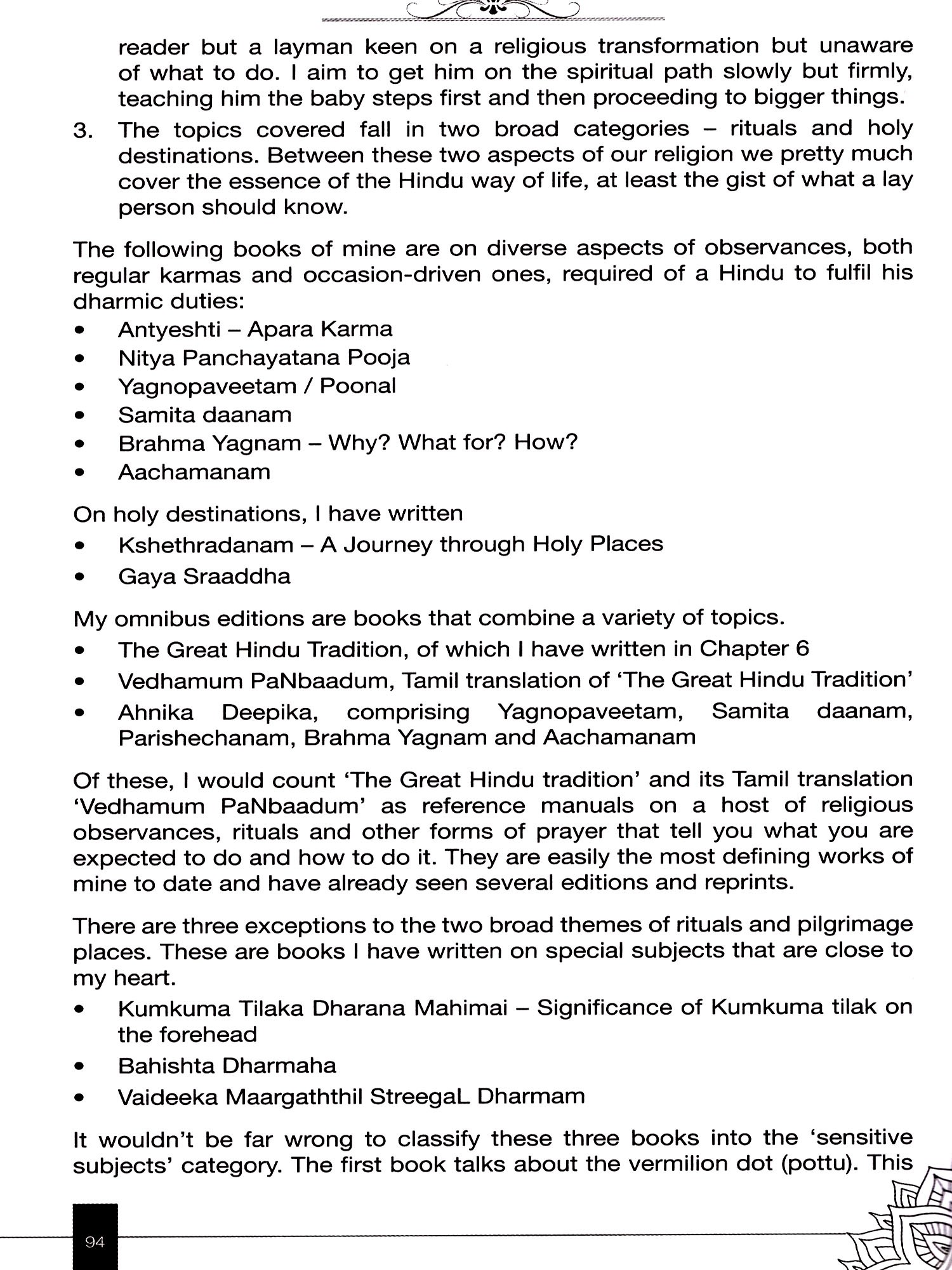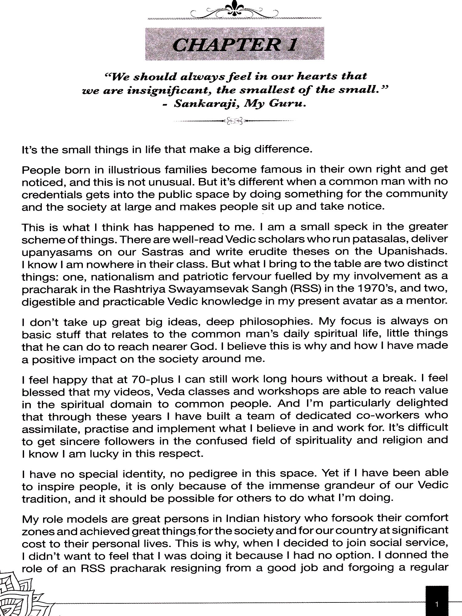 When they persisted, I realized that there were learnings from the small and big things I have been able to do, which could provoke thought and possibly action in others. I'm an educator at heart, and I saw that it was my duty to spread knowledge that could be applied. This book is the result of the same yen that made me reach out to everyone on practical aspects of our Sanatana Dharma.
