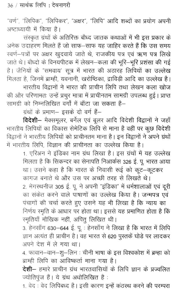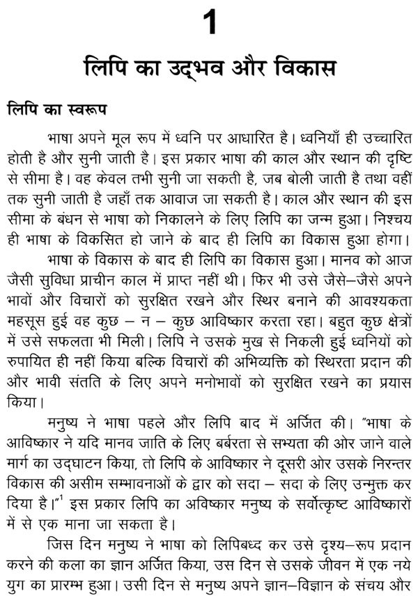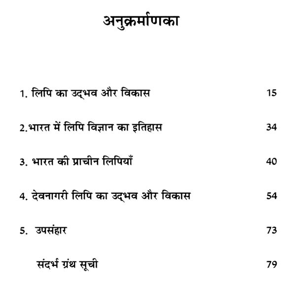 प्रस्तुत कृति के प्रथम अध्याय में लिपि के उद्भव और विकास का विवेचन है। भारत में लिपि विज्ञान के इतिहास का समग्र अध्ययन द्वितीय अध्याय में पाया जाता है। तृतीय अध्याय के अंतिम भारत की प्राचीन लिपियों को विवेचित किया गया है तथा चतुर्थ अध्याय में देवनागरी लिपि के उद्भव और विकास को प्रस्तुत किया गया है।