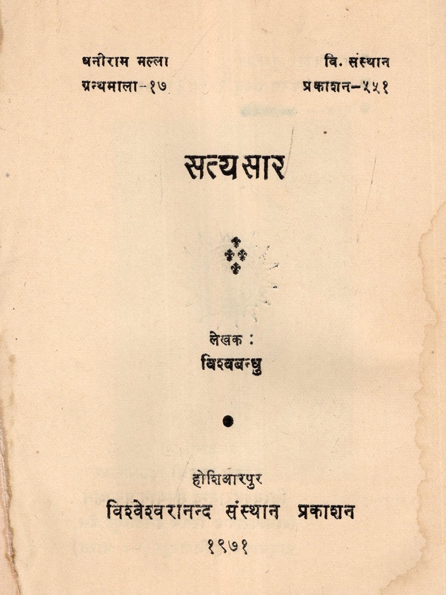 स्वर्गीय भल्ला जी की पुण्य स्मृति में अप्रैल २६, ११५२ को उनकी दुबरसी के अवसर पर 'धनीराम भल्ला ग्रन्थमाला' का आरम्भ किया गया था। उस ग्रंथमाला का यह 'सत्यसार' सतरहह्वां पुष्प है।