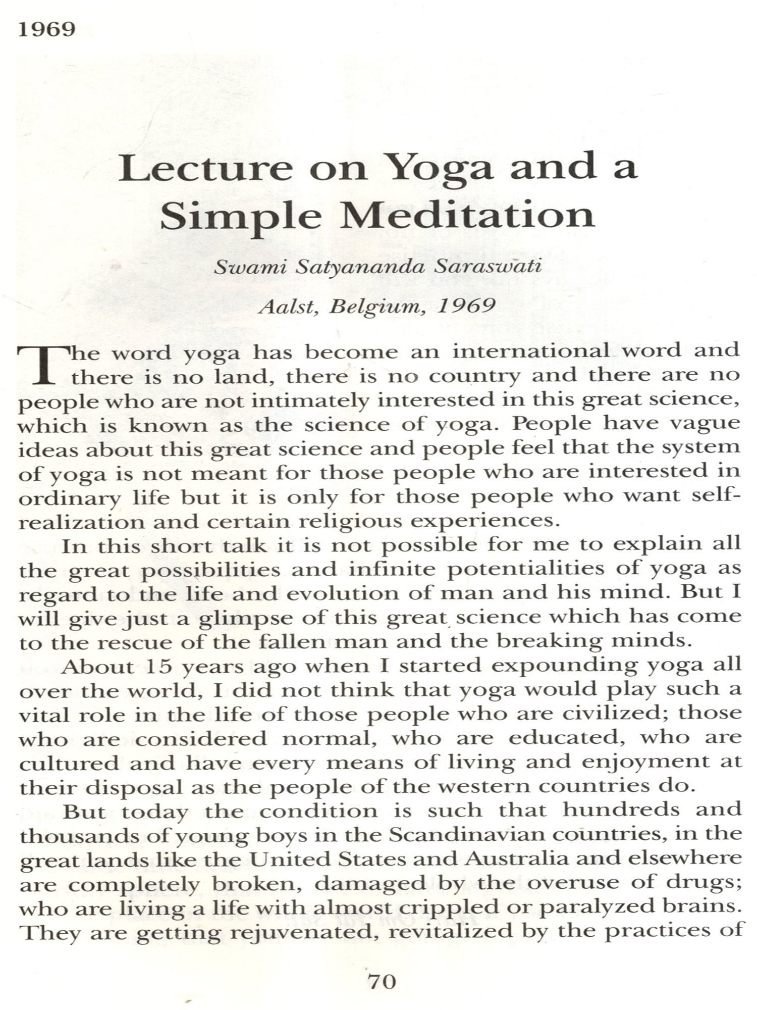 To properly understand Swami Satyananda Saraswati's contribution to yoga vidya, yogic wisdom, in the twentieth century it is important to accurately and chrono-logically exhibit Swami Satyananda Saraswati's progressive introduction, development and adaptation of traditional and classical yoga to suit the modern lifestyles of people, as well as, making yoga practices, often developed for renunciates and their lifestyles, available to householders, and hence to the majority of people leading hectic and time consuming lives, earning a living, with little time to devote to their physical, emotional, mental and spiritual needs. Thus, we have presented his theoretical and practical teaching chronologically and exactly as he introduced them over a period of fifteen years. Each year he would introduce yogic concepts and practices up to a certain depth making sure that his audience would completely understand what was involved and individuals would have sufficient time to practise what they had learned in spite of their hectic daily routines. Those who had practised what he had taught one year could easily deepen their understanding and practise as a result of his progressive teaching in the following years.