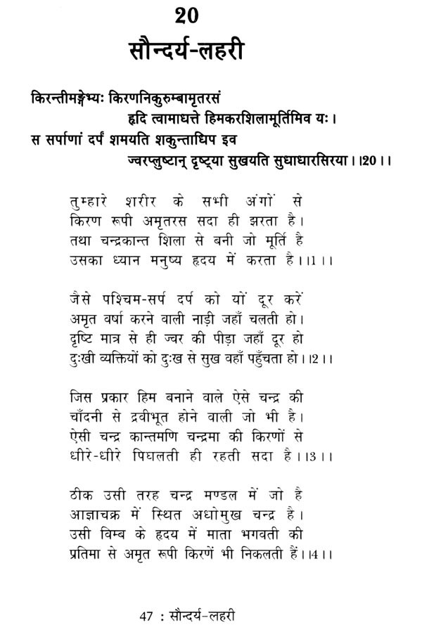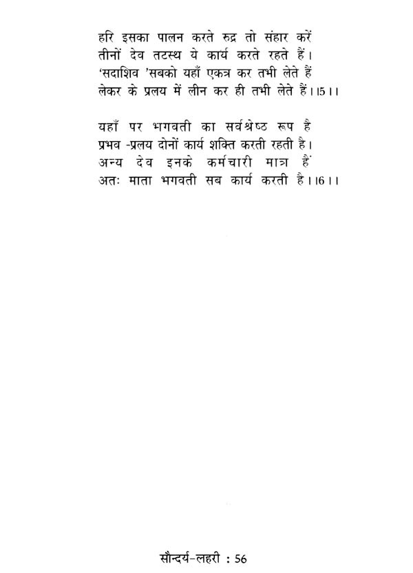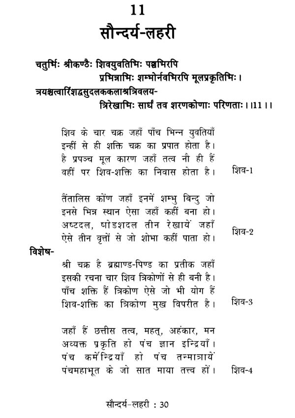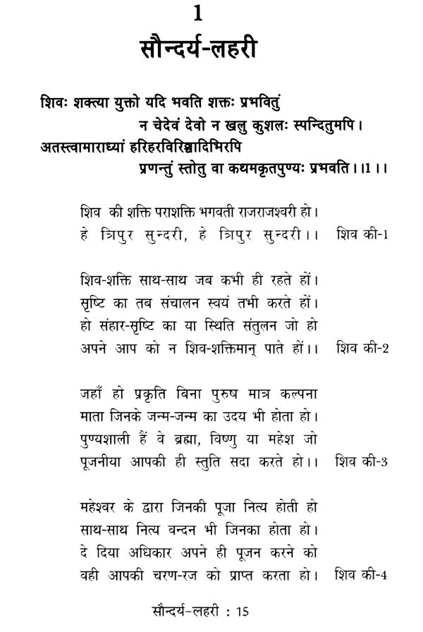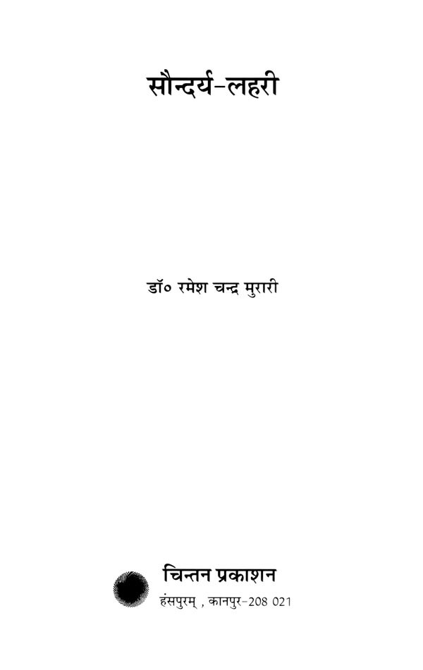 सौन्दर्य-लहरी पद्यार्थ एक धार्मिक ग्रन्थ होने के नाते सर्वप्रथम आभार उस जगत् नियन्ता परमात्मा तथा जगज्जननी उस पराम्बा भगवती का है जिन्होंने मिलकर इस जगत् में पंच महाभूतों की उत्पत्ति की। तदुपरान्त आकाश से उच्चतर उस पिता तथा उनसे दशगुणी अधिक उस माता का, साथ ही इष्टदेव, कुलदेव, ग्रामदेव, वास्तु देव, स्थान देव, समस्त गुरुओं, मित्रों, सहयोगियों, चराचर जीव जगत्, वनस्पति, पशुओं का आभार। तदुपरान्त लेखन के समय कोई व्यवधान न आने पाये, समय से भोजन मिलता रहे इस सूक्ष्म व्यवस्था का ध्यान जिनके द्वारा रखा गया हमारी धर्म पत्नी माया मुरारी जो सिंह राशि का कड़ा स्वभाव होते हुये भी समय का सदुपयोग करवाने में अग्रगण्य रही हैं।