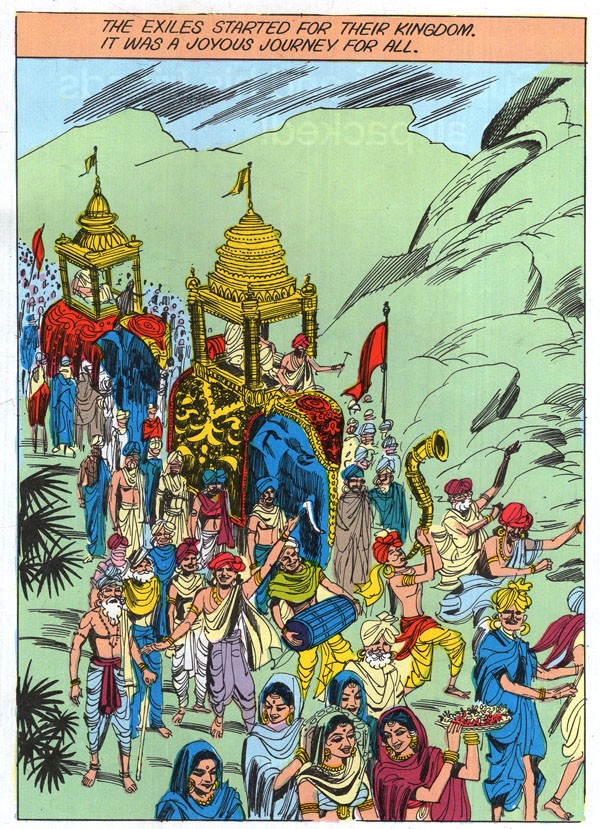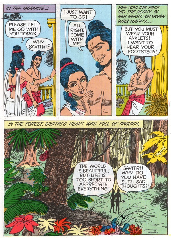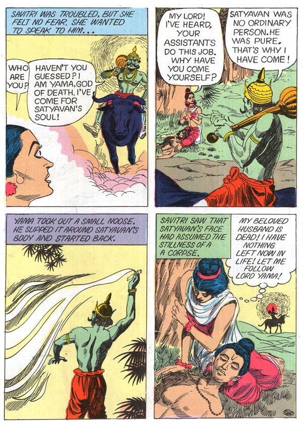 Draupadi's goodness would ultimately deliver them from their misfortunes, just as the chaste Savitri's staunch devotion to her husband Satyavan brought good fortune, not only to her parents and her husband's parents, but also to her own self. For it was her intense devotion that gave her the strength to influence the very God of Death, Yama, to release Satyavan from his clutches.