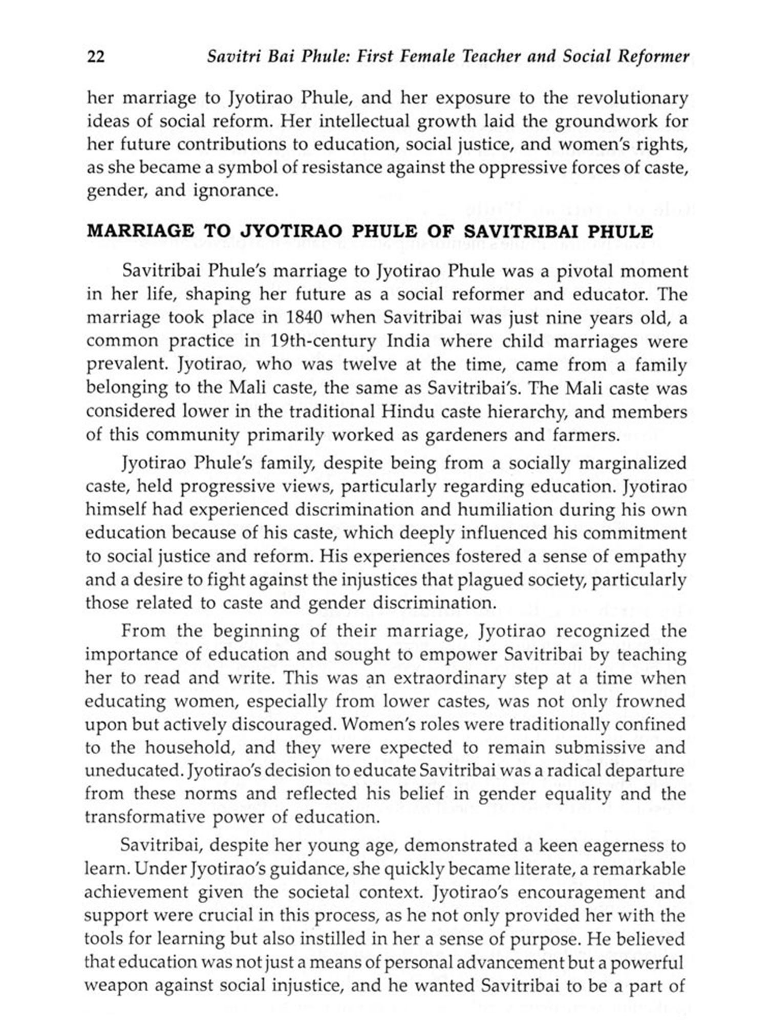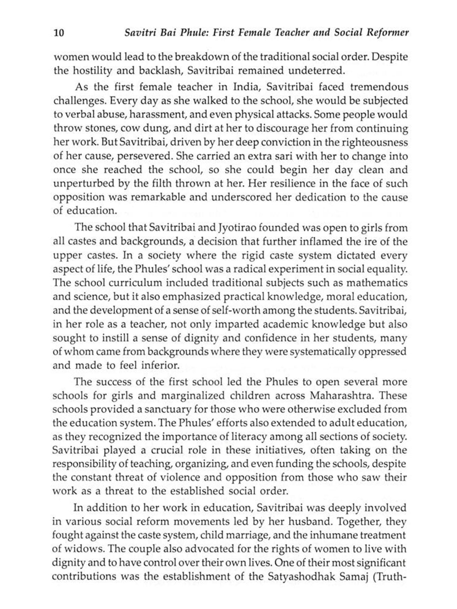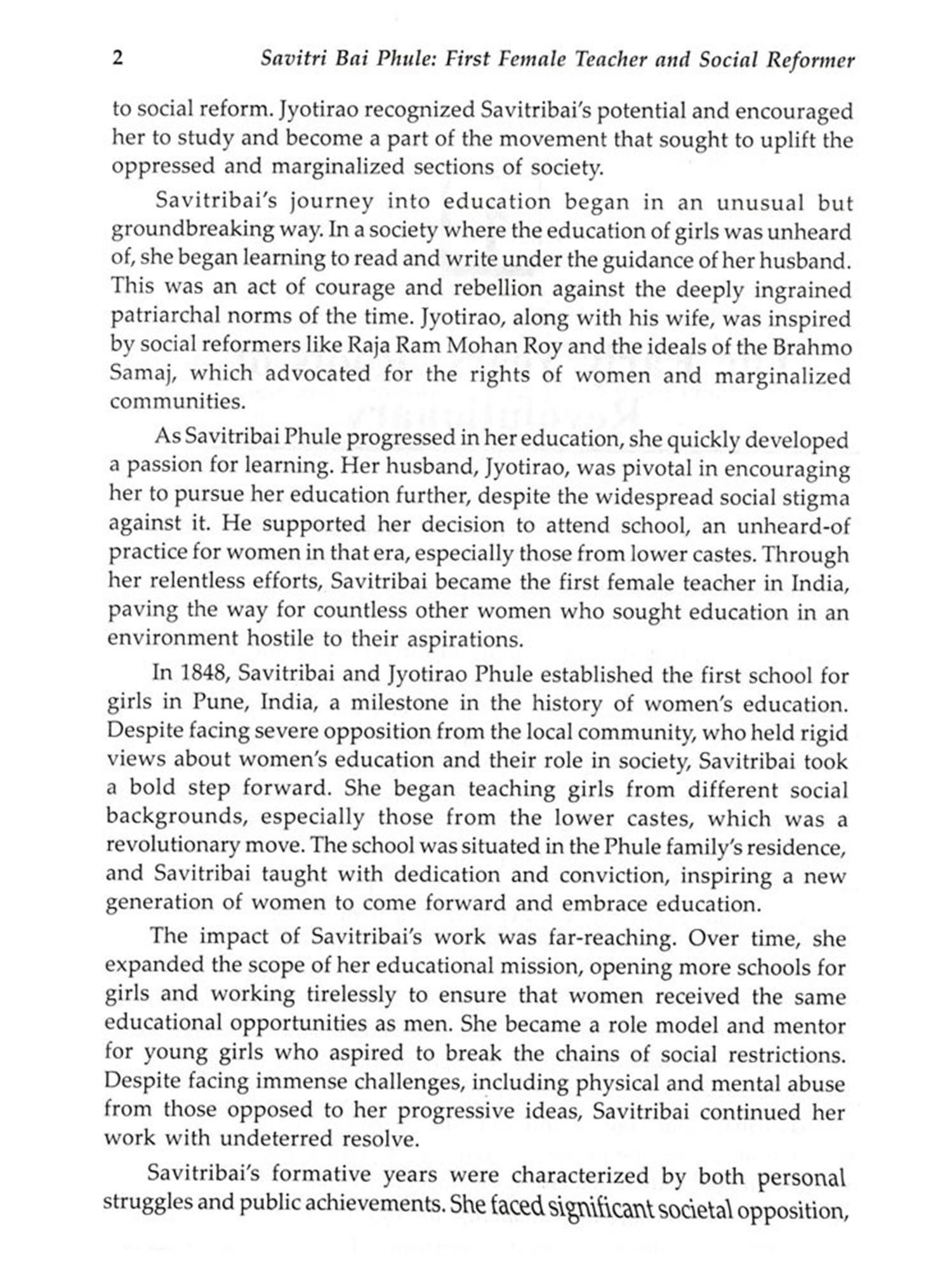 Savitri Bai Phule was born on January 3, 1831, in Naigaon, Maharashtra, into a Dalit family belonging to the Mali community, which faced severe caste-based discrimination. Despite growing up in an era where education for women, especially from marginalized communities, was unheard of, Savitri Bai showed an early interest in learning. Her husband, Jyotirao Phule, recognized her potential and educated her, defying societal norms. This foundation laid the groundwork for her future as a reformer and educator. In 1848, Savitri Bai Phule and her husband established the first school for girls in Pune, a revolutionary step in a patriarchal and caste-driven society. Savitri Bai became India's first female teacher, dedicating herself to empowering girls through education. Despite facing constant opposition, verbal abuse, and even physical threats, she persevered, recognizing education as a tool for social change. Over time, the couple established several more schools to educate girls and marginalized communities. Savitri Bai Phule not only advocated for education but also actively challenged social injustices like caste discrimination, child marriage, and the exploitation of widows. She worked tirelessly to promote equality, providing opportunities for those who were excluded from mainstream society. Her efforts extended to creating shelters for widows and victims of caste oppression, offering them a chance for a dignified life. A staunch advocate for women's rights, Savitri Bai Phule believed in the importance of creating an equal society. She encouraged widows to remarry and campaigned against oppressive practices like sati and child marriage. Through her activism, she highlighted the struggles of women, especially those belonging to marginalized communities, and provided them with platforms to voice their concerns and regain their dignity. Savitri Bai Phule was also a prolific poet and writer, using her literary works to inspire and raise awareness about social issues. Her poems, often centered on themes of education, equality, and justice, were a call to action for society to rise above caste and gender discrimination. Her writings remain a testament to her intellect and her unwavering commitment to social reform. Savitri Bai's life was one of relentless struggle and remarkable achievements. Despite facing immense challenges, she never wavered in her mission to uplift the oppressed. She continues to be celebrated as a symbol of courage. determination, and the transformative power of education. Her contributions have inspired generations of activists, educators, and reformers to fight for an inclusive and equitable society. Savitri Bai Phule's legacy is a reminder of the power of education and social reform in breaking down barriers of caste and gender. She and her husband Jyotirao Phule laid the foundation for many progressive movements in India, paving the way for a more just and equal society. Today, she is remembered as a trailblazer whose work transcended her time, leaving an indelible mark on Indian history and continuing to inspire efforts toward social justice and equality. This work explores the inspiring journey of Savitri Bai Phule, shedding light on her relentless fight against caste and gender discrimination to transform Indian society through education and empowerment.