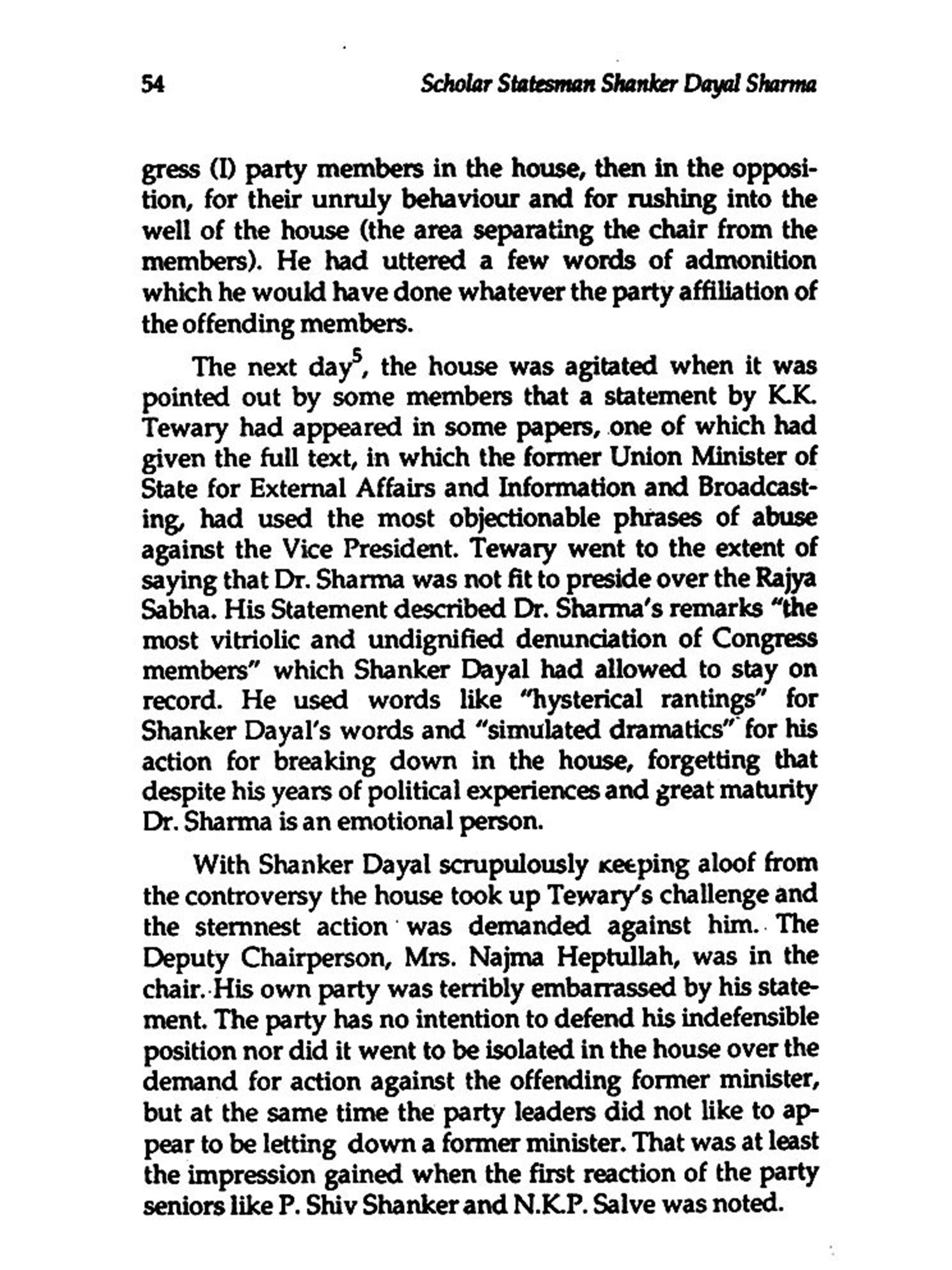 Fortunately, a number of persons who have watched him at different stages in his career and had known him at close quarters, were willing to talk. Among them I should mention Mr S. Jaipal Reddy, former leader of Opposition in the Rajya Sabha and now leader of the Janata Dal in the House, and senior journalist, Mr K.P. Srivastava. Mr Reddy's observations were pertinent in assessing the role of Dr Sharma as Chairman of the Rajya Sabha, a major chapter in his life. Mr Srivastava had known Dr Sharma while he was posted as PTI correspondent in Bhopal when Dr Sharma's star was just rising. Srivastava later kept contacts with him in Delhi.