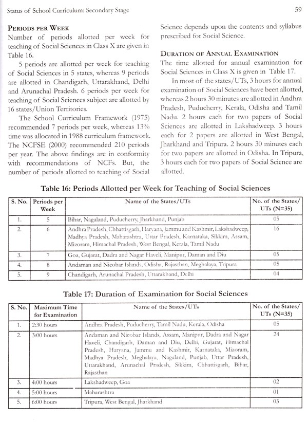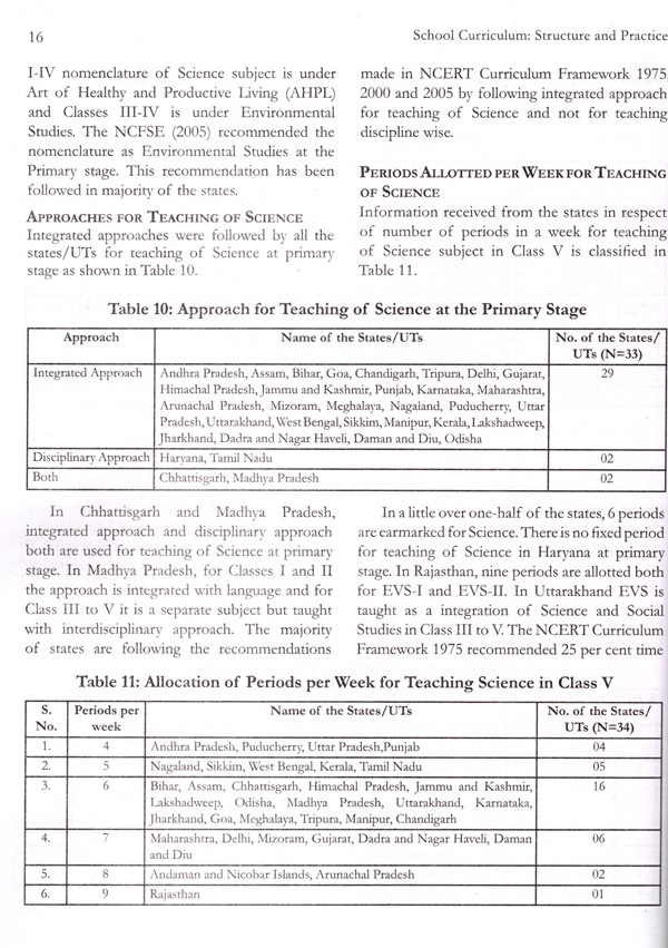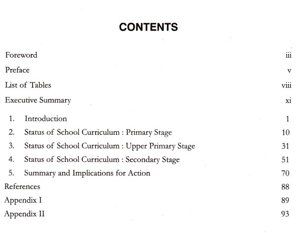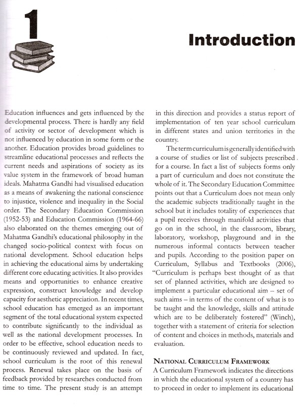 Changes occur regularly in the social, political and economic order and it becomes a challenge before curriculum framers and developers to assimilate and absorb new changes to meet the aspirations of the people. It means curriculum development is not a one shot affair but a continuous and on-going process. The NCERT took up the responsibility of developing the school curriculum in 1975. The document entitled "The Curriculum for the Ten Year School-A Framework" recommended stage wise objectives of general education, subject wise instructional objectives and content, methodology of traching, instructional aids and material evaluation and feedback and implications for implementation. In 1977, Ishwar Bhai Committee reviewed the Ten Year School Curriculum. In 1988, National Curriculum for Elementary and Secondary Education A Framework, was revised based on the National Policy on Education (NPE) 1986. In 2000, the National Curriculum Framework for School Education (NCFSE) was brought out on the basis of new emerging issues and concerns. The document includes context and concerns, organisation of curriculum at elementary, secondary and higher secondary stages, evaluation and management of the system. It was again reviewed during 2005 to respond to the new developments like curriculum load, tyranny of examination, commitment to universalination of elementary education etc. NCERT developed NCF with the help of National Steering Committee and 21 Focus Groups. These Focus Groups developed the position papers. The NCF 2005 was approved by Central Advisory Board of Education (CABE) in September 2005. As mentioned above, curriculum development is a cyclic process, it requires regular feedback through different sources including research studies for its revision and updating from time to time. This study is an attempt in this direction. It focuses on the status of the ten-year school curriculum in the country. The data was analysed separately for primary, upper primary and secondary stages, and presented in three chapters.