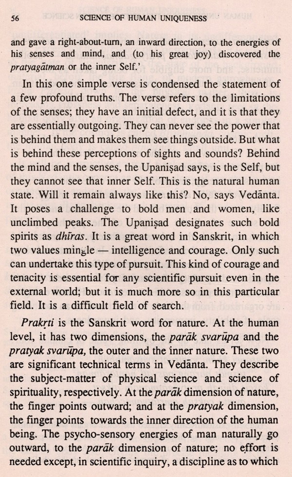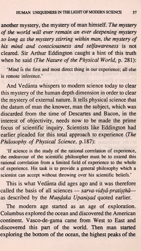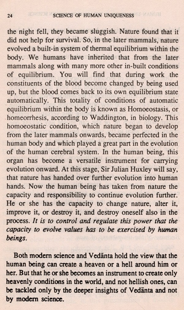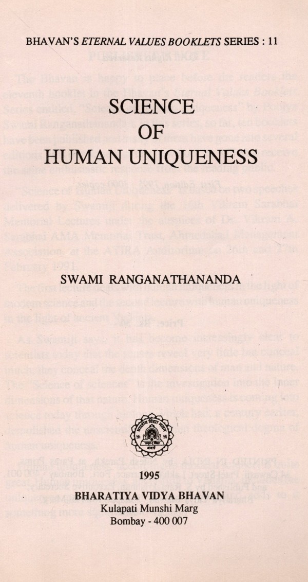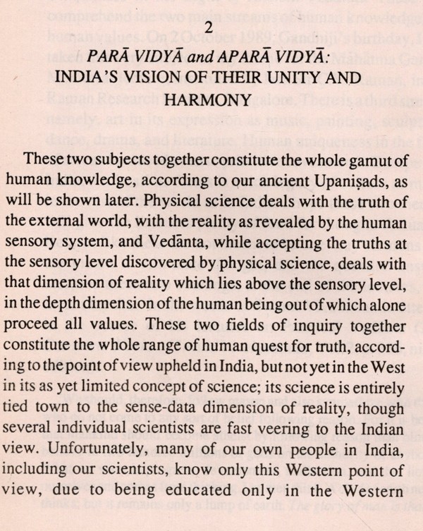This is about the tenth time that I visit Ahmedabad, the first time in 1944 from Karachi; during these visits, on invitations, I have gone on lecture tours to many towns and cities in Gujarat. The present invitation has come from Dr. A.H. Kalro, Chairman, Dr. Vikram A. Sarabhai Trust of the Ahmedabad Management Association, asking me to deliver the Vikram Sarabhai Memorial Lectures this year. I have not met Dr. Vikram Sarabhai, but I am acquainted with his great contribution to Indian science. I have also heard of his great qualities of head and heart from his distinguished mother, whose guest I was on one of my Ahmedabad visits and who organized my lectures in the city, and from his highly gifted wife, Srimati Mrinalini Sarabhai; from the latter I heard of Dr. Sarabhai's interest in religion and art, apart from science. These factors, coupled with my love for the culture of the people of Gujarat, made me immediately accept Dr. Kalro's invitation, even though I have been advised by my doctor to cut down on these tours and lectures. Keeping in view the wide interests of Dr. Sarabhai, I have chosen two themes for these memorial lectures: Human Uniqueness in the Light of Modern Science and Human Uniqueness in the Light of Ancient Vedanta. These two comprehend the two main streams of human knowledge and human values. On 2 October 1989, Gandhiji's birthday, I had taken this very subject as my theme for the Mahatma Gandhi Memorial lecture, instituted by late Sir C.V. Raman, in his Raman Research Institute, Bangalore. There is a third stream, namely, art in its expression as music, painting, sculpture, dance, drama, and literature. Human uniqueness in the field of art can be traced even to primitive cavesmen in Europe and India. Art in all its forms is a rich legacy of culture as much in the rest of the world as in India. I hope these two themes will give the listeners plenty of food for thought. Actually, lectures like these are not meant to be one-way sermons but are meant to stimulate thought, and the question-answer sessions these two evenings, at the end of the lectures, are meant for that.
