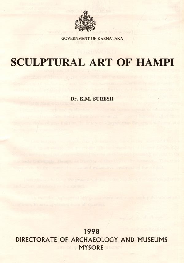 The Directorate of Archaeology and Museums has taken up excavation, conservation and research at the great mediaeval capital city Hampi (Vijayanagara) under Hampi Resurrection Project. Several publications have been brought out under this project. In addition to this the Directorate has published four volumes of "Vijayanagara Inscriptions" in Karnataka and "Vijayanagara Temples in Karnataka", edited and authored by other scholars. Now the Directorate feels happy to place before the scholars "Scuptural Art of Hampi" by Dr. K.M. Suresh. This volume contains a discussion on vide range of religious sculptures at the capital. I congratulate Dr. K.M. Suresh for this commendable work.