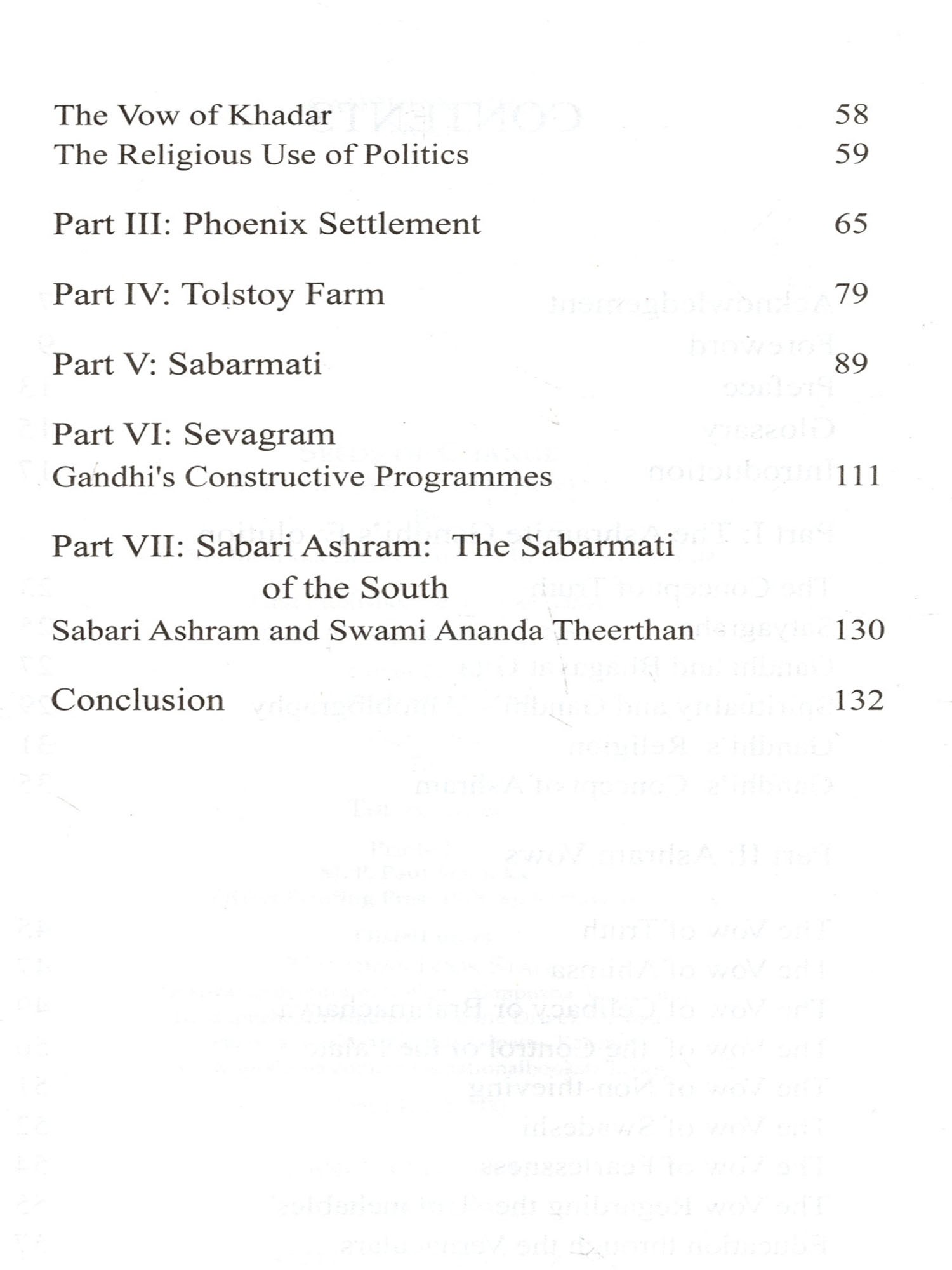 My interest in four major Gandhi Asrams, the subject matter of this book was aroused in the first instance, when I was given an opportunity to become a part of 'Sabari Ashram', Palakkad, founded in 1922 by T. R. Krishnaswamy after the model of Sabarmati Ashram, the first Ashram in India founded by Gandhi in 1915. The study I am engaged in here, is the result of reflection, over twenty five years.
