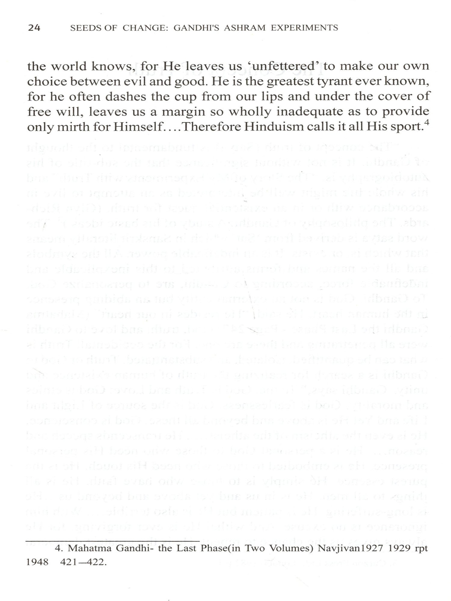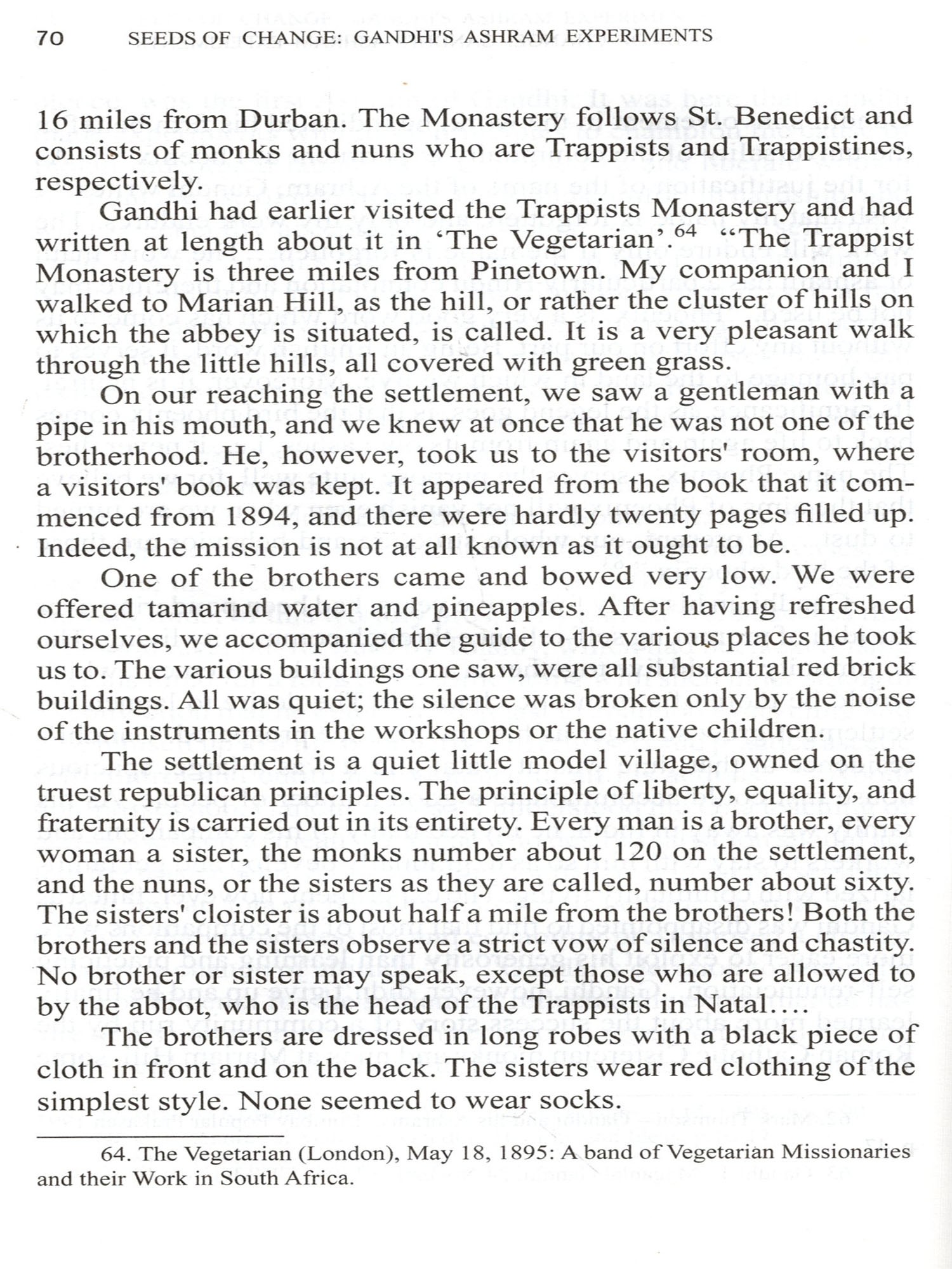 In making a brief study of the Gandhi Ashram, I intend to indicate 'avant garde' nature of Gandhi's Philosophy and world vision, which evolved from the Ashram life and how we can find the seeds of change enshrined in these Ashrams.