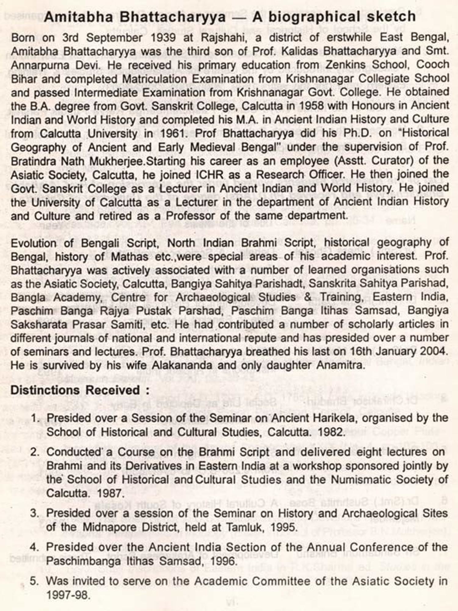 Professor Amitabha Bhattacharyya passed away on 16th January 2004 after a period of prolonged illness. In his death, we have lost one of the most dependable scholars on the textual and inscriptional sources on ancient and early medieval India. Professor Bhattacharyya was not a prolific author. He set for himself a rigorous academic standard. His writings bear the stamp of originality and meticulous attention to subtle details. Six essays presented here represent a segment of Amitabha Bhattacharya's fine and mature scholarship.