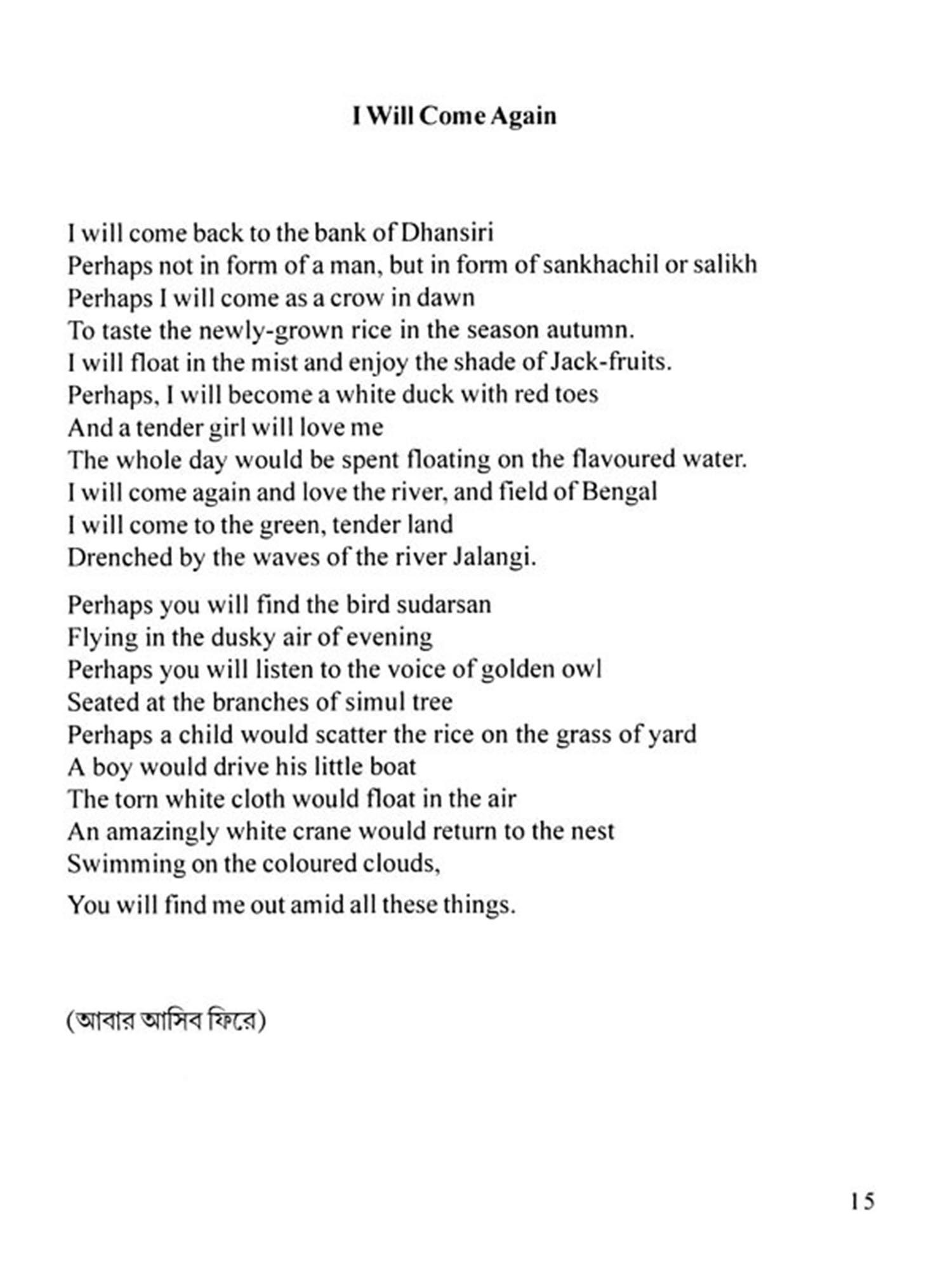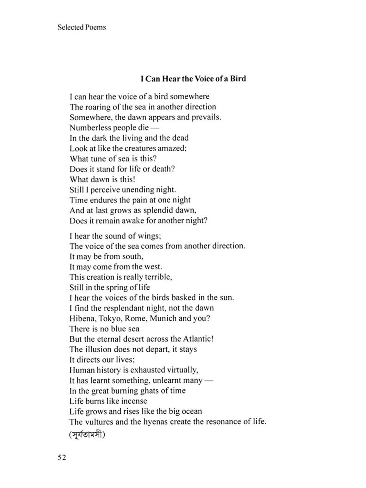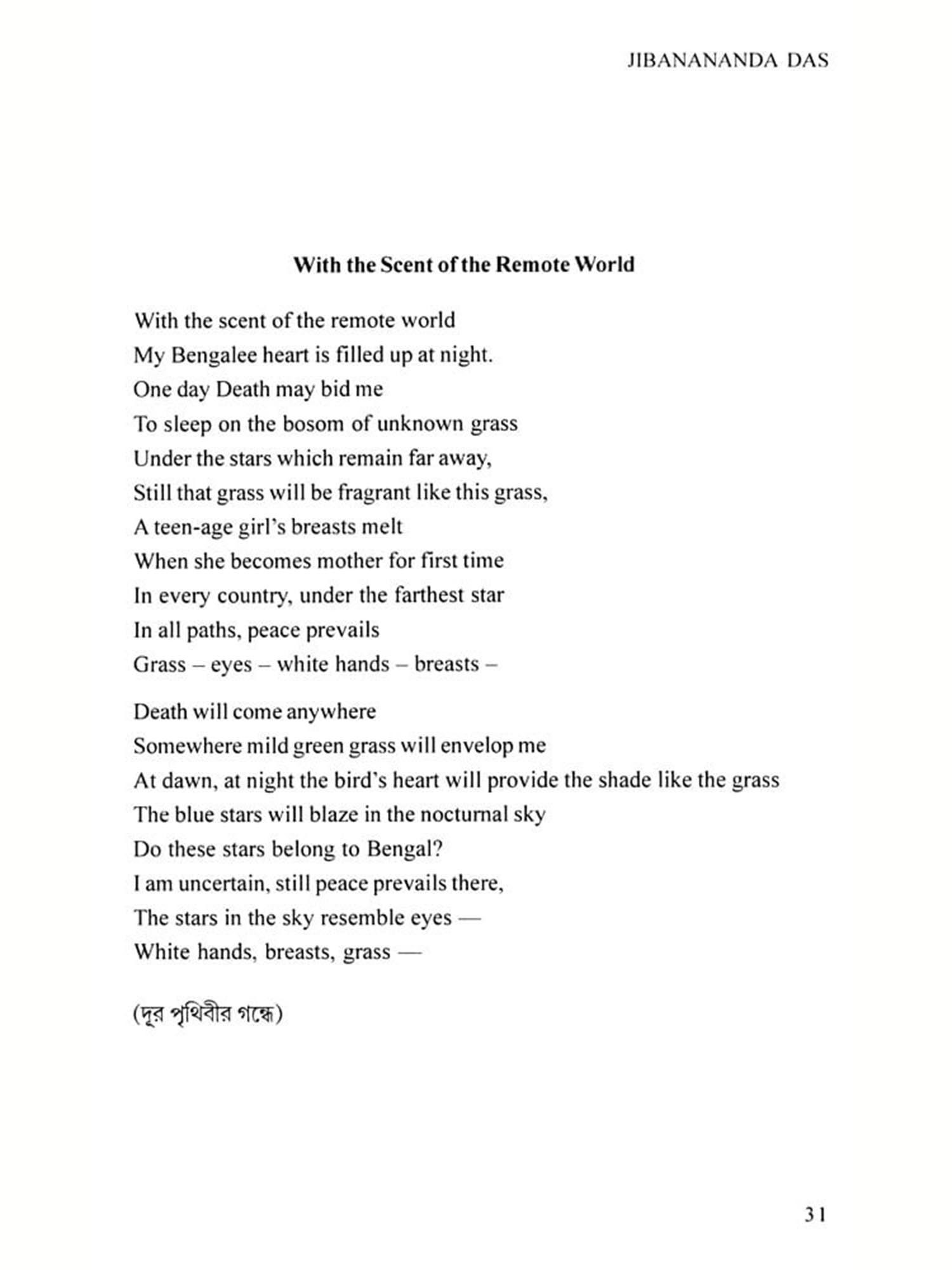 Like many great poets Jibanananda Das was not honoured during his span of life. At present, people having some love for Bengali literature believe that he was the most remarkable poet after R. N. Tagore. In fact, his originality in comprehending the universe had made him different and difficult. His soul was fundamentally romantic, though often it was morose and depressed like the sun rays in autumn. His poetical language has been unique and inimitable. A sense of suppressed melody and slow pace of words mark his fundamentally different diction. It intoxicates like a potent drug and unlocks the heart like a mysterious mantra. It is magically marvelous. It is really difficult to translate such a poet who had complex and refined sensibility. Still Dinabandhu Ghosh having deep attachment to Jibanananda's poetry has ventured in this regard.
