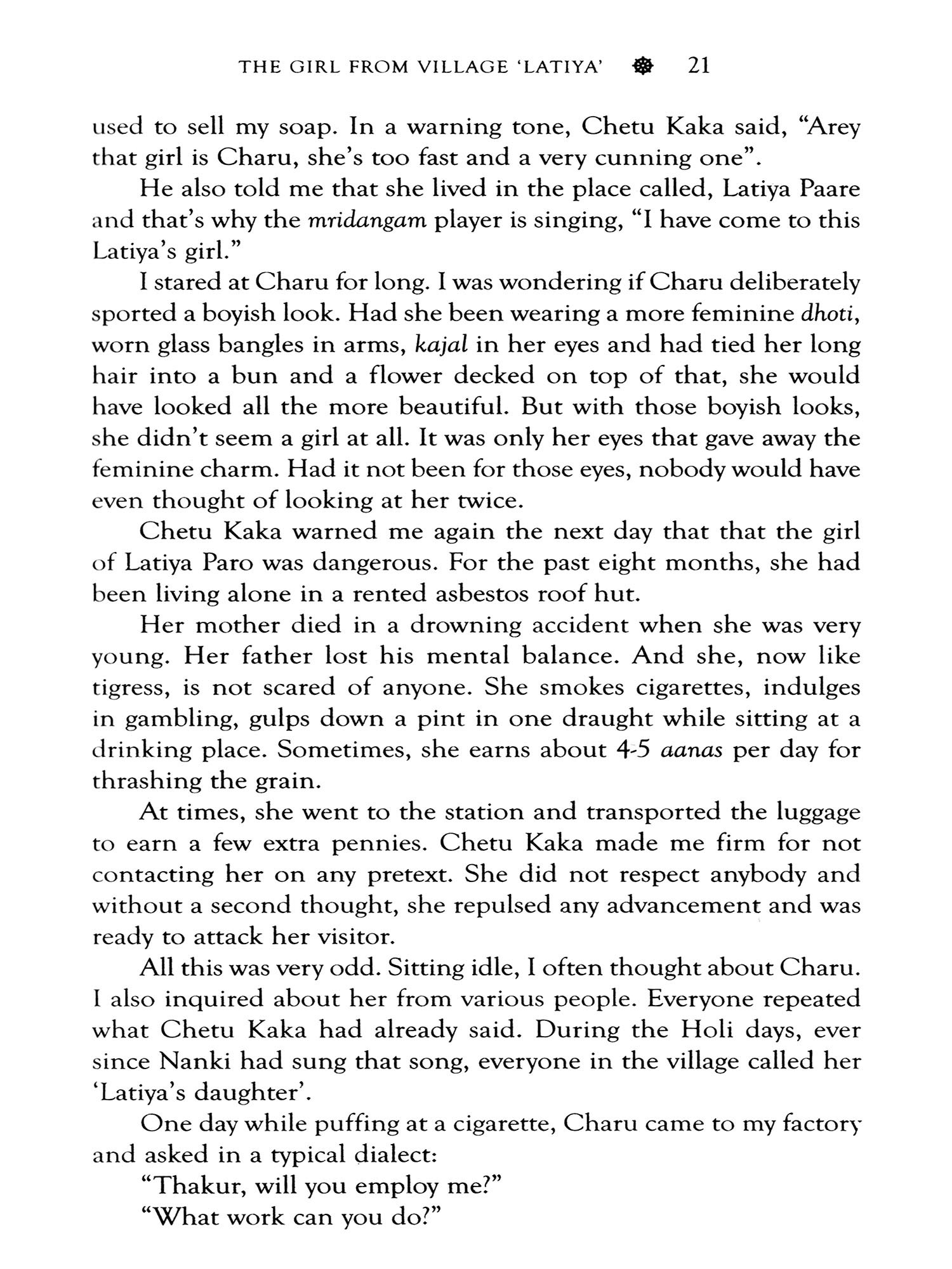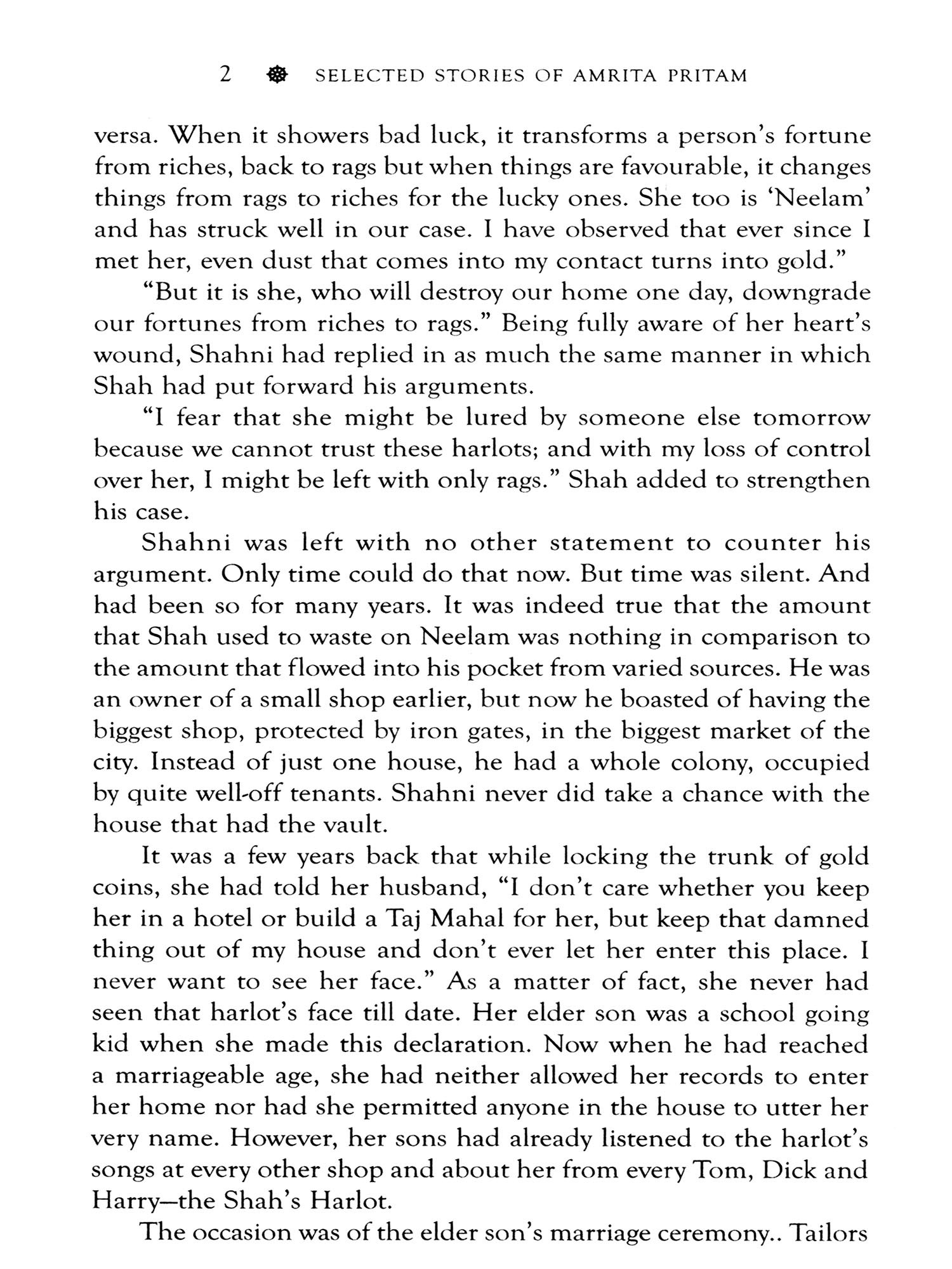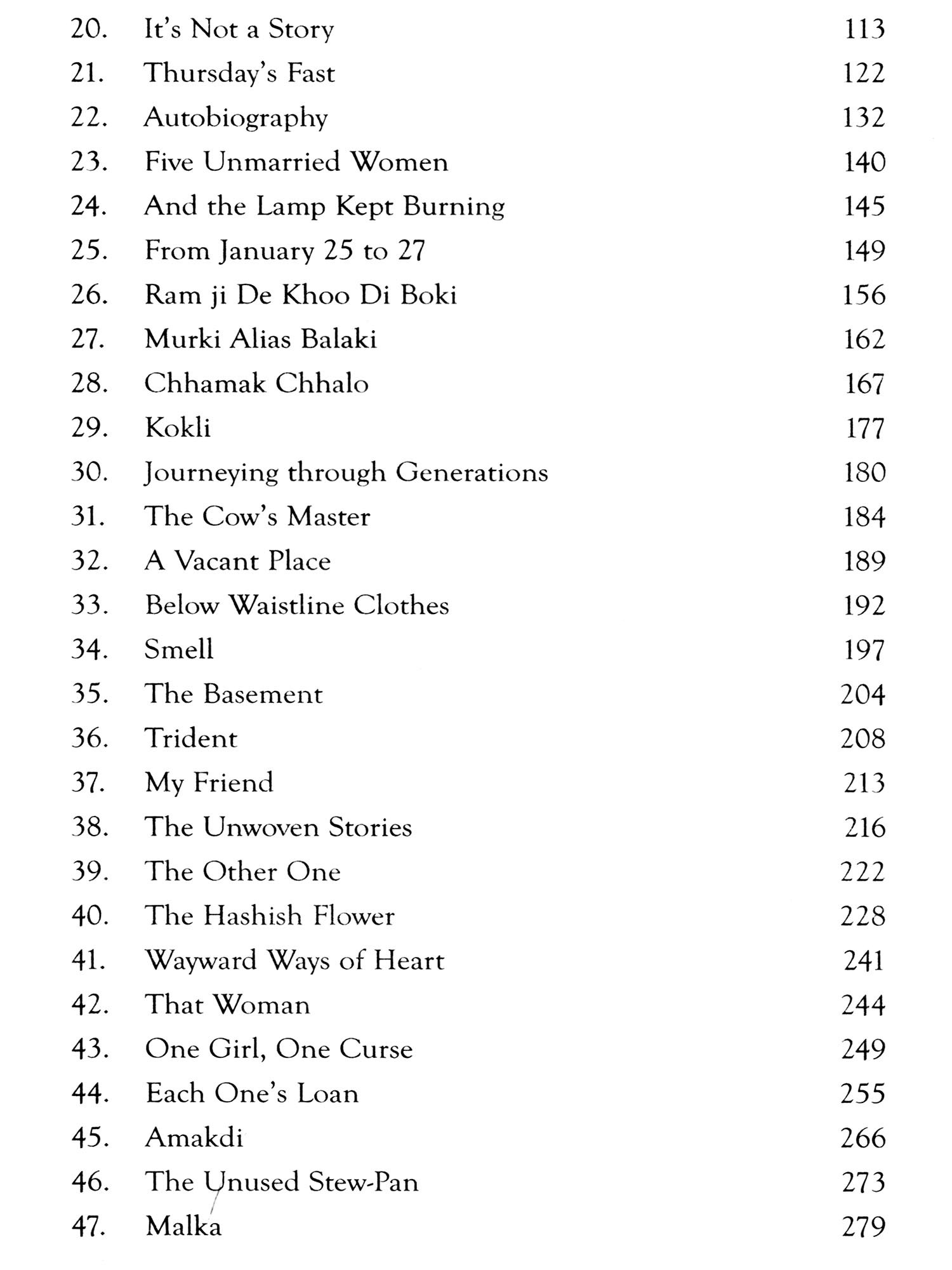 All her stories strongly present the viewpoint of a woman. One can observe this in 'Shah di Kanjri' (The Shah's Harlot), 'Murabbean Wali' (The Landlady), 'Teesri Aurat' (The Third Woman), 'Bhabhi Morni', 'Latiya di Chhokri' (Girl from Village Latiya), 'Guliana da Khat' (Guliana's Letter), 'Chhiti Dhoti Zari da Kafan' (White Dhoti, Silken Shroud), Murki urf Balaki' (Murki alias Balaki), 'Oh Aurat' (That Woman), 'Chhamak Chhalo', 'Monalisa Number Do' (Monalisa number two), 'Kokli', 'Punje Kunwarian' (Five Unmarrried Women) and many other titles that have in common a female character as the protagonist.