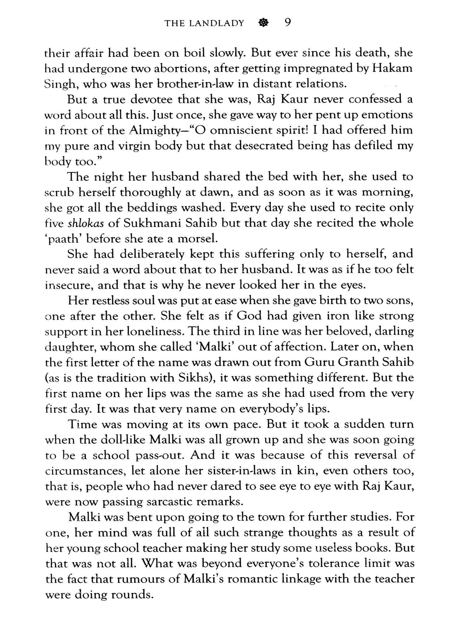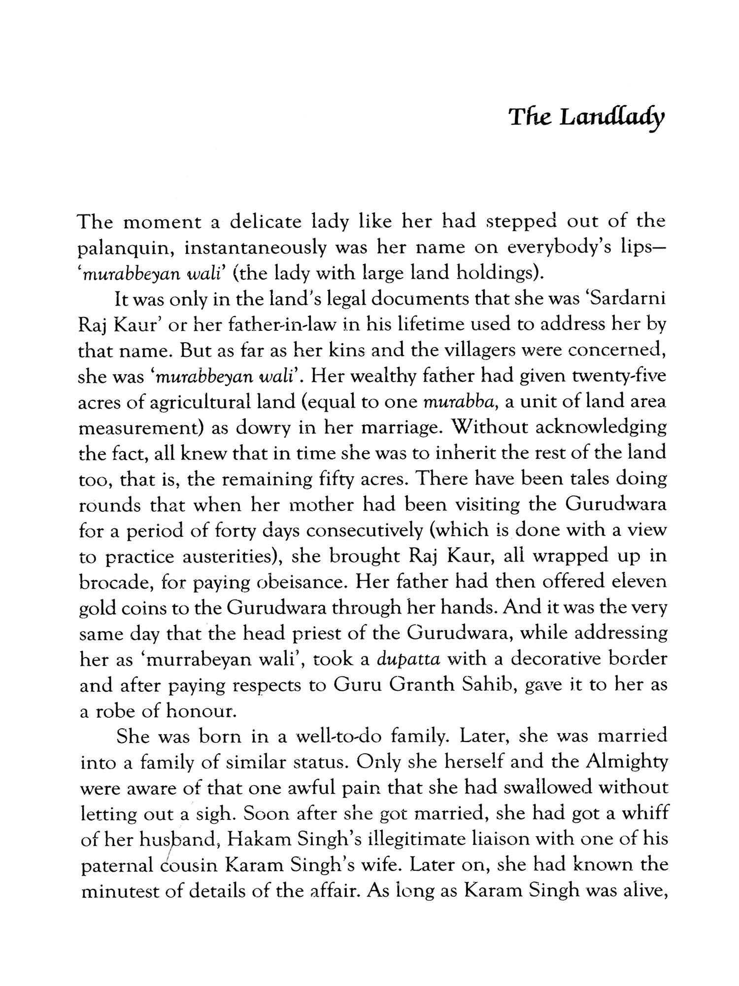 The women characters in stories like 'Shah di Kanjri' (The Shah's Harlot), Murabbean Wali' (The Landlady), 'Ik Hauka' (A Sigh), 'Ik Haneri Guthh' (A Dark Corner), 'Kameen' (Labourer), 'Ram ji de Khooh di Boki'(Leather Bucket of Ram ji's Well), 'Chitti Dhoti Zari da Kafan' (White Dhoti, Silken Shroud) etc. are the owners of a well-to-do household. But even if money can buy all the facilities of life, can it give peace to the mind and heart's contentment too? Inspite of being lucky enough to enjoy all the luxuries of life, these women suffer and stay the same for their whole life. Moreover, belonging to a rich family does not allow them to vent their grief and they are left boiling at heart. Although 'Murabbean wali' enjoys a good financial status both on the side of her parents as well as her in-laws, yet because of her husband being vicious, she undergoes pain and struggles with herself. Even her daughter is met with the same fate. While trying to keep the honour of their father intact, she begins to stand in guard of their husband. But later on, Murabbean wali's granddaughter Sahiba chooses a boy from another caste, who is her classmate, saying that she loves him. Also, she has risen above class distinctions because of education. While on the one hand, Sahiba's paternal cousins are all ready to kill her to save the family honour, 'Murabbean wali' takes a bold decision and sides with her granddaughter saying that if she loves him, she must invite him here. She is even ready to get Sahiba married to him because finally she doesn't want her granddaughter to suffer the way her daughter did. Sardarni Raj Kaur ('murabbean wali') tells her granddaughter, "Listen girl! If you have made up your mind, then have your say otherwise you'll be left simmering like the cowdung cakes on fire for the rest of your life." This is indicative of change.
